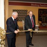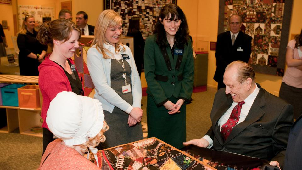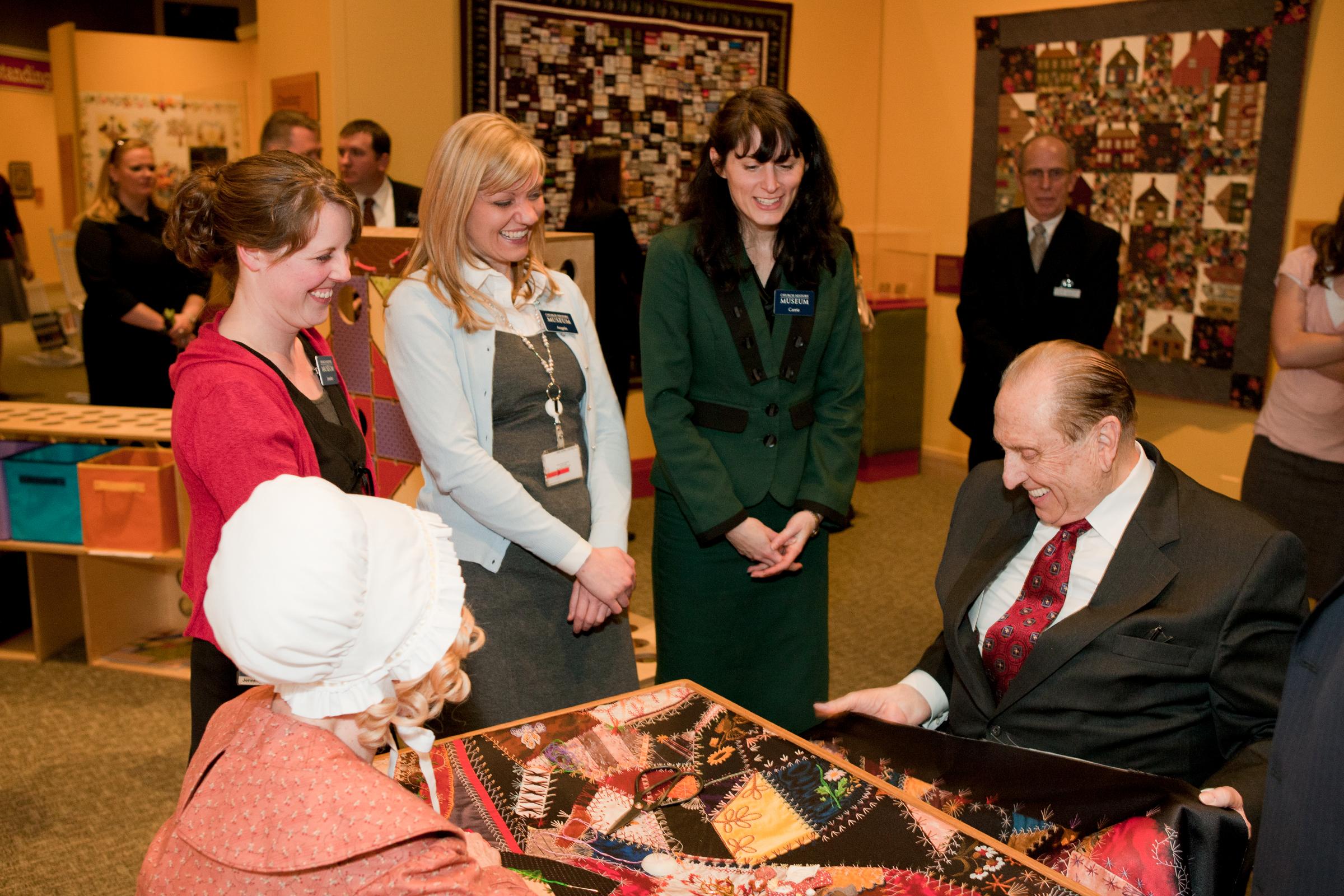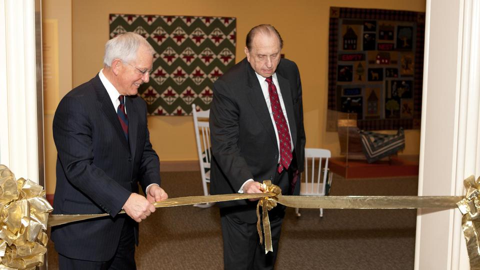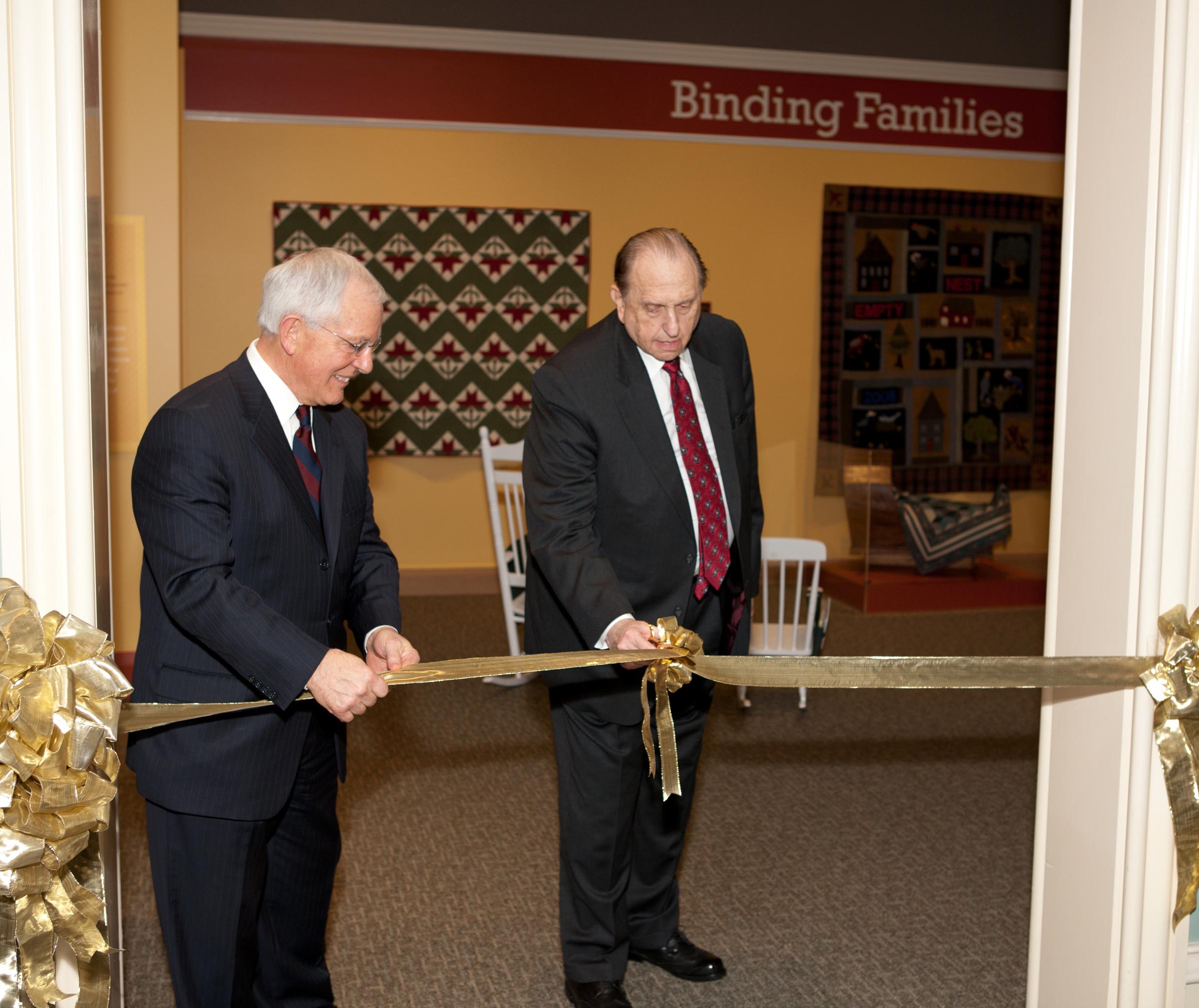 President Thomas S. Monson, President Henry B. Eyring and President Dieter F. Uchtdorf participated in a ribbon cutting for two new exhibits, Pieces of Me: Quilted Expressions of Human Ties and Seek My Face: Recent Artwork on Scriptural Themes.