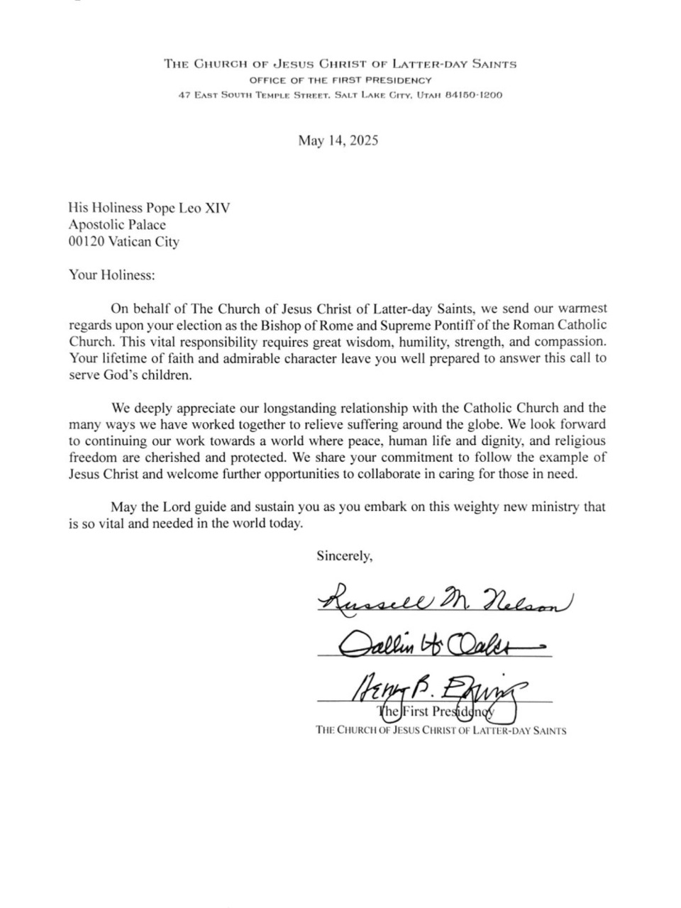 On behalf of The Church of Jesus Christ of Latter-day Saints, we send our warmest regards upon your election as the Bishop of Rome and Supreme Pontiff of the Roman Catholic Church. This vital responsibility requires great wisdom, humility, strength, and compassion. Your lifetime of faith and admirable character leave you well prepared to answer this call to serve God’s children.