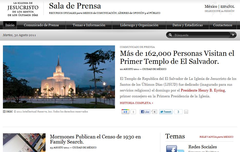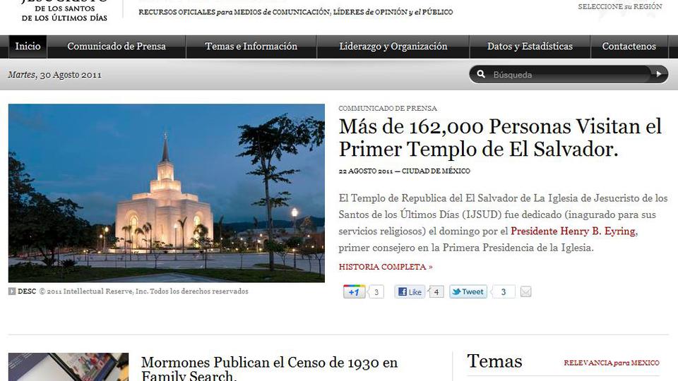 Nearly one year has passed since the launch of the most recent redesign of The Church of Jesus Christ of Latter-day Saints’ Newsroom website. This week, Newsroom took another step forward in its Web outreach with the launch of its Mexico Newsroom website, saladeprensamormona.org.mx.