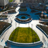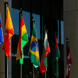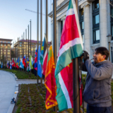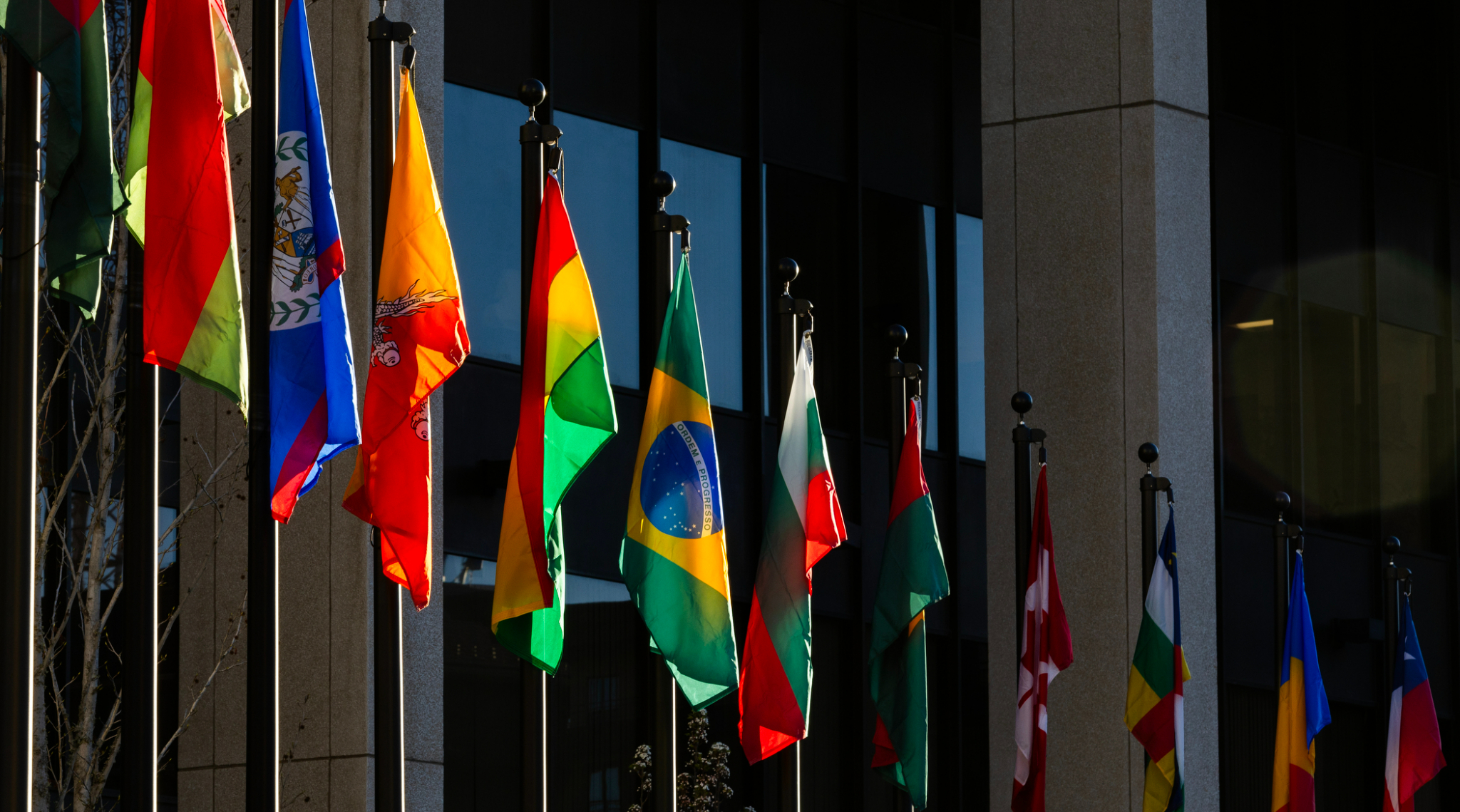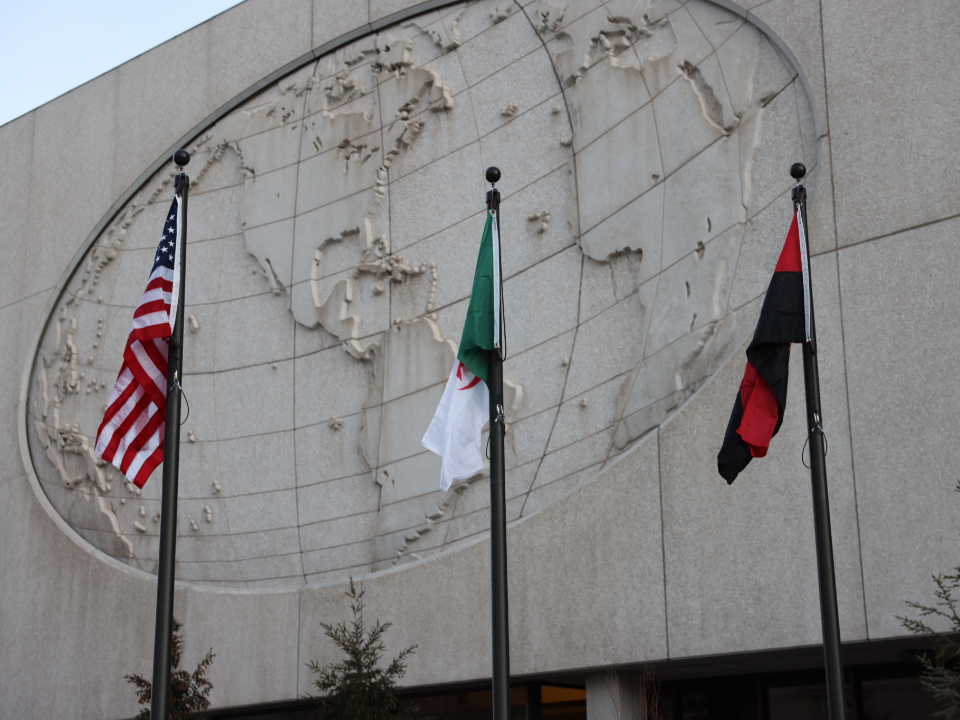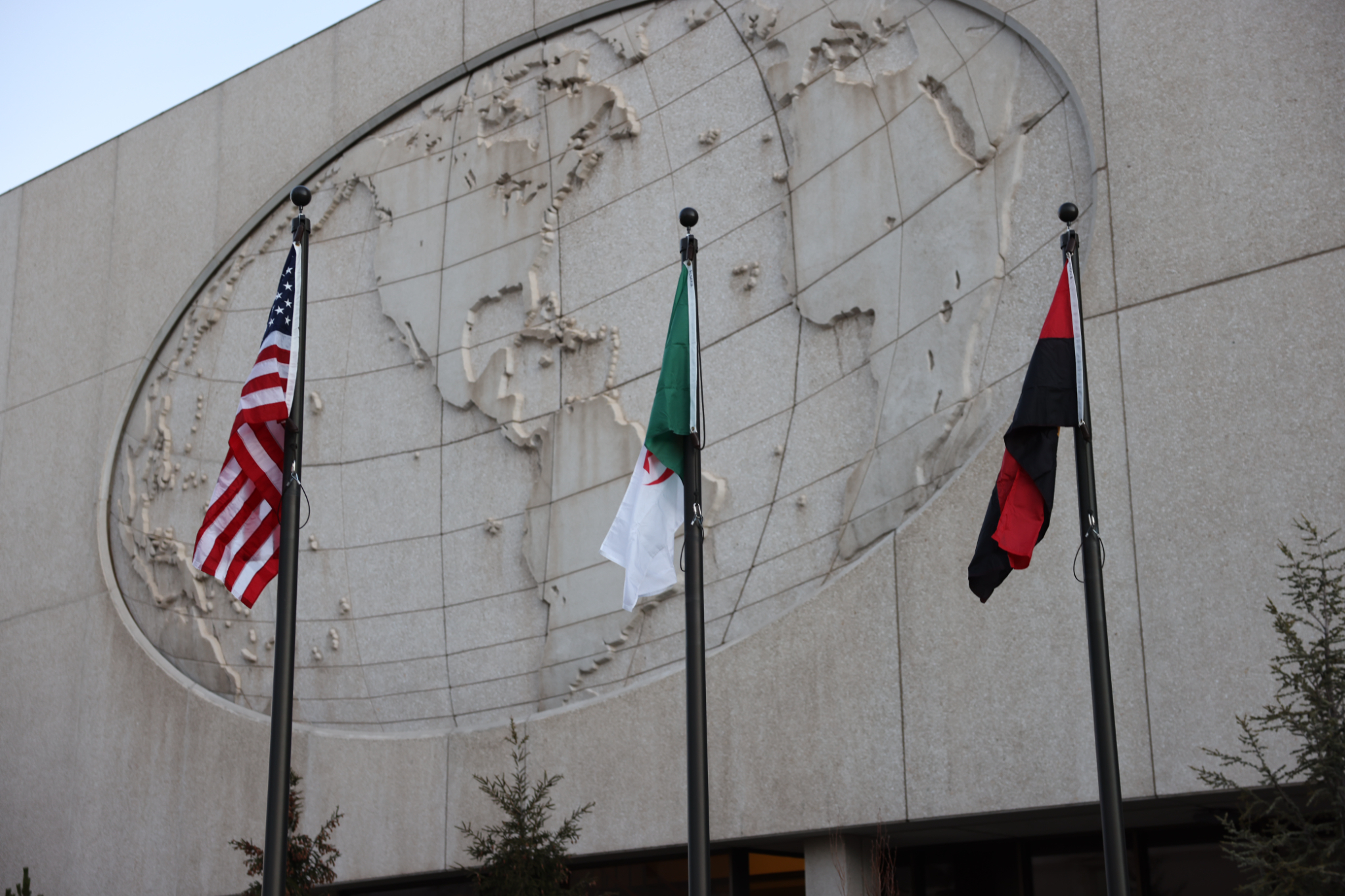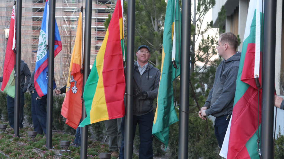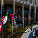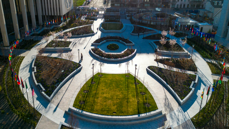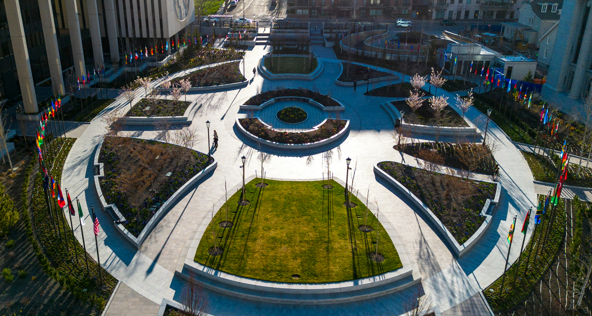 Flags of officially recognized United Nations countries will be displayed as part of a regular rotation. The flag oval begins at the plaza’s northwest corner with the flag of the United States. From there, 90 additional flags will rotate every three months. The flags will be placed in alphabetical order according to the English name of the country and will always be illuminated.