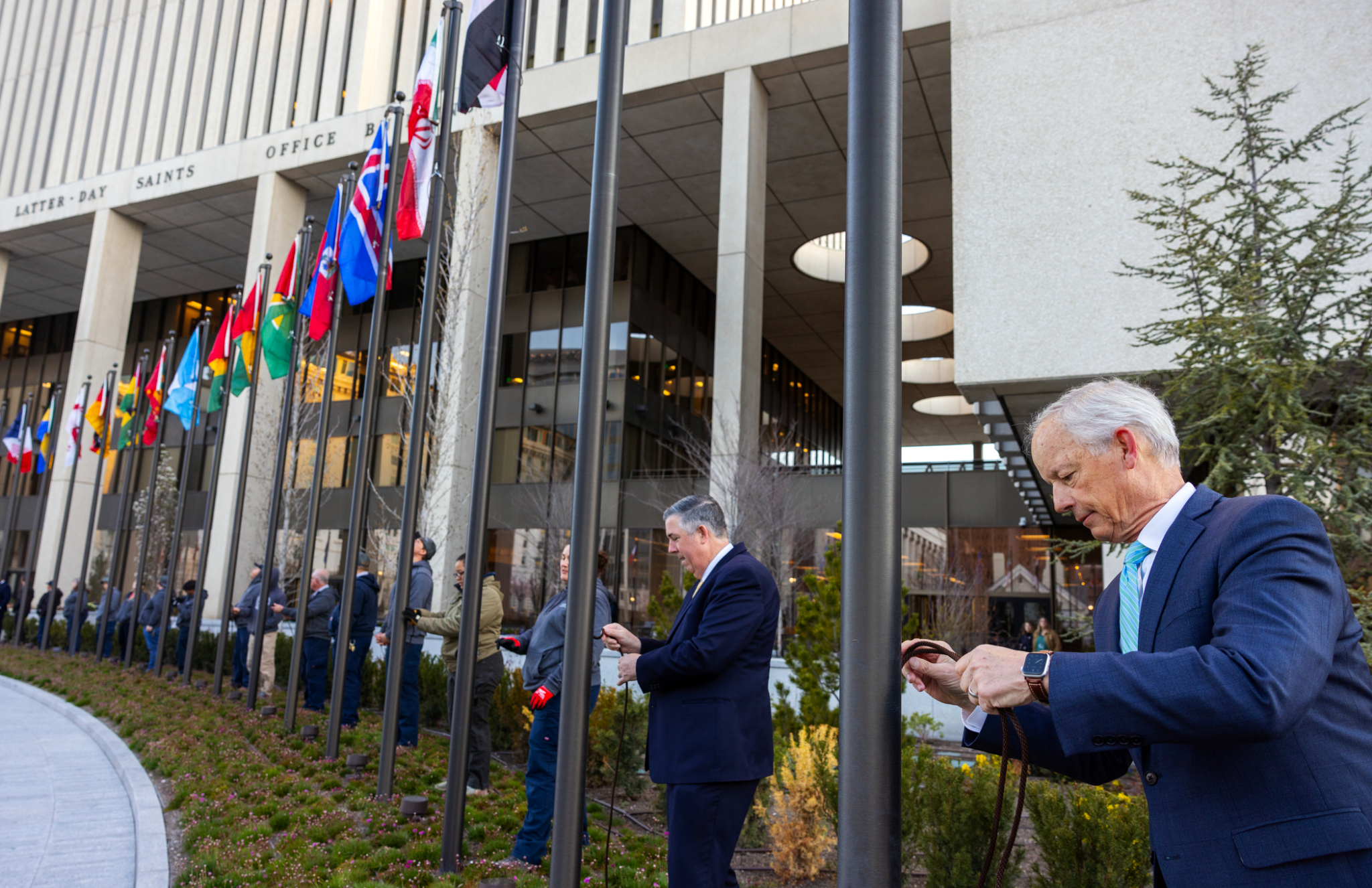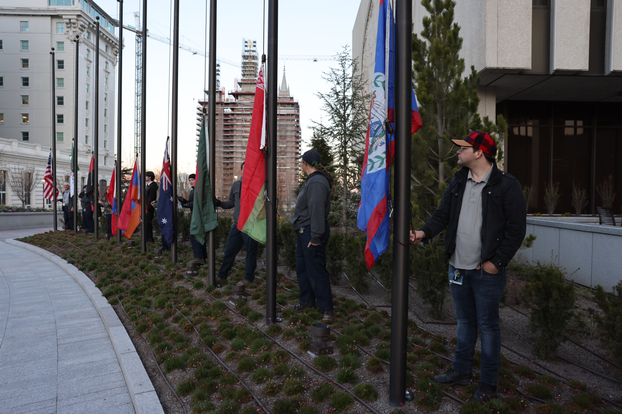 The plaza, which opened to the public in January of this year, is part of the larger renovation of Temple Square and the Salt Lake Temple. The flags are one of several art installations on Temple Square symbolizing the global nature of the Church of Jesus Christ, its commitment to be a friend to all nations, and the belief that the gospel of Jesus Christ will grow to fill the earth (see Daniel 2:35).