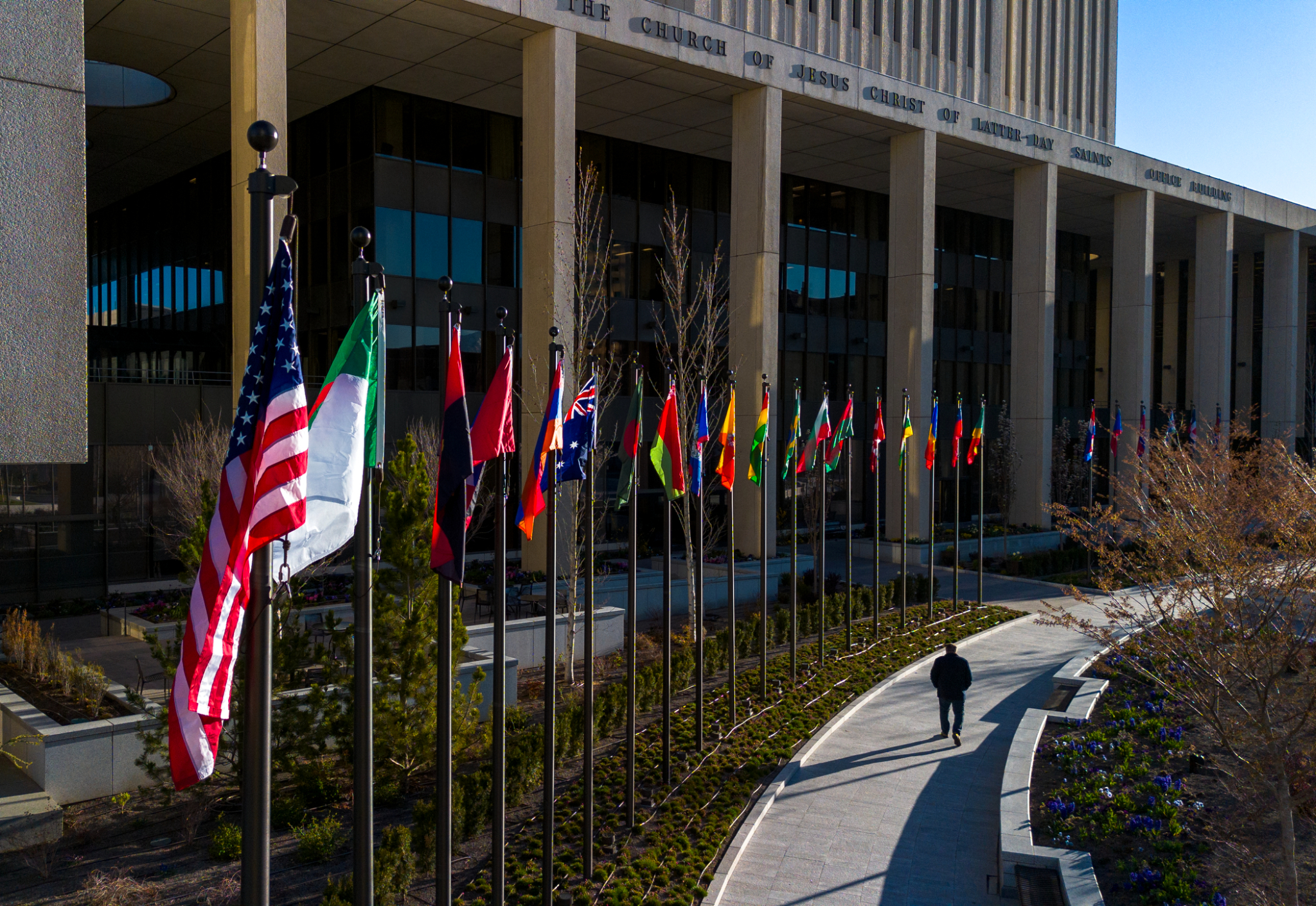 When the Church recognizes national and international days of mourning, half-staff flags will be displayed by the flags flown at the Church Administration Building, the Joseph Smith Memorial Building, and in front of the Conference Center. The flags in the plaza are intended to remain at full staff as an art installation.