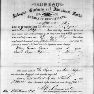 The Freedmen’s Bureau, organized under an 1865 Congressional order at the conclusion of the Civil War, offered assistance to freed slaves in many ways. Handwritten records of these transactions include records such as marriage registers, hospital or patient registers, educational efforts, census lists, labor contracts and indenture or apprenticeship papers and others. The records were compiled in 15 states and the District of Columbia.