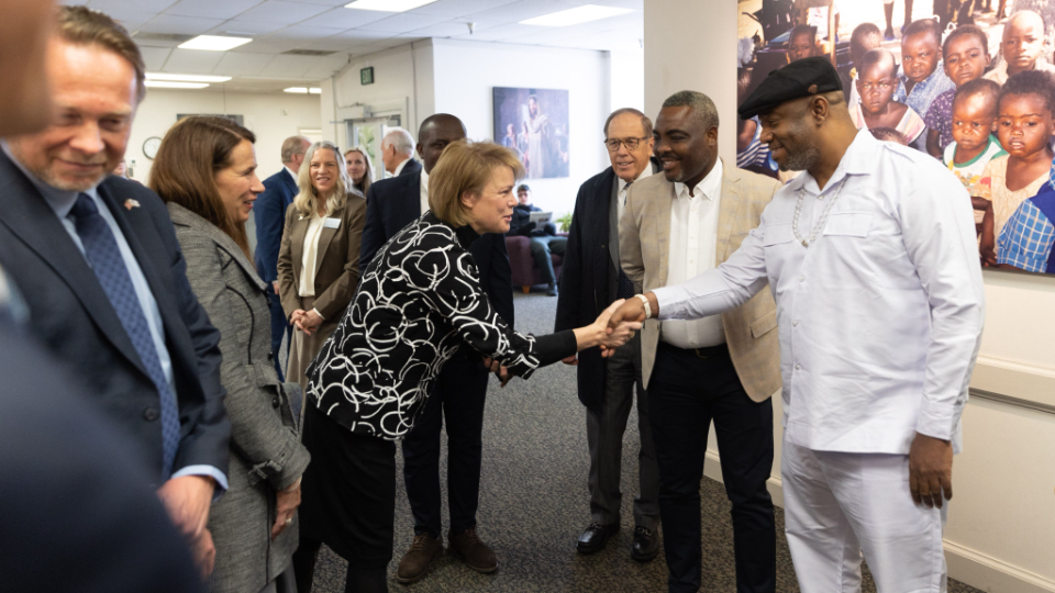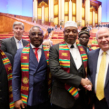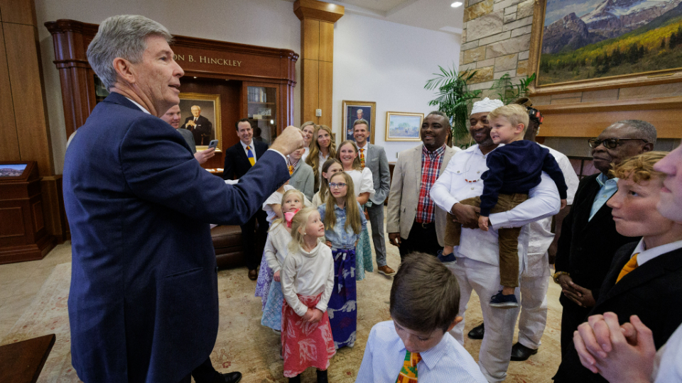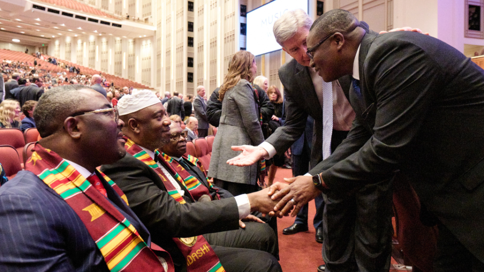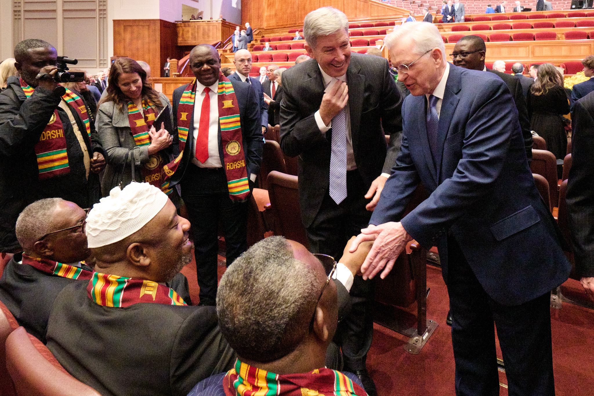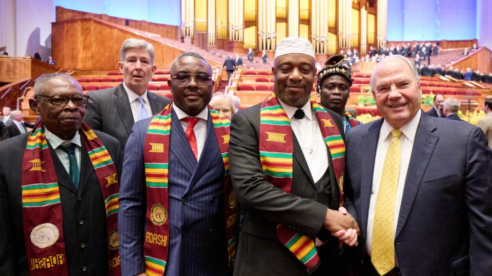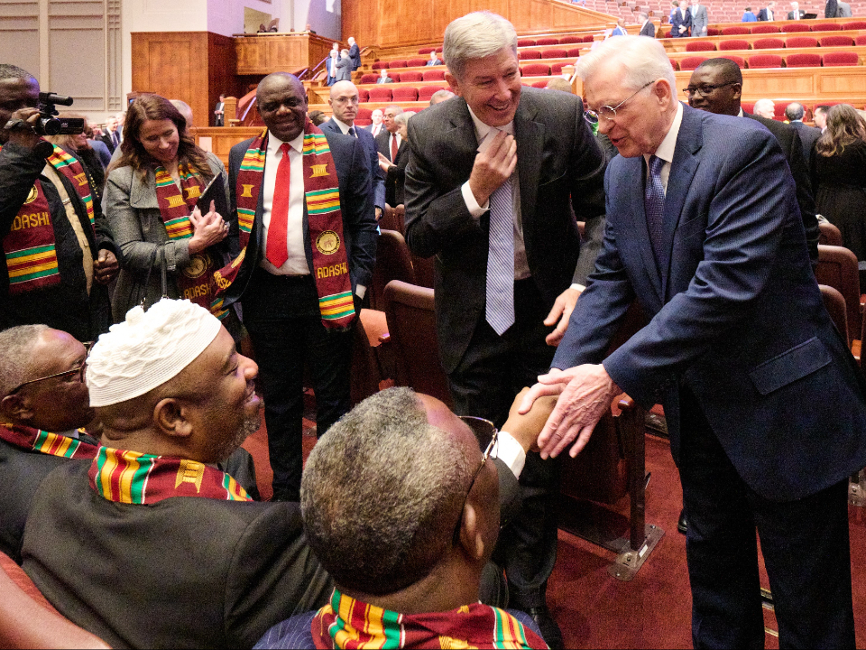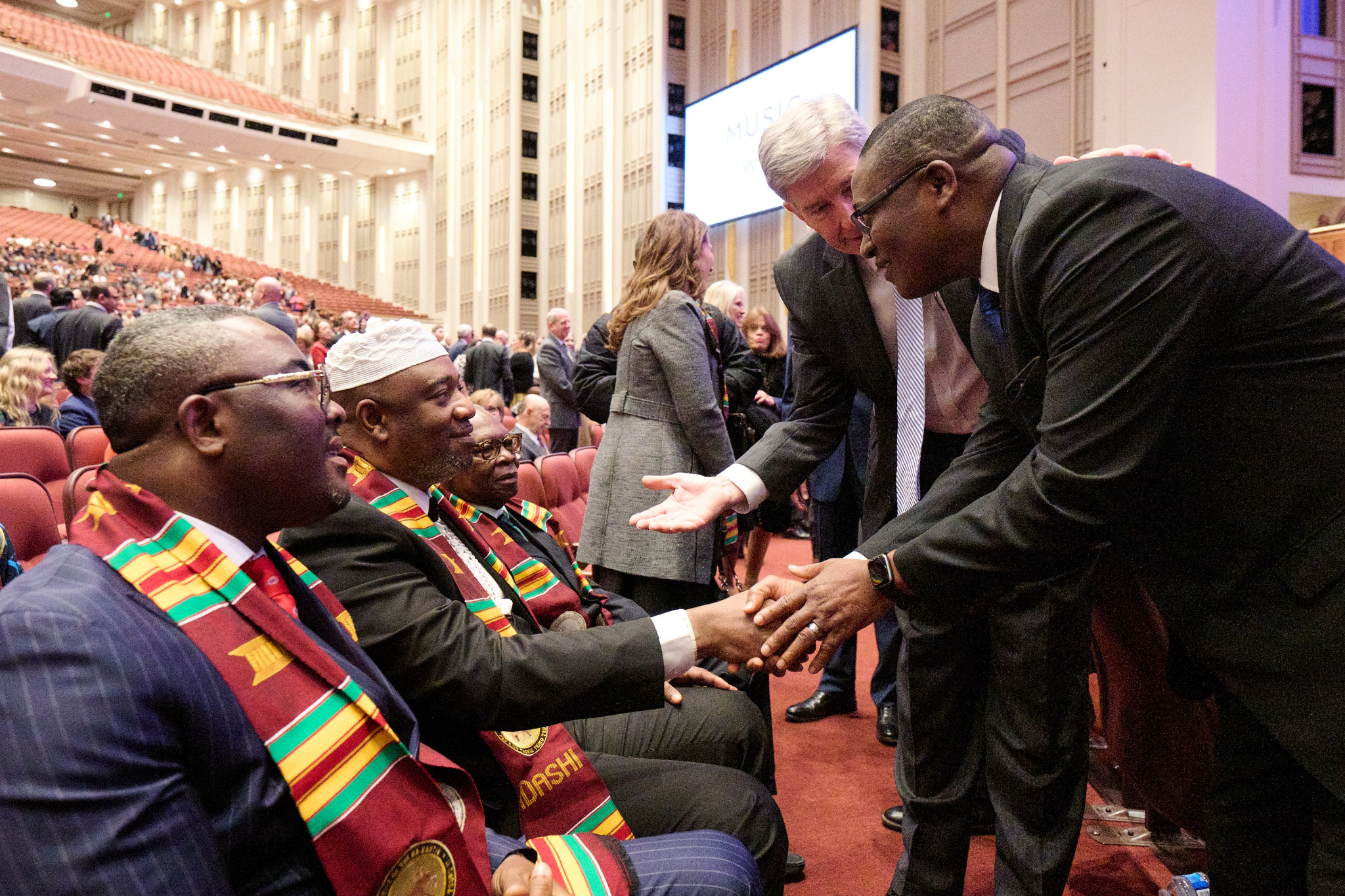 During his visit, he had the opportunity to tour Welfare Square and Brigham Young University, but the highlight of his visit came when attending the Church’s April 2023 general conference and a meeting with the First Presidency. At the Sunday afternoon session of the conference, Elder Ronald A. Rasband of the Quorum of the Twelve Apostles welcomed the Ga Mantse from the pulpit.