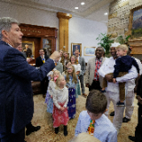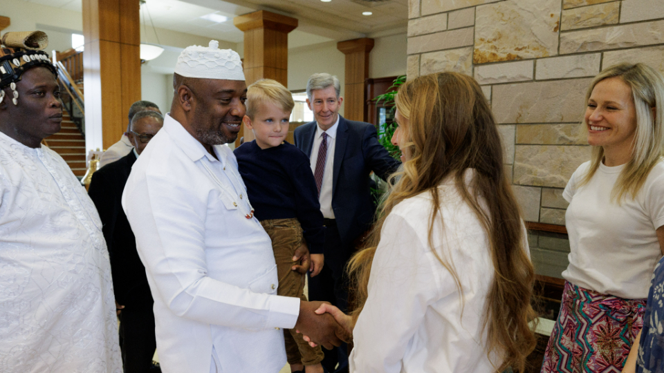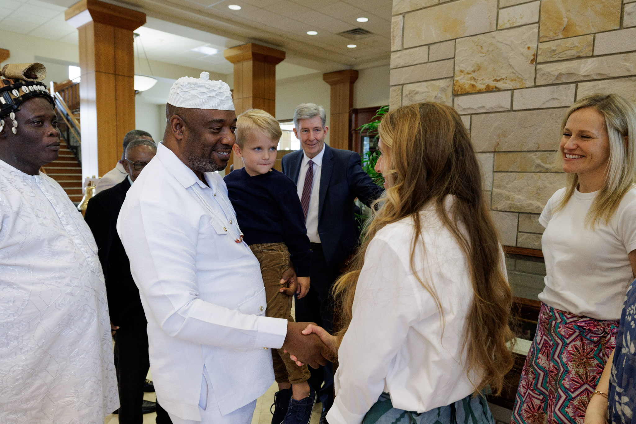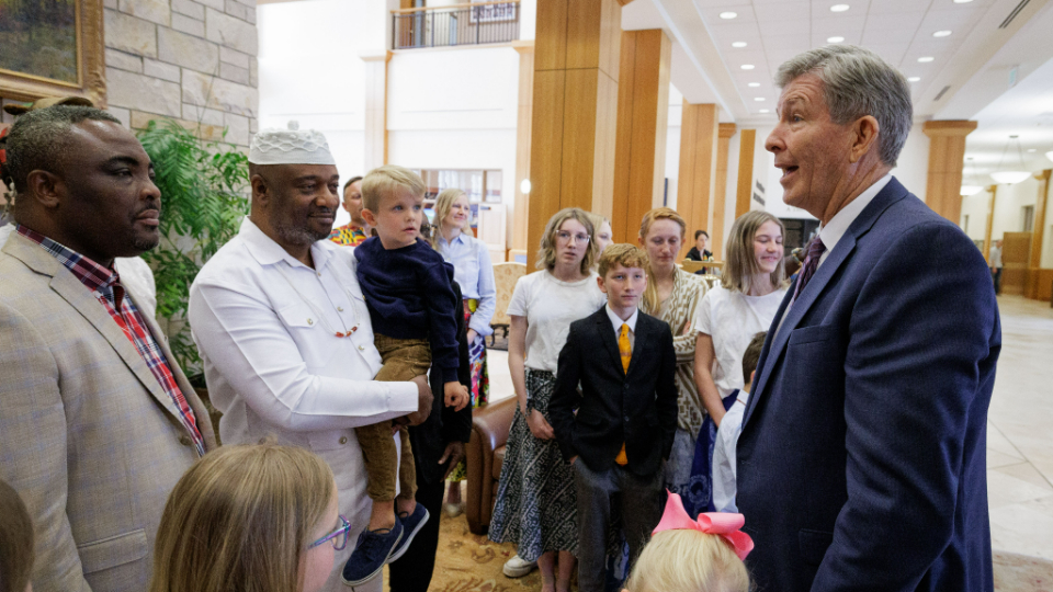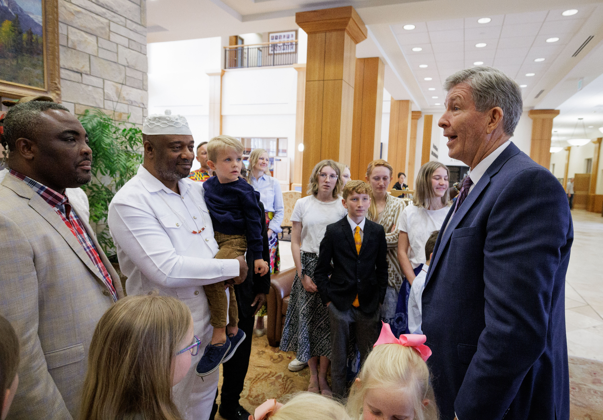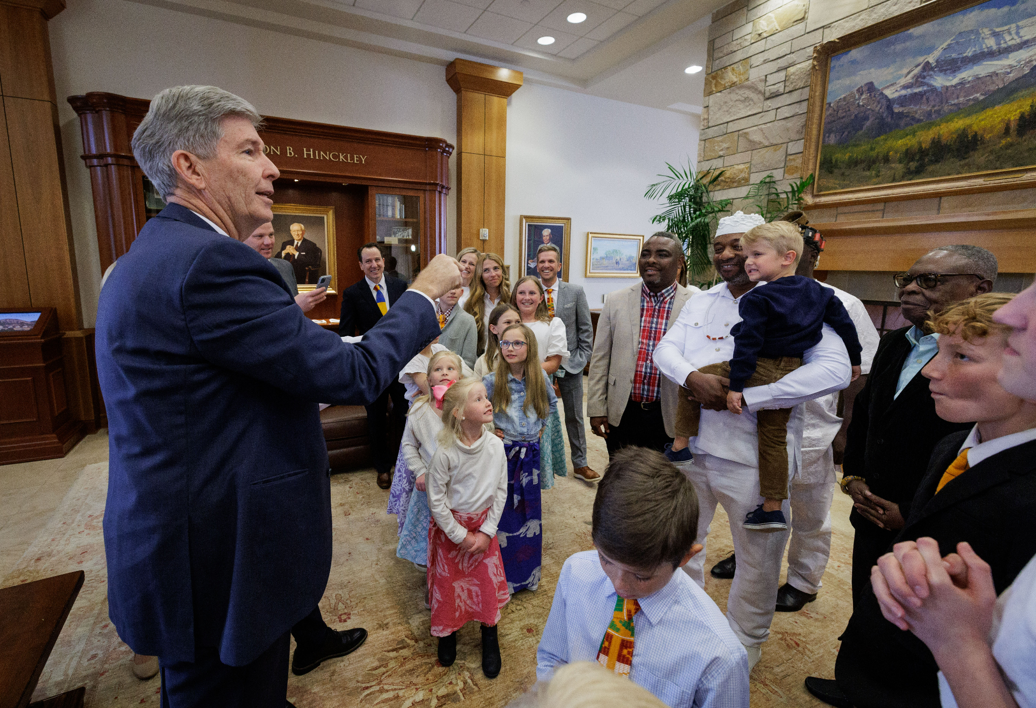 Elder S. Gifford Nielsen, General Authority Seventy, introduces the Ga Mantse to many of his children and grandchildren in the Hinckley Center at Brigham Young University on Monday, April 3, 2023.Elder and Sister Nielsen and many of their children, who were already friends with the king from the time they spent with him in Ghana, also met the king at the Hinckley Center on the BYU campus. There, the Ga Mantse was thrilled to be introduced to all but 12 of the Nielsens’ 39 children and grandchildren. Sister Nielsen said that it’s important to treat others like family.