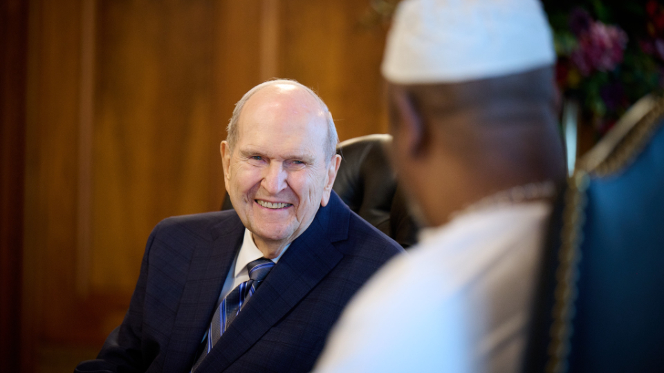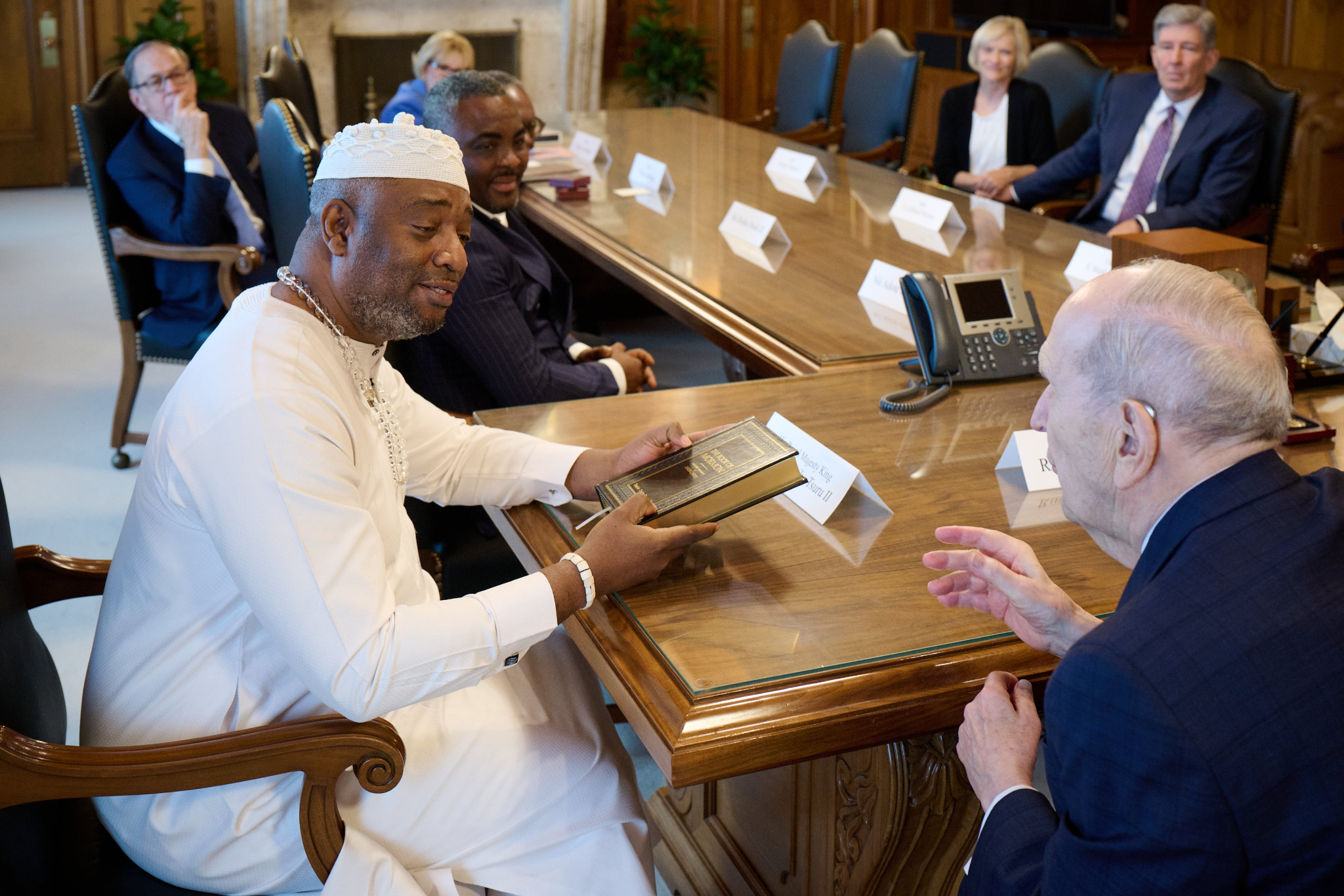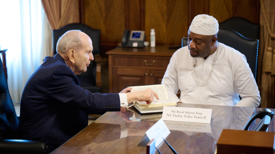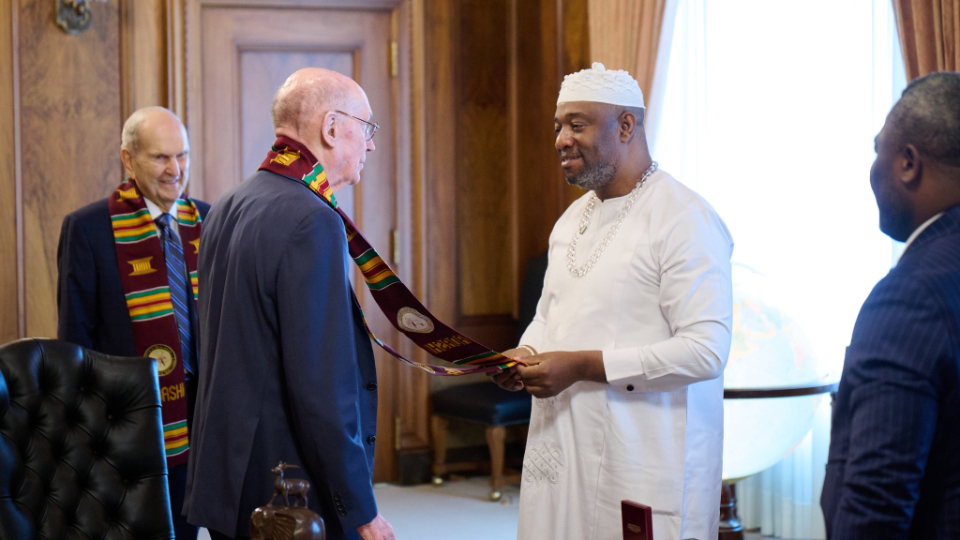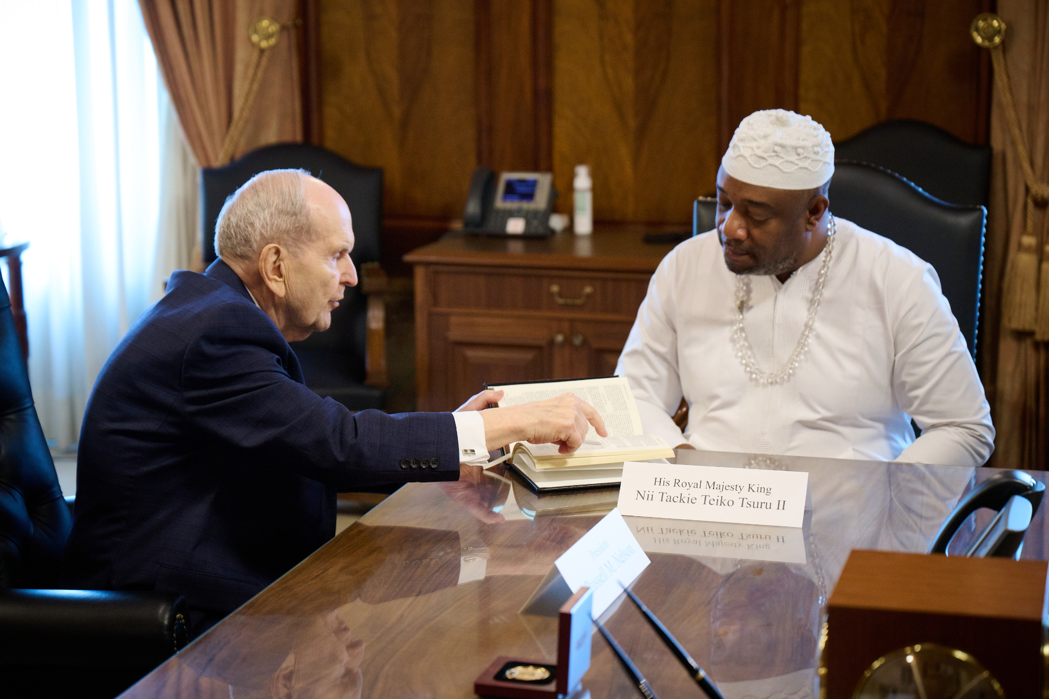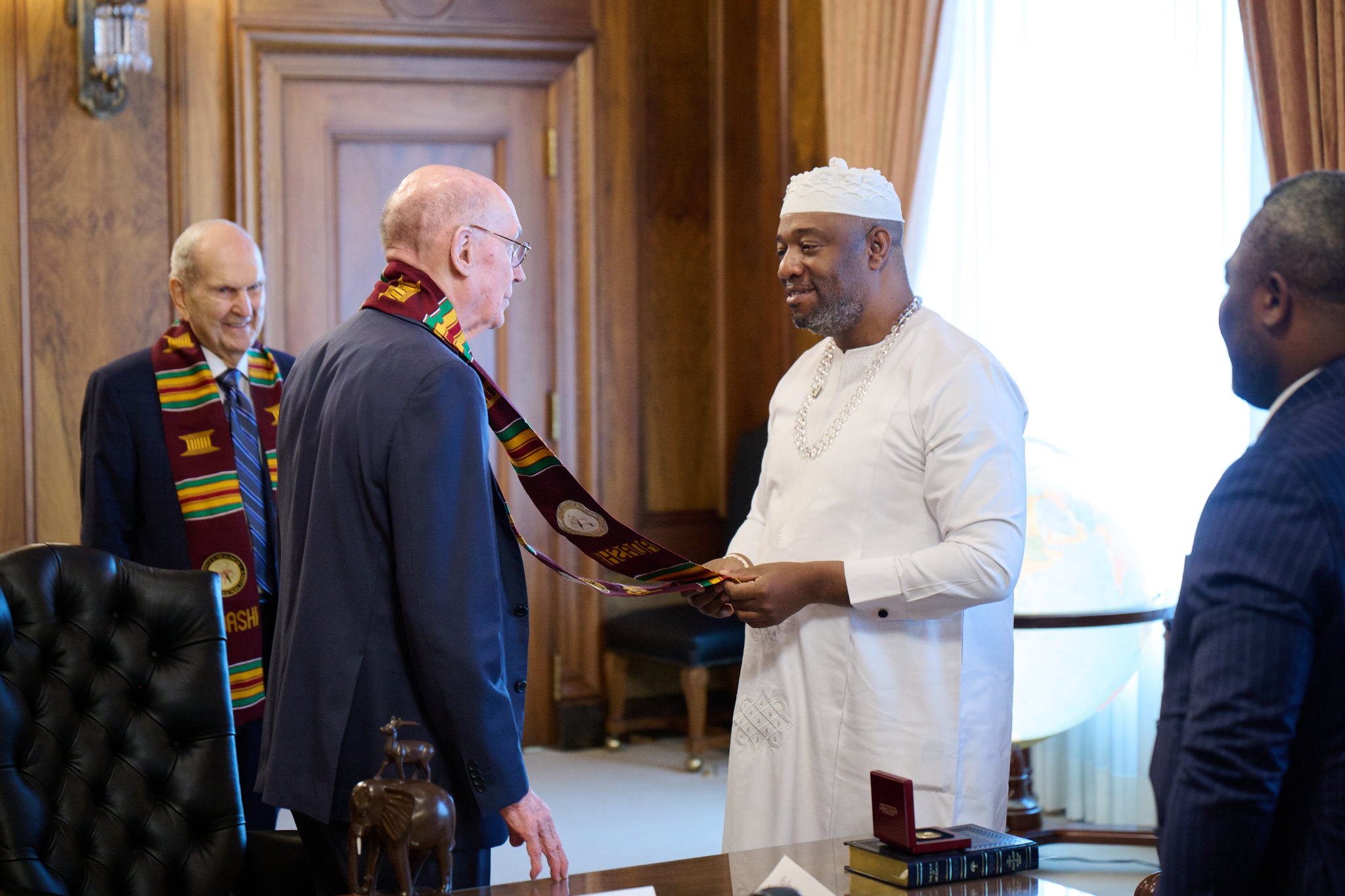 President Nelson gave him a copy of the Book of Mormon, and in turn, the Ga Mantse gave him and President Eyring traditional scarves as a token of appreciation.