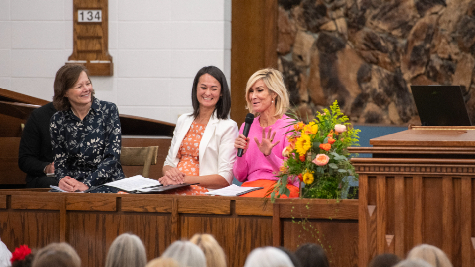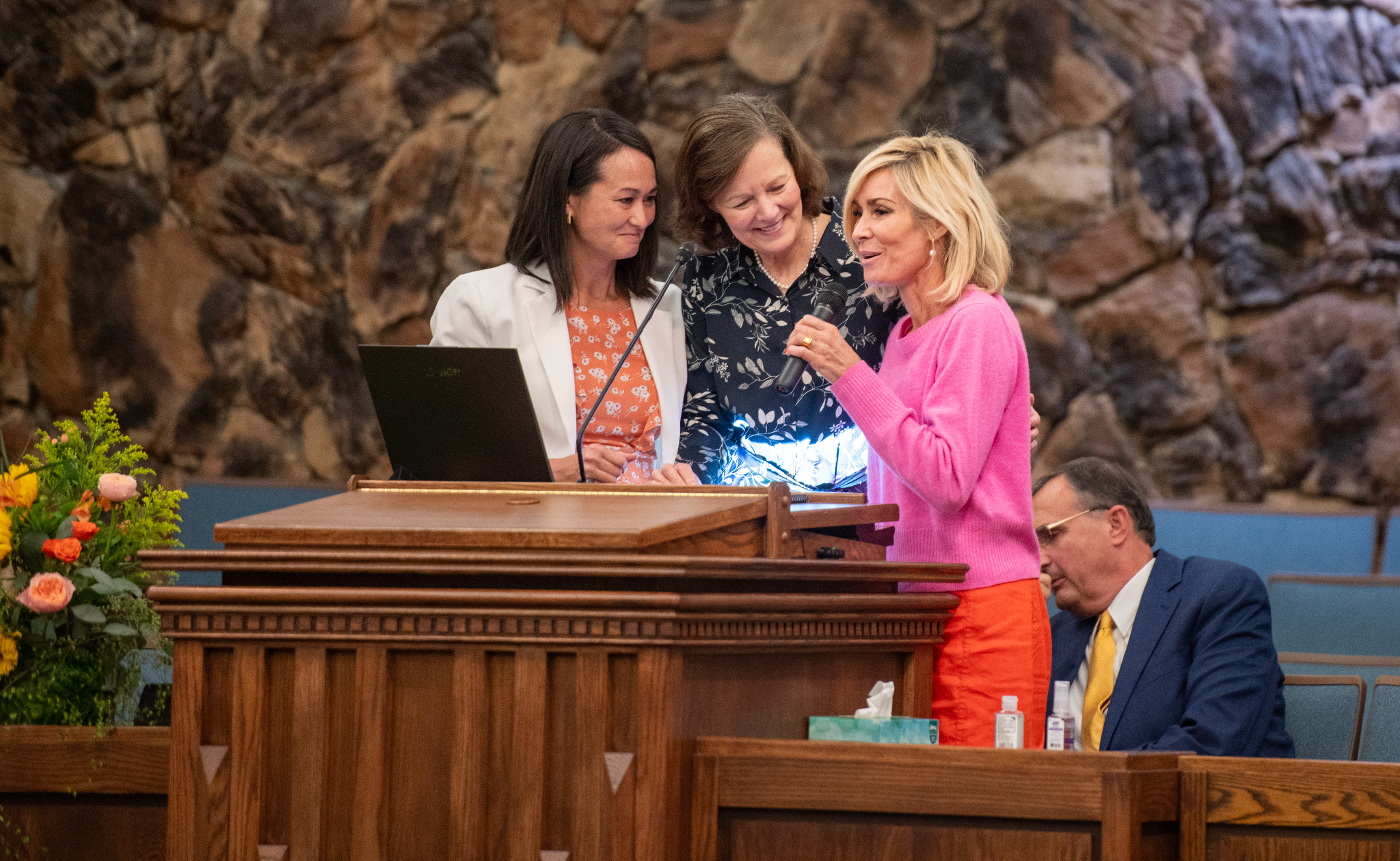 President Porter, Sister Yee and Sister Runia stood together at the podium at the beginning of the meeting.