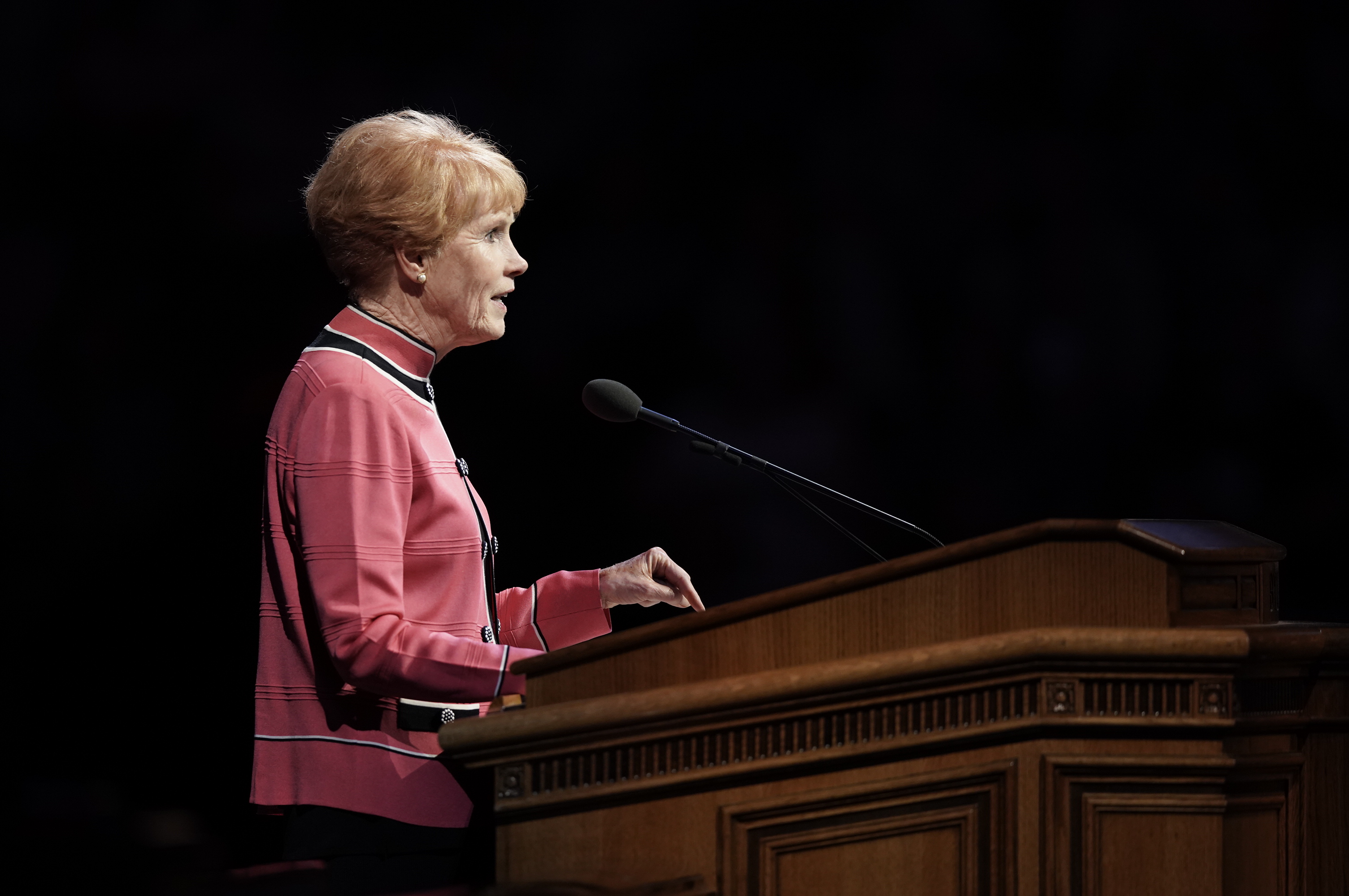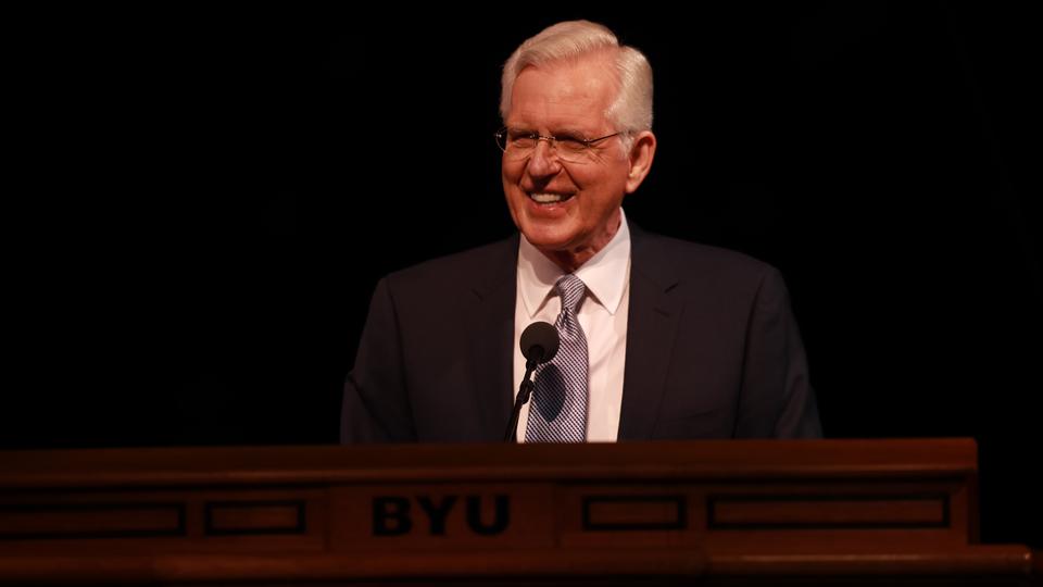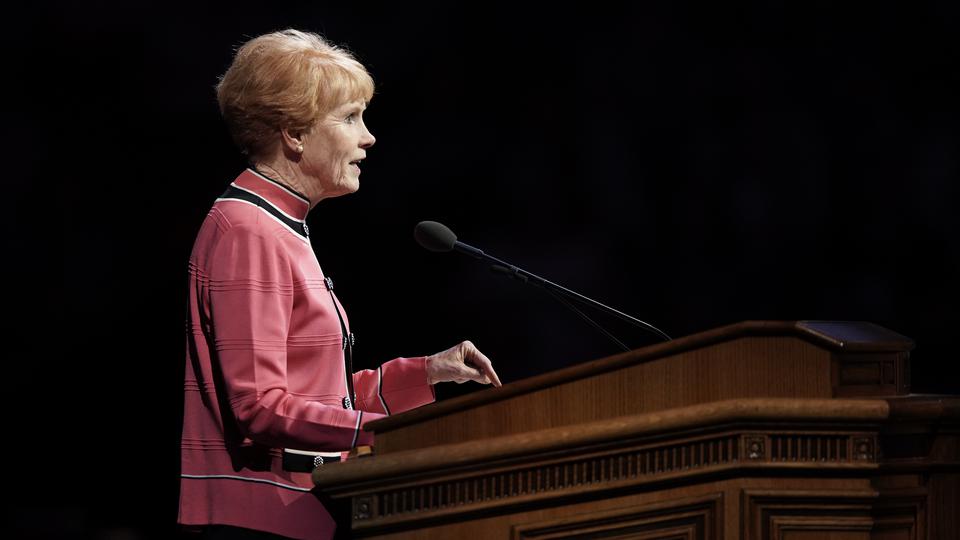 “In reflecting on the past, I realized that my testimony didn’t come with one stunning event or miracle,” said Sister Christofferson, who stood at the pulpit before a large crowd gathered in the Marriott Center. “It came by small whisperings of the Spirit. It came line upon line and precept upon precept as I heeded the words of modern prophets, studied the scriptures, followed worthy examples and tried to apply gospel principles in my life.”