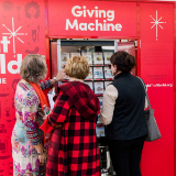 The large, rectangular and red Giving Machines are now well-recognized after several years. They are like a vending machine, where people can select a charitable item from dozens of local and global charity organizations. These include clean water, produce, meals, cooking supplies, eyeglasses, vaccines, skills training and educational supplies. The livestock options — like goats, pigs and chickens — are available again.