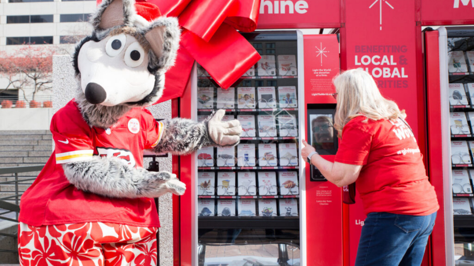 Kansas City Chiefs mascot KC Wolf helps open the Giving Machine at Crown Center in Kansas City, Missouri on November 30, 2021. Photo by Valerie Anderson, courtesy of the Church News. All rights reserved.