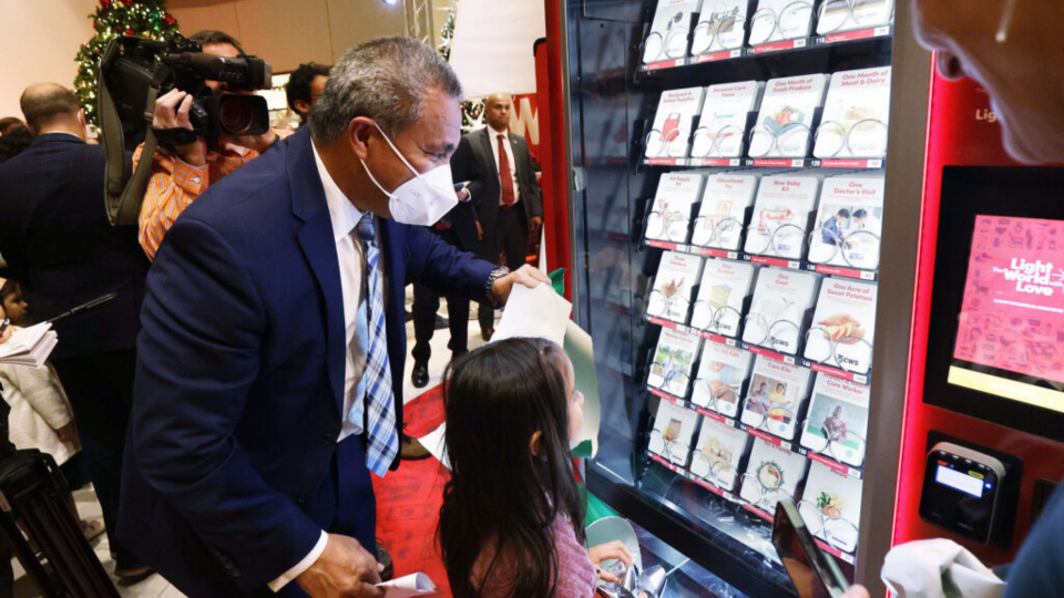 “Every year, the world needs a message of giving. This message of giving is encompassed here in these Giving Machines, where it makes it possible for people to give to people in need, and do so in a way where 100% of every dollar comes to them,” said David Checketts, former president and CEO of Madison Square Garden and former president of the England London Mission.