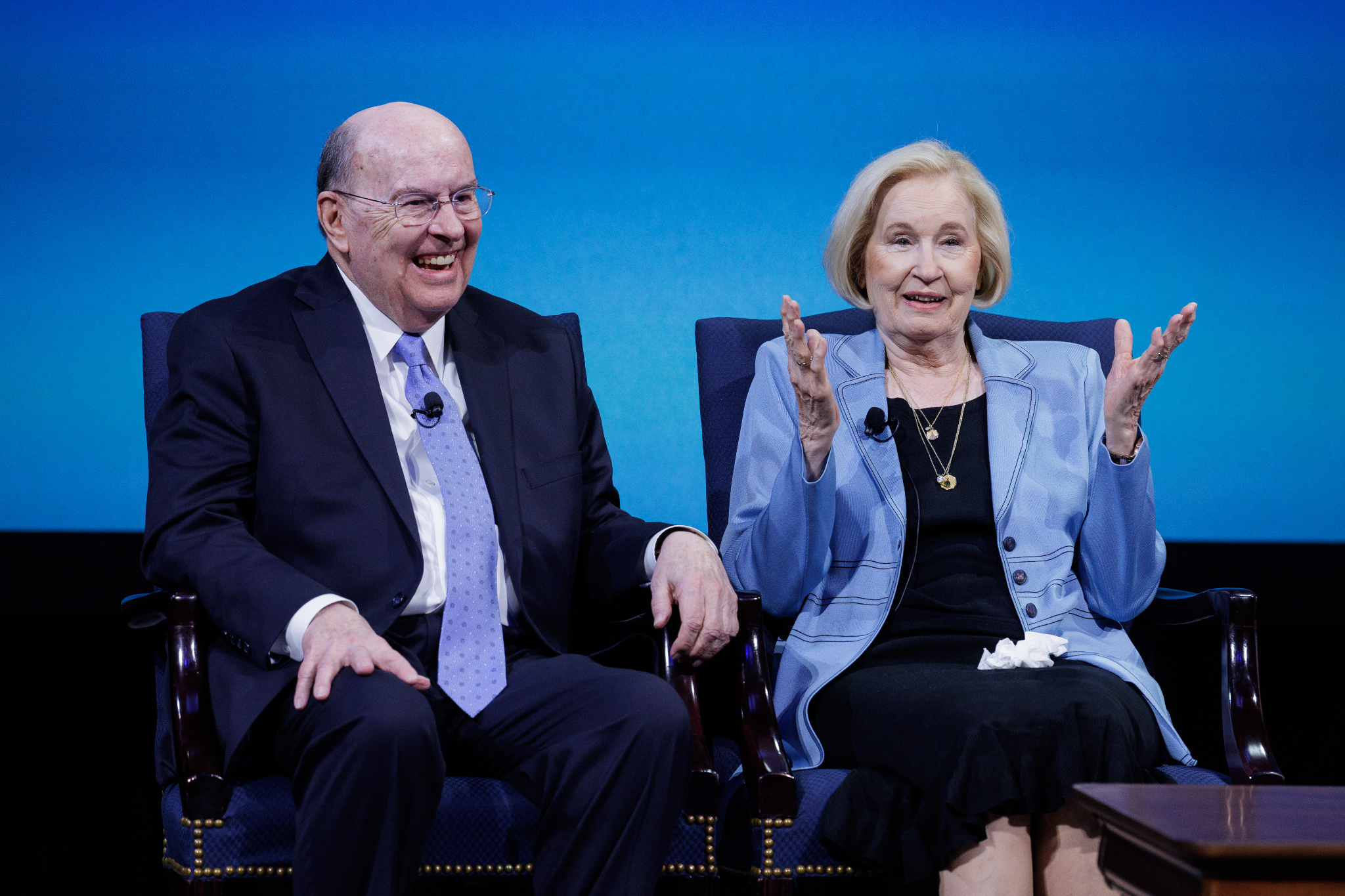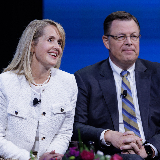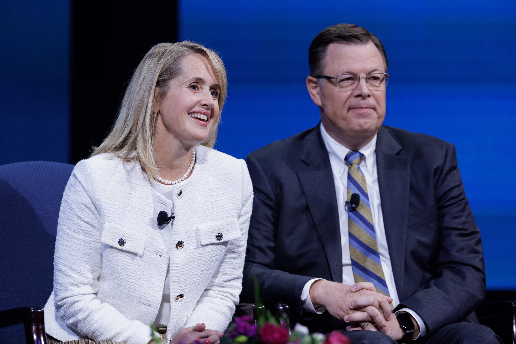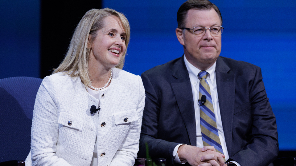 Elder Clark G. Gilbert, a General Authority Seventy and the Church commissioner of education, right, and his wife, Sister Christine Gilbert, at the Worldwide Devotional for Young Adults that was broadcasted across various Church channels on Sunday, November 19, 2023.Sister Gilbert explained that the Gilberts manage all their significant responsibilities through planning (holding a regular calendaring session) and having a shared purpose and goals.