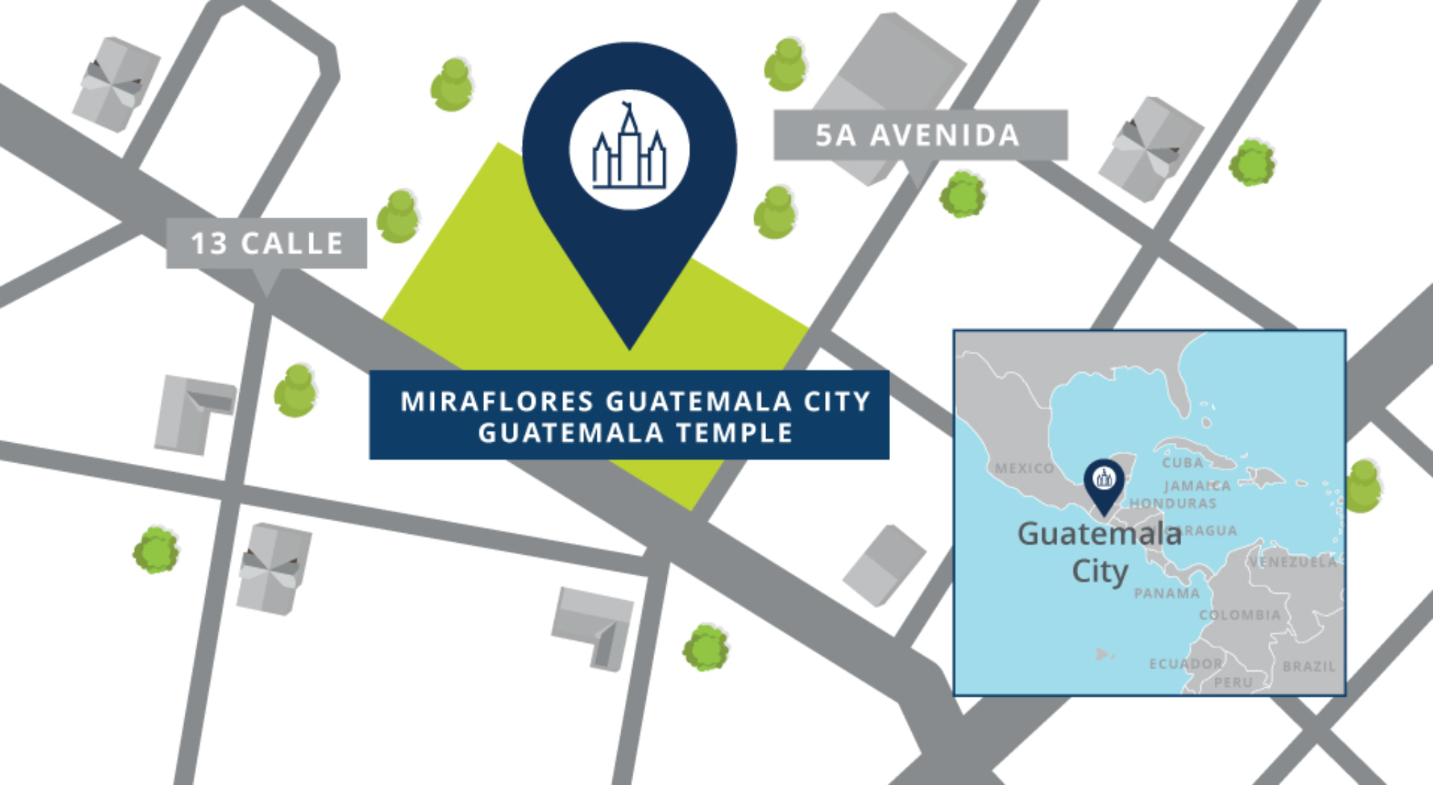 Map showing the location of the Miraflores Guatemala City Guatemala Temple. 2022 by Intellectual Reserve, Inc. All rights reserved.The Miraflores Guatemala City Guatemala Temple will be built on a 1.5-acre site located at the intersection of 13 Calle and 5-56 in Guatemala City, Guatemala. Plans call for a two-story temple of approximately 30,000 square feet.