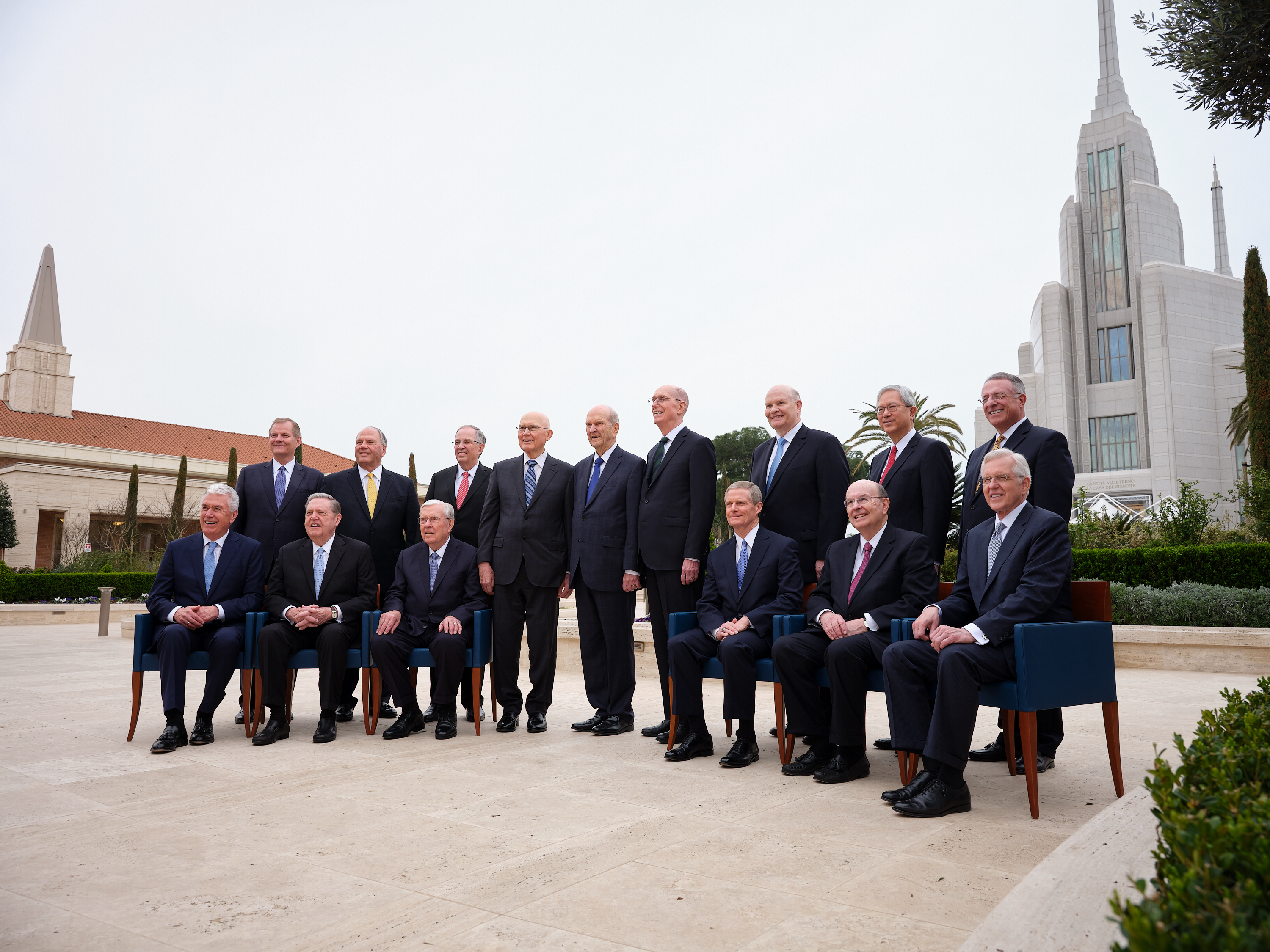 In the midst of three days of dedicatory ceremonies for the Rome Italy Temple of The Church of Jesus Christ of Latter-day Saints, all members of the First Presidency and Quorum of the Twelve Apostles (15 in all) gathered Monday for a historic group photo. It is believed to be the first time in Church history that all 15 leaders have gathered in one location outside the United States — and the first group photo taken in two decades.