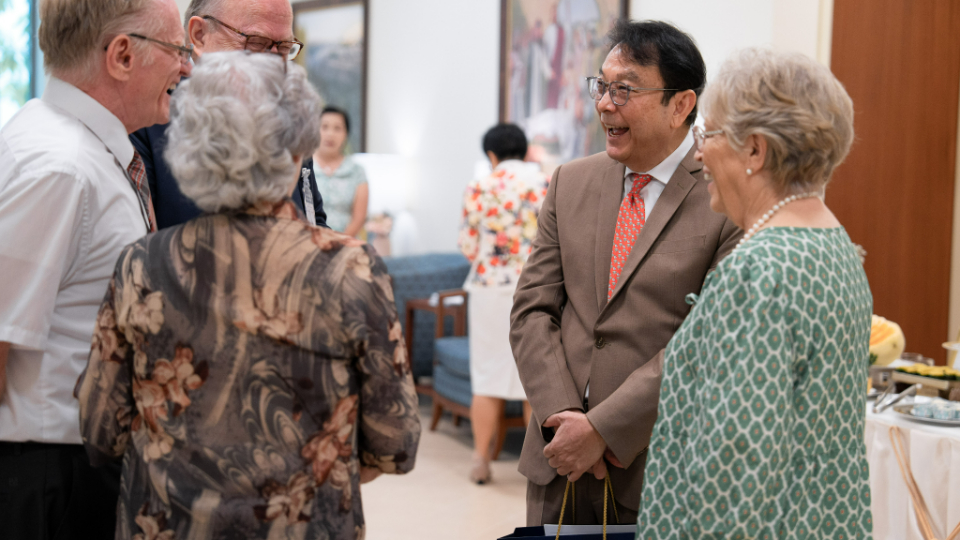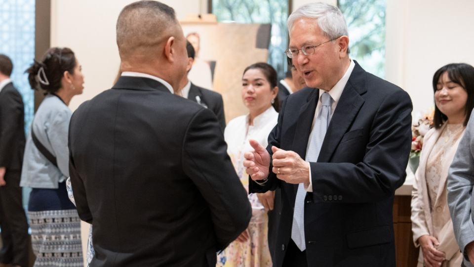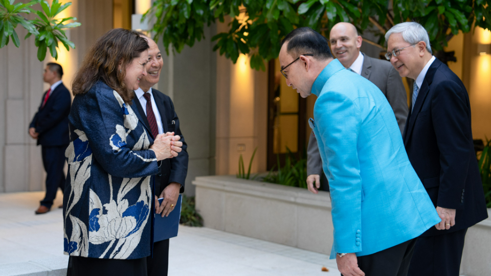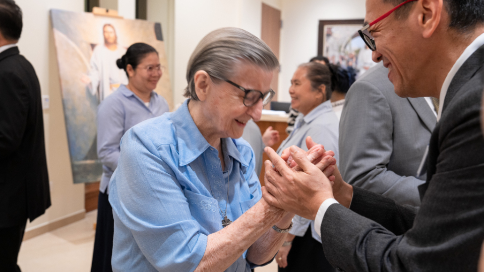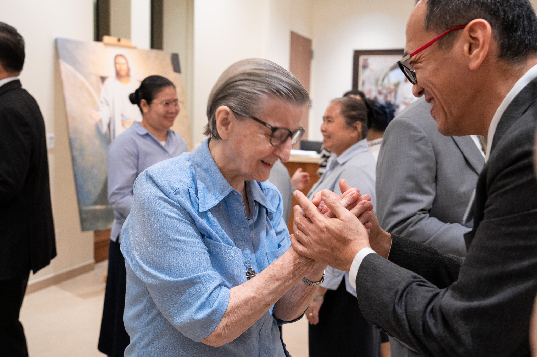 One of the guests, Louise Horgan of the nonprofit The Good Shepherd Sisters of Thailand, has enjoyed a special relationship with the Church of Jesus Christ since at least 2018. Horgan, who is nearly 90, has spent her life providing shelter and educational training for at-risk women. Just last year, Elder Dieter F. Uchtdorf of the Quorum of the Twelve Apostles presented Horgan with a donation that helped her organization build a teaching kitchen to provide vocational training for the women in her care.