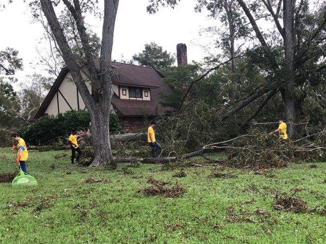 Following brief sacrament meetings held Sunday morning in various chapels in the surrounding Houston and Beaumont region, volunteers returned for yet another day of service. They are helping in locations throughout Louisiana, as people remain in dire need of assistance to clear debris and protect their damaged homes from rain.