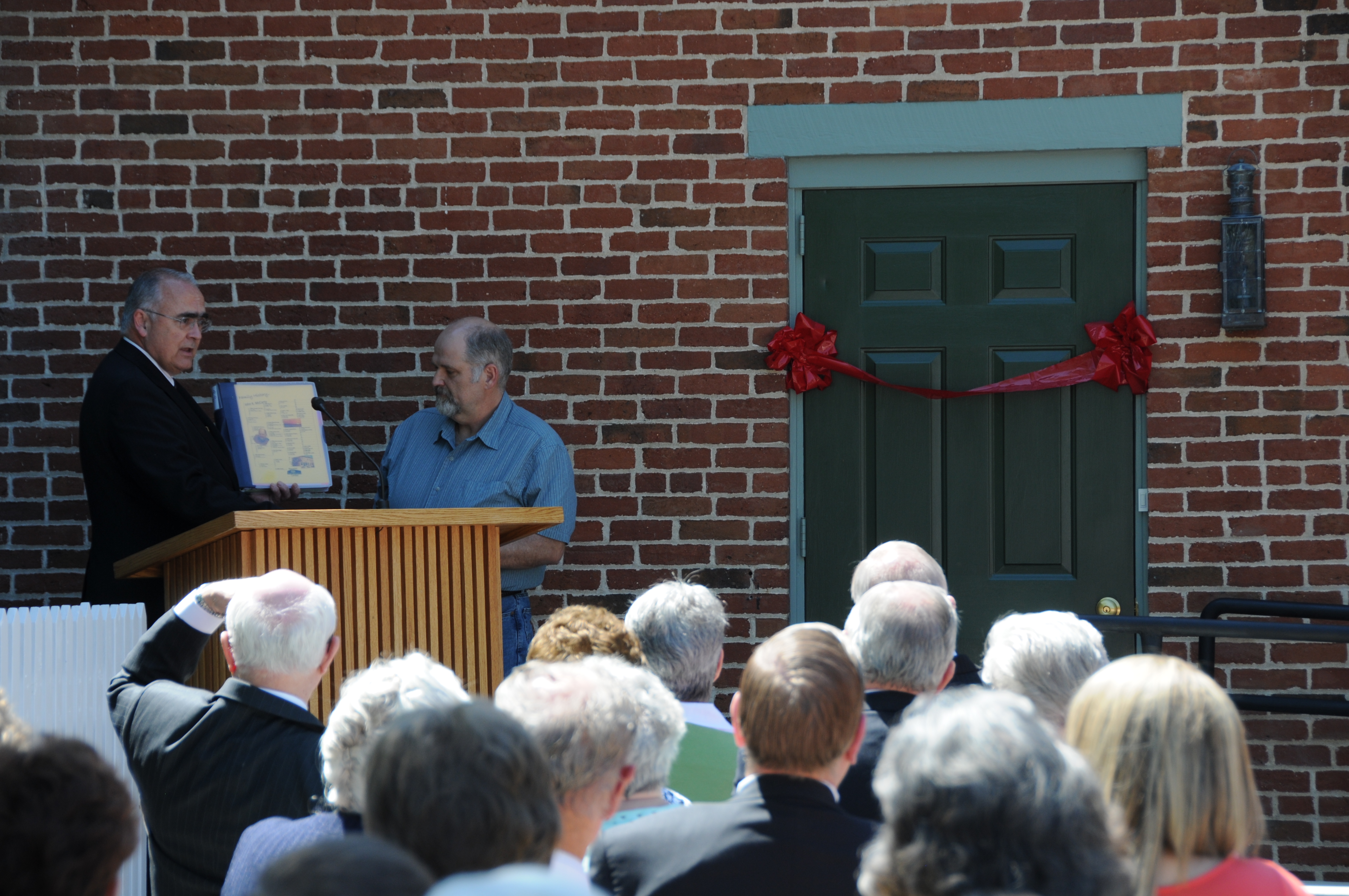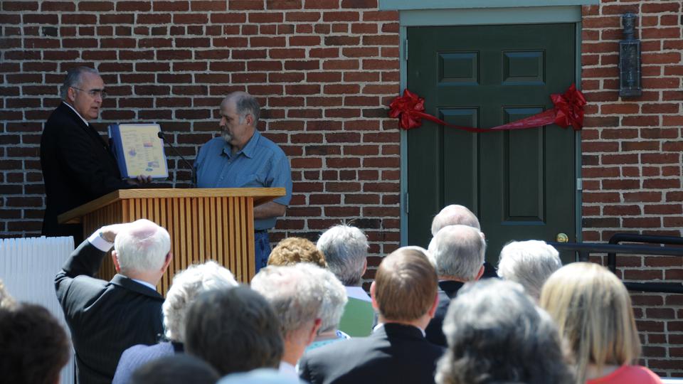 Nauvoo’s mayor, John McCarty, participated in opening the center by cutting the ribbon and receiving a copy of his family’s genealogy stretching back eight generations in Nauvoo. It was noted that George Bratz, a Swiss emigrant in 1846 and part of the McCarty family also served as the mayor of Nauvoo.