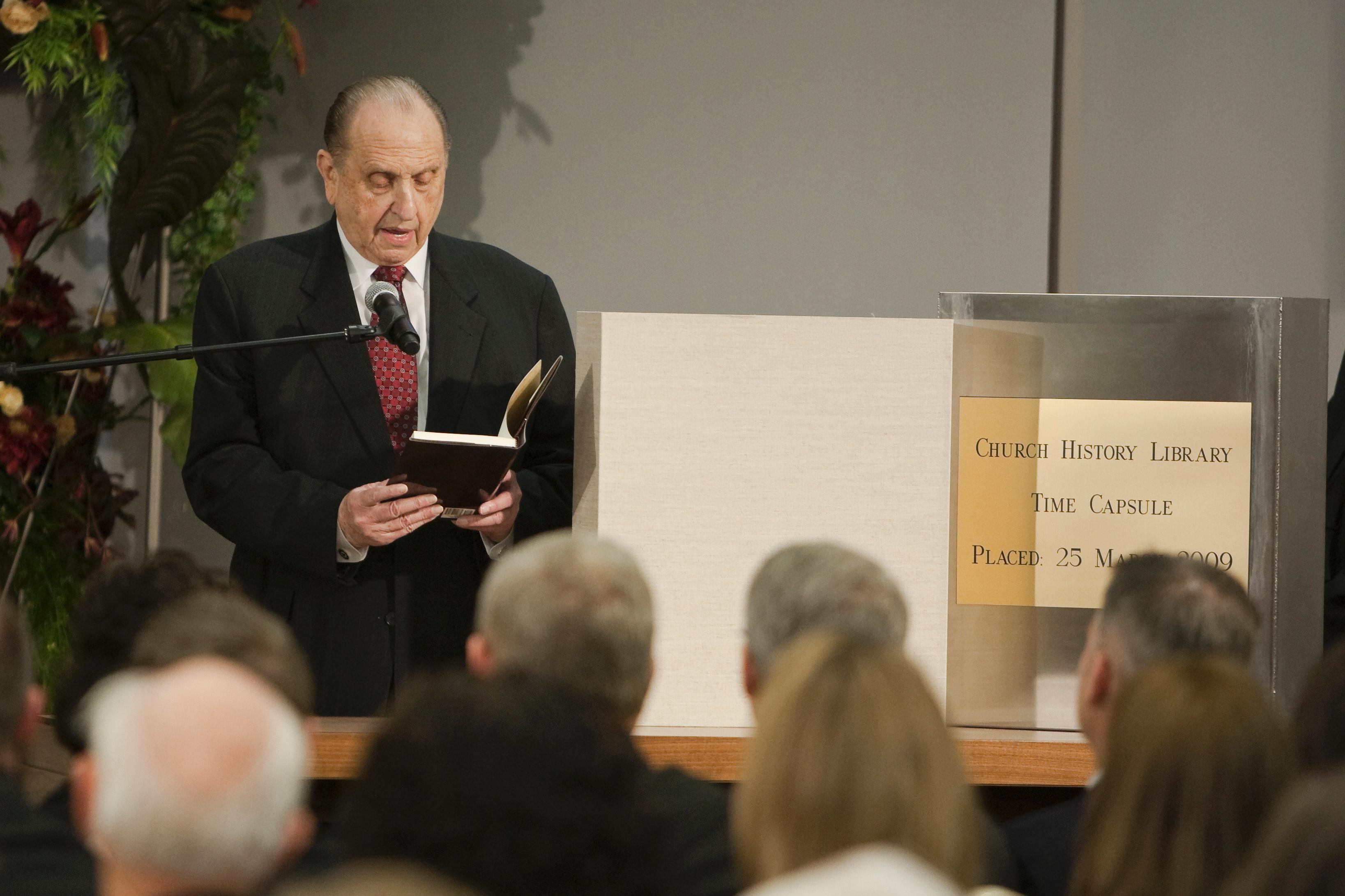 President Thomas S. Monson, world leader of The Church of Jesus Christ of Latter-day Saints added his book Faith Rewarded; a Personal Account of Prophetic Promises to the East German Saints to other artifacts that were among the first to be placed in the newly constructed Church History Library. They were not locked away in a vault or placed on a shelf but sealed in a time capsule inside one of the massive walls of the 230,000 square foot state-of-the-art structure 25 March 2009.