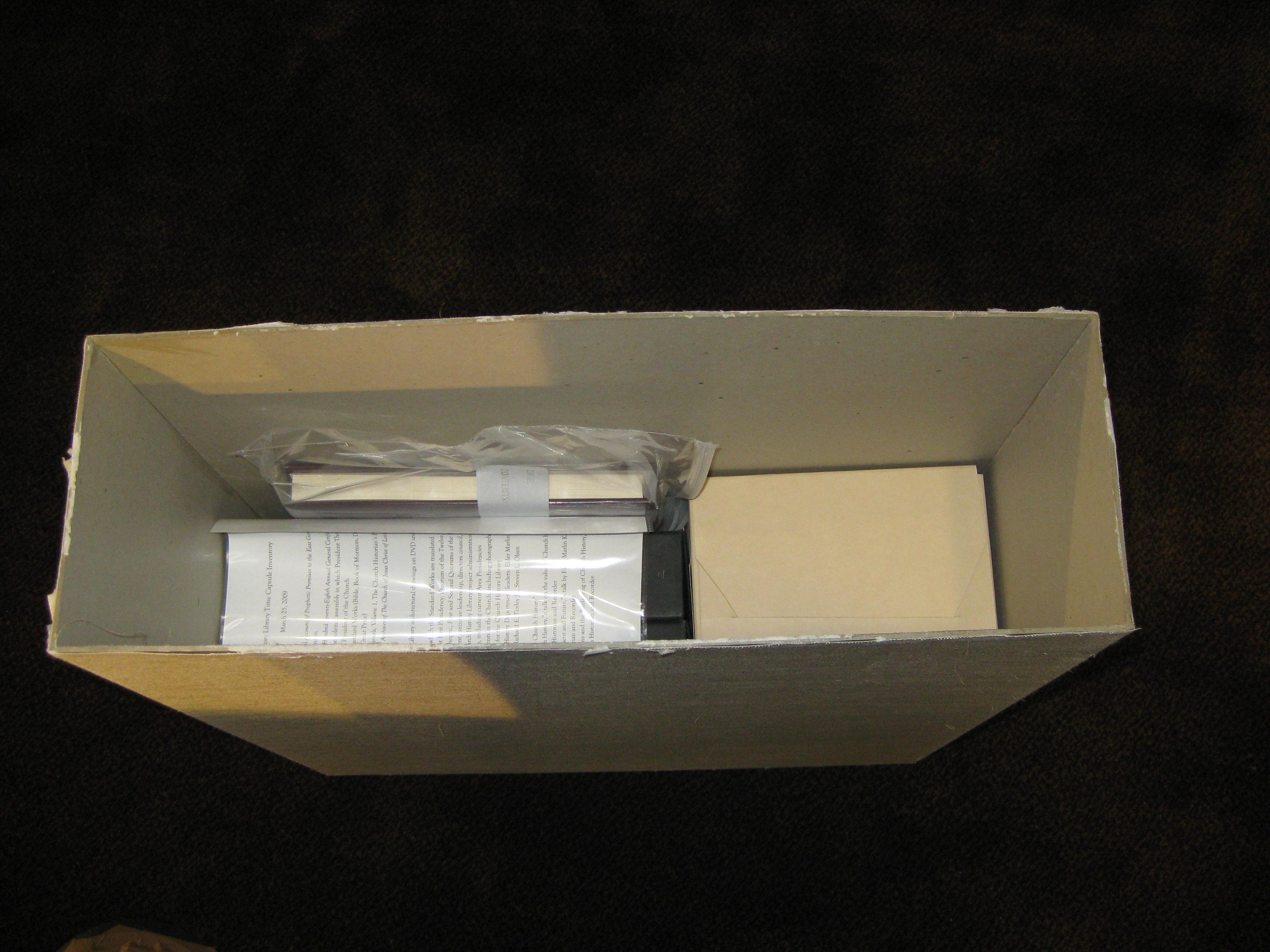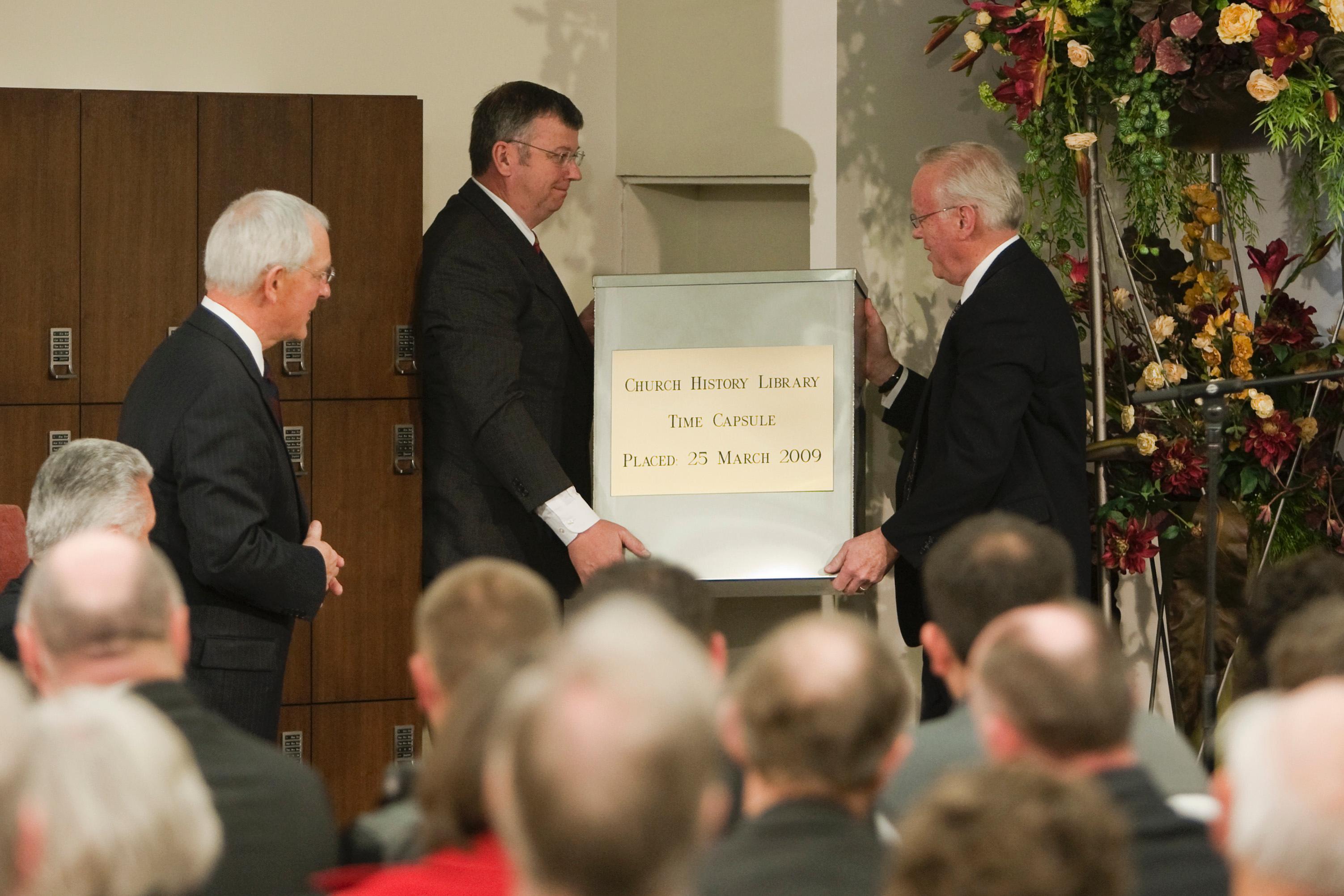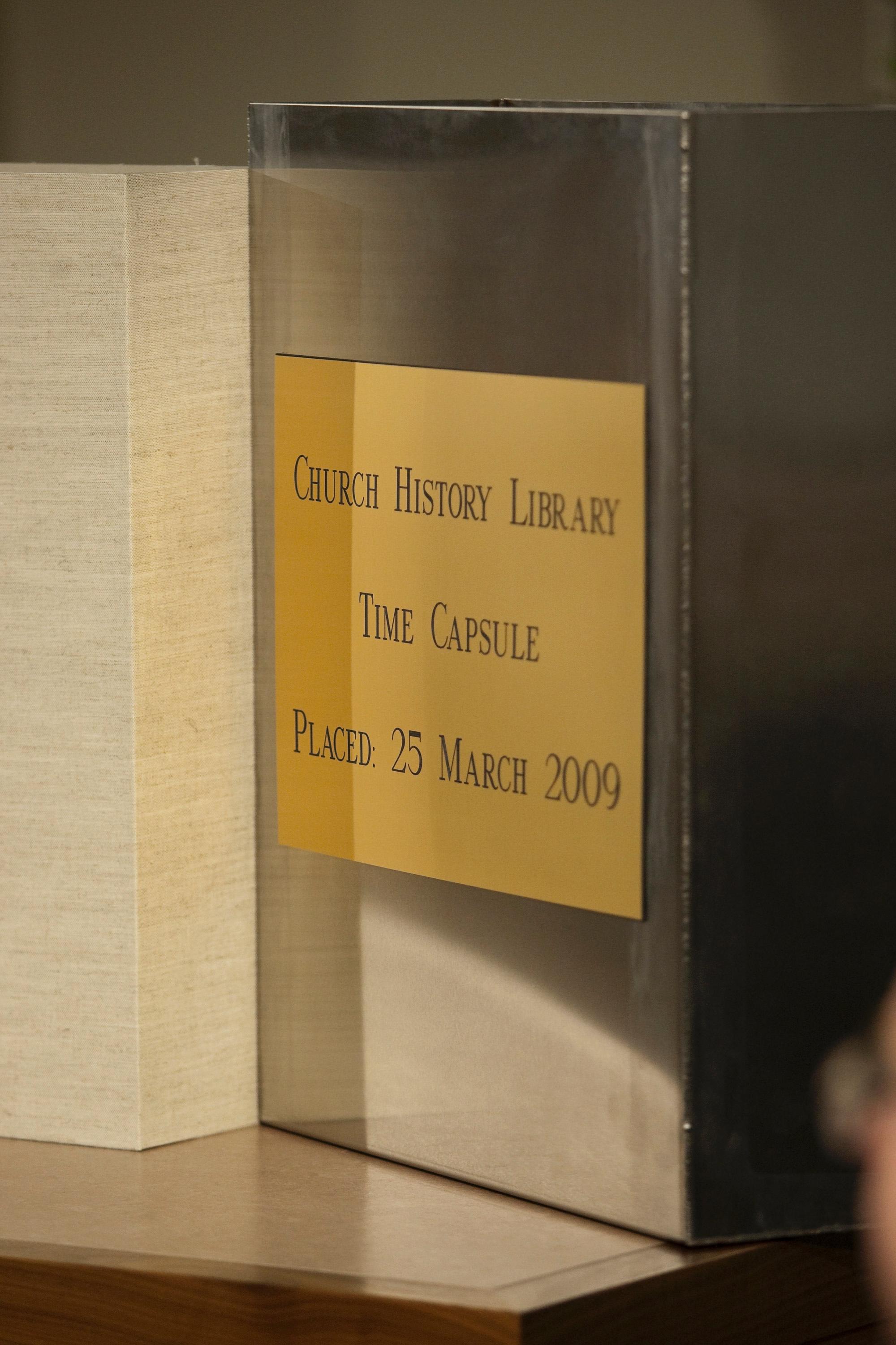 What the box will provide is a valuable “snapshot” in time of what the Church looked like in present day for those who might open the capsule in the far distant future. Other items that went into the 7-by-21-by-25-inch stainless steel container include photos of the First Presidency, Quorum of the Twelve, Quorums of Seventy and Presiding Bishopric; a Conference Report of the Solemn Assembly in which President Thomas S. Monson was sustained as Prophet, Seer and Revelator of the Church; a current edition of the scriptures accompanied with a list of the many languages in which they are now translated; a current list of stakes and missions; and a talk delivered at the recent Church History Symposium at Brigham Young University by Elder Marlin K. Jensen titled “Making a Case for Church History.”