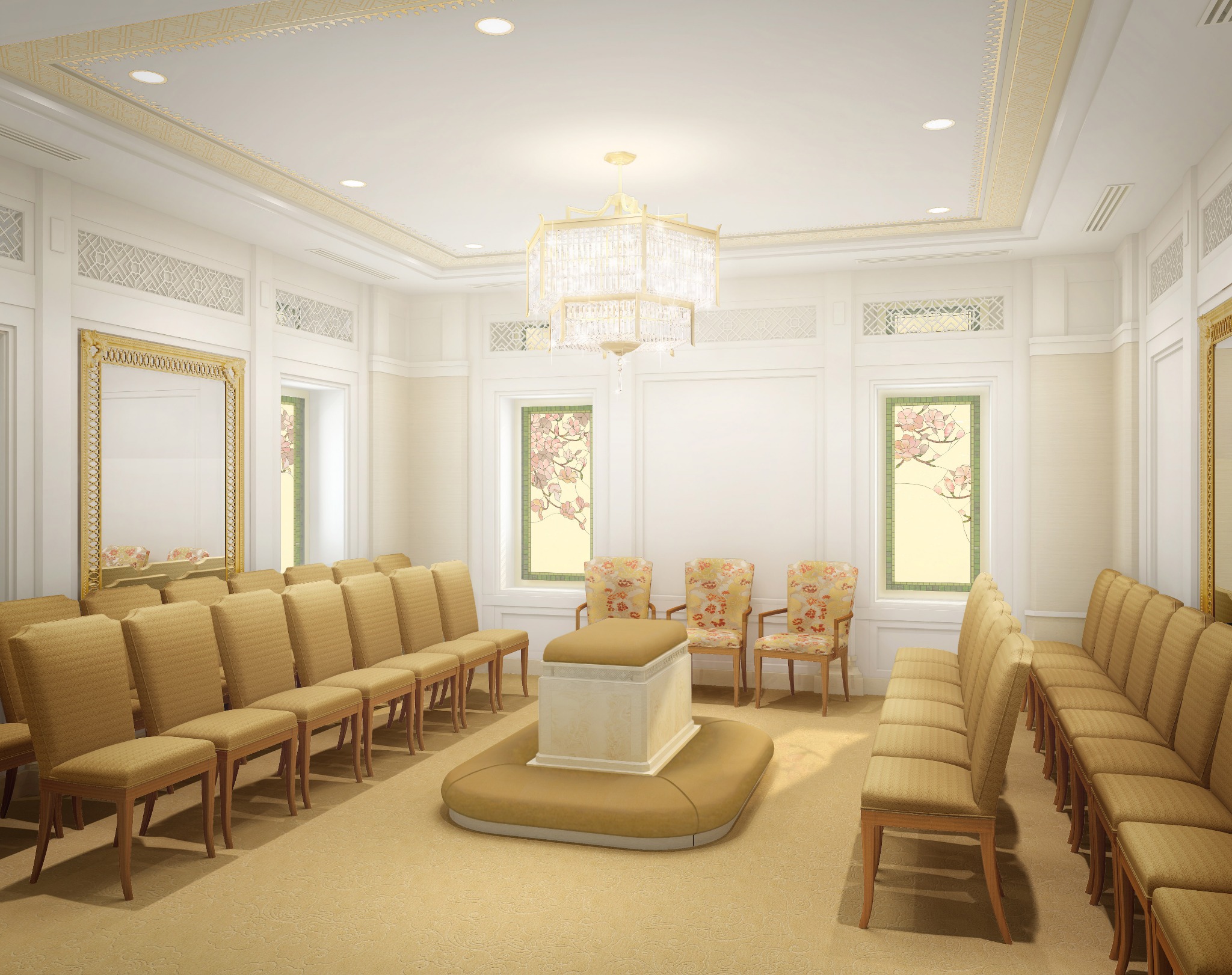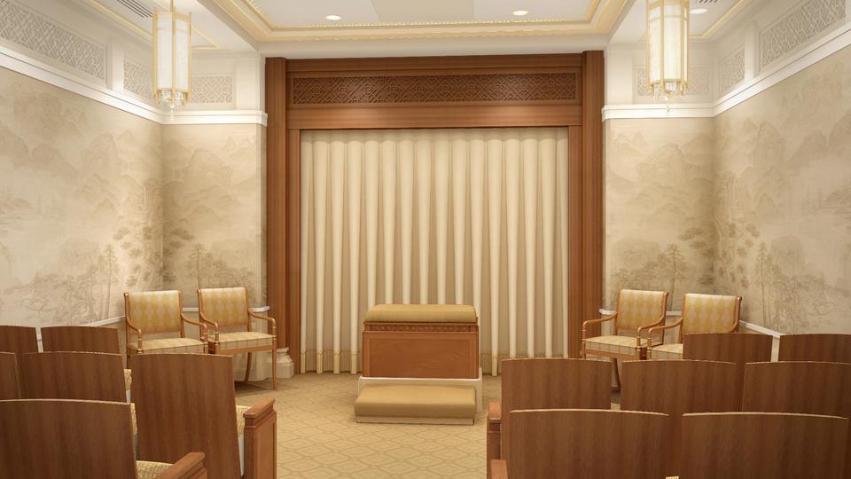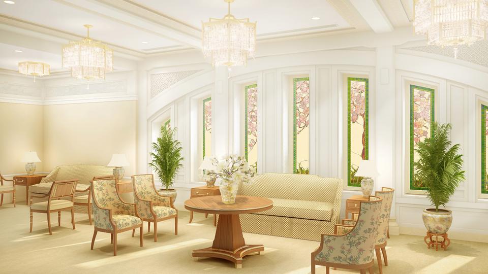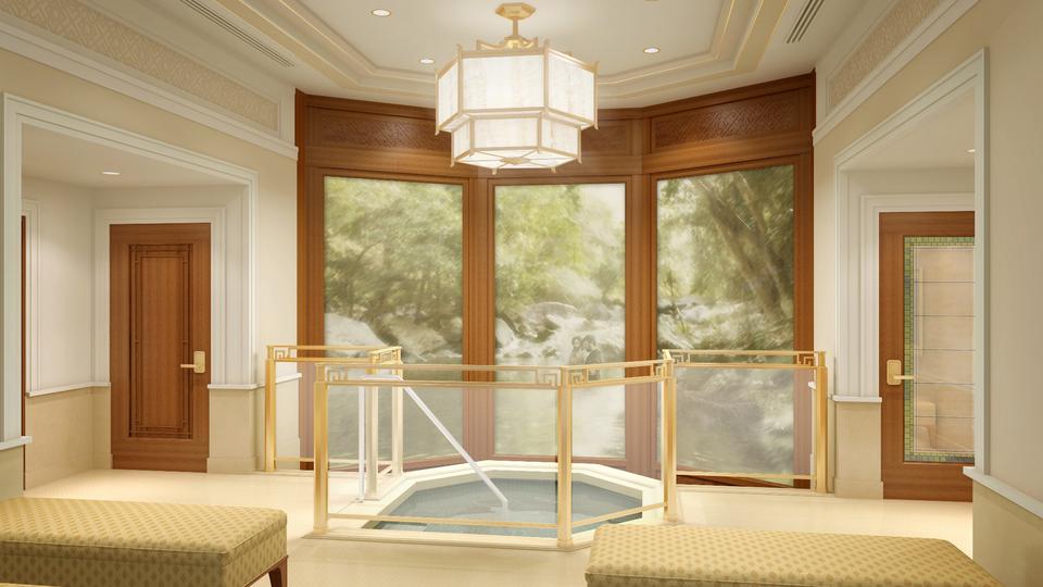 Workers will also take steps to strengthen the building against water and moisture. New art glass will be installed–adhering to the oriental design familiar to temple visitors–and new pieces of artwork and furniture will be added. The exterior landscaping and grounds will also be refreshed. The temple’s existing steeple will be removed.