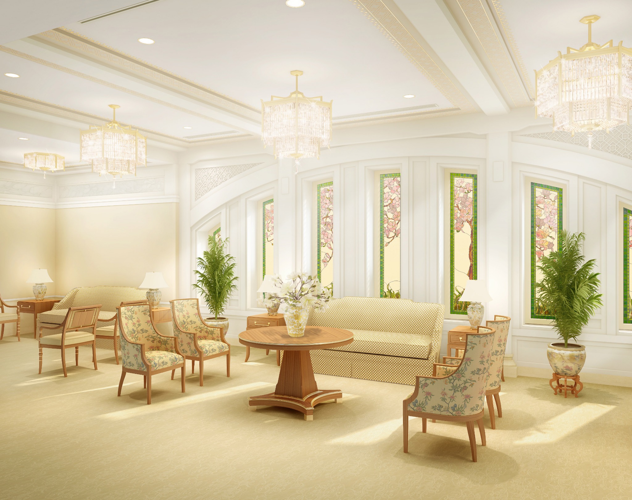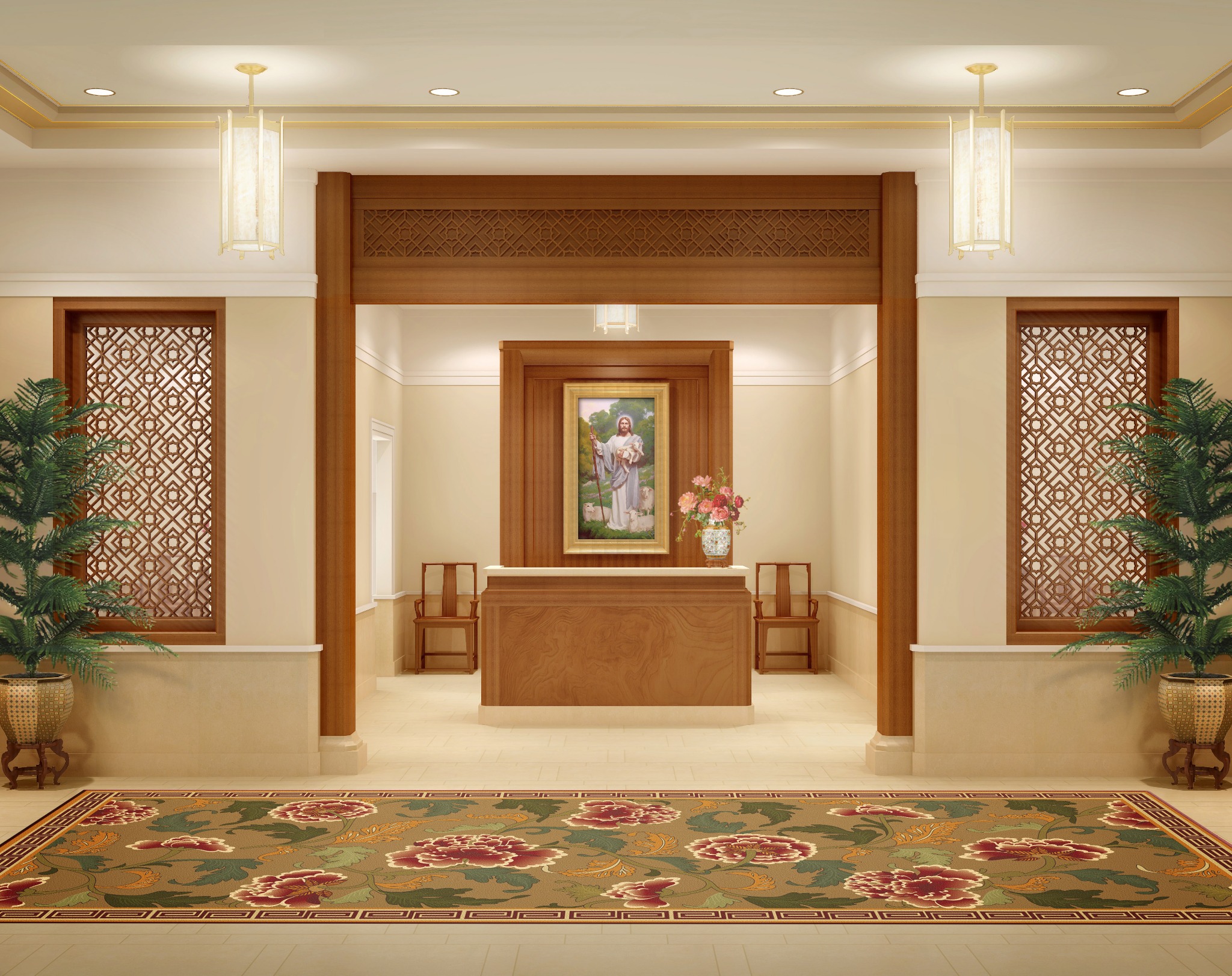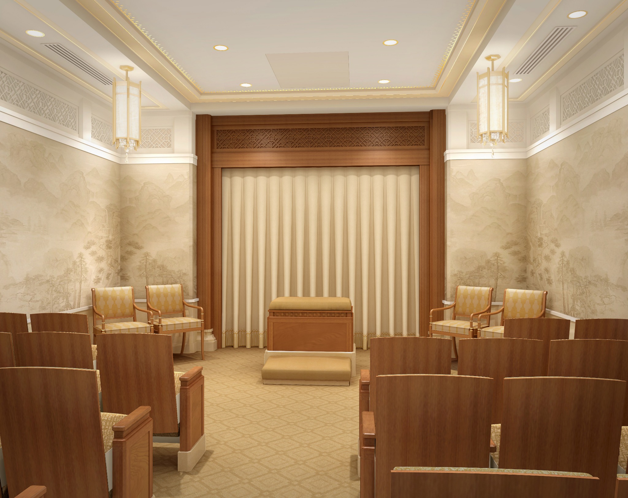 Workers will also take steps to strengthen the building against water and moisture. New art glass will be installed–adhering to the oriental design familiar to temple visitors–and new pieces of artwork and furniture will be added. The exterior landscaping and grounds will also be refreshed. The temple’s existing steeple will be removed.