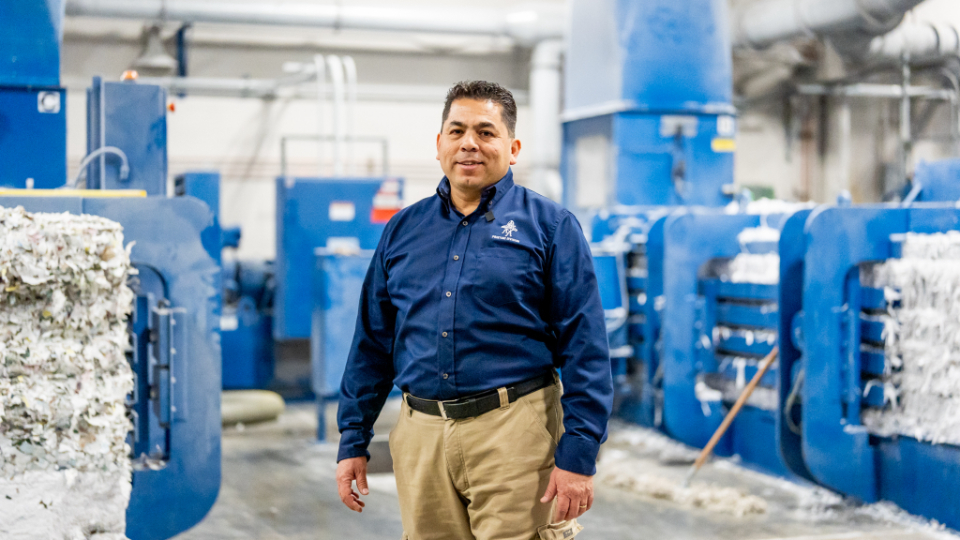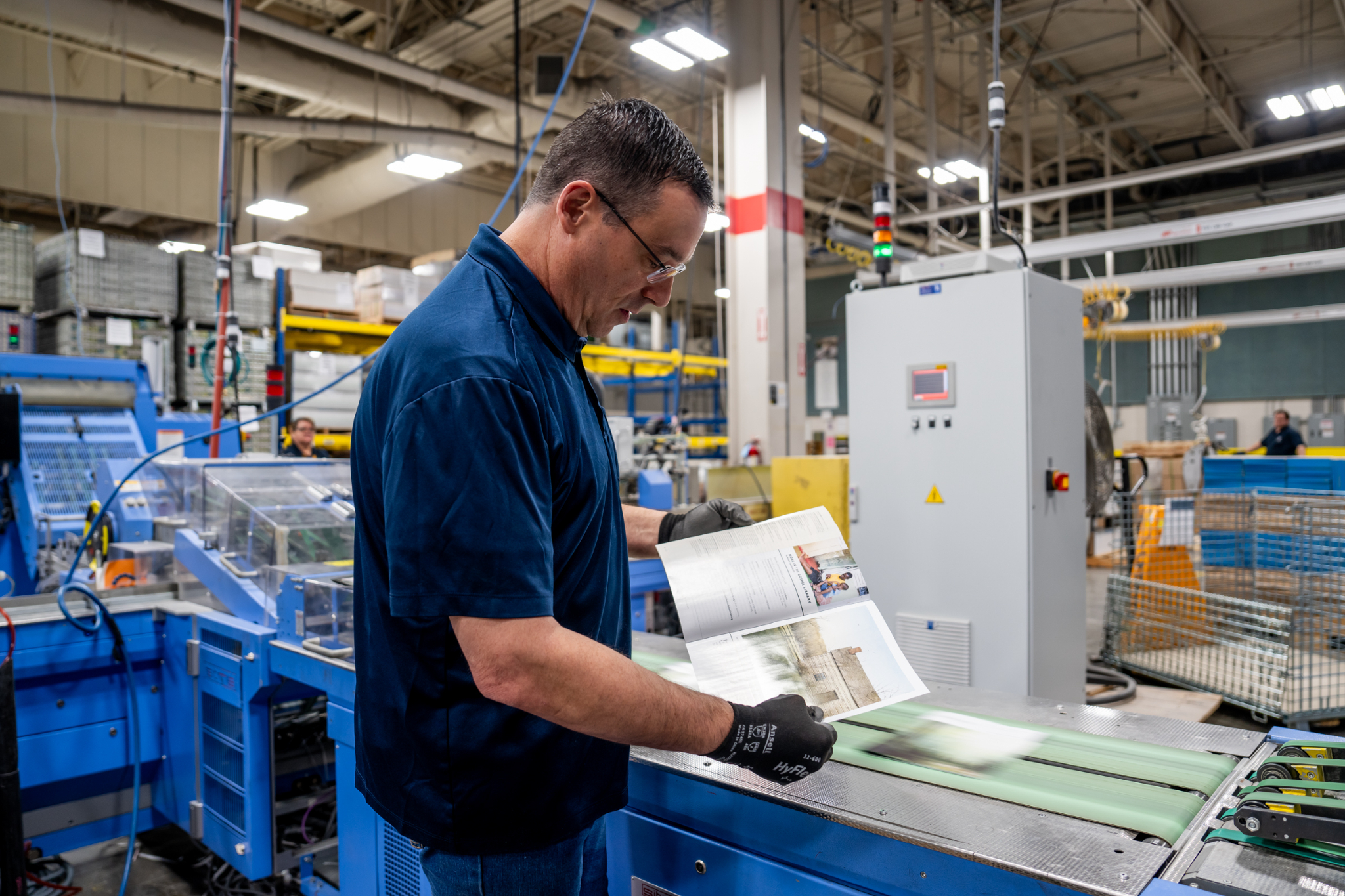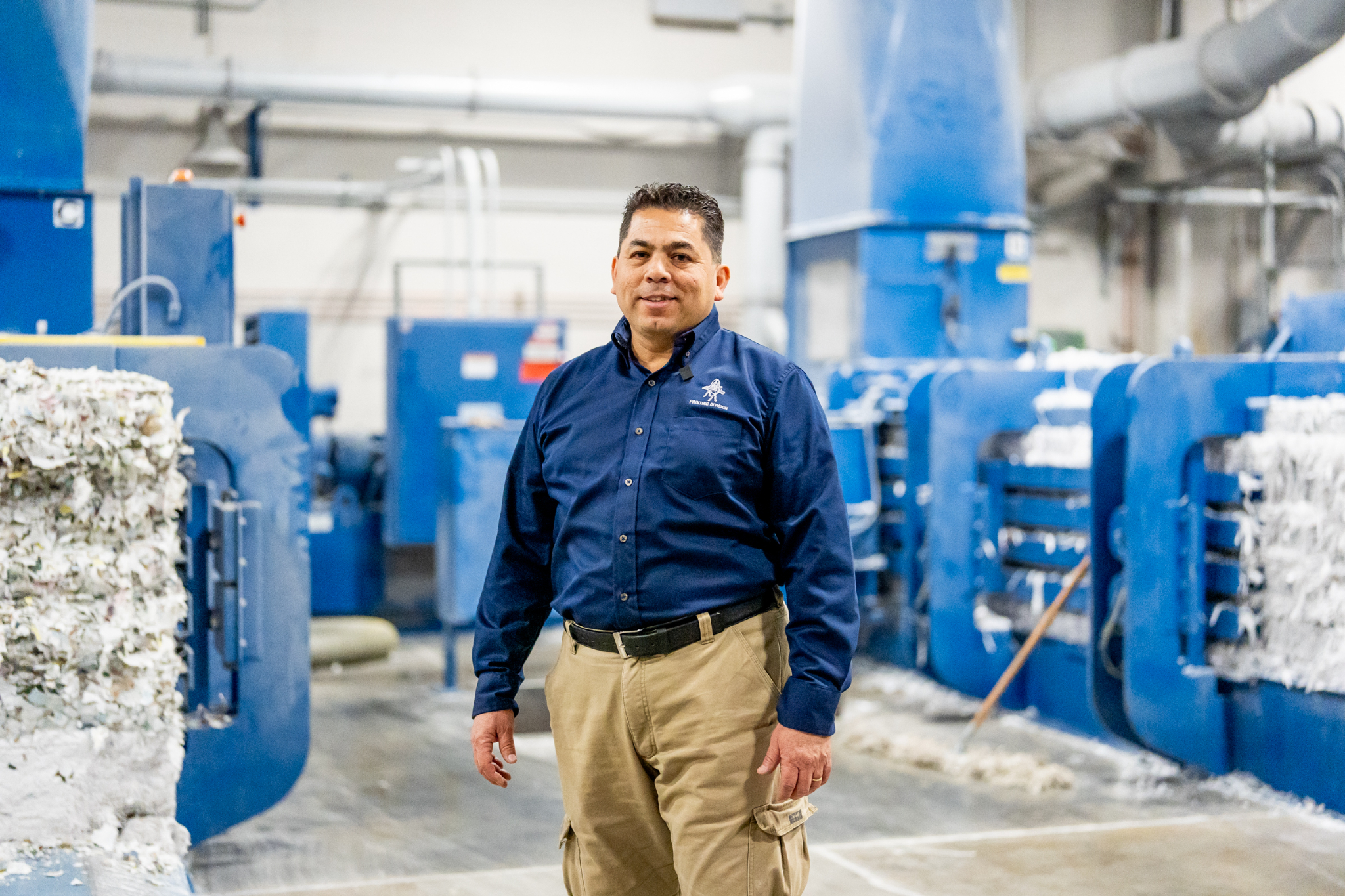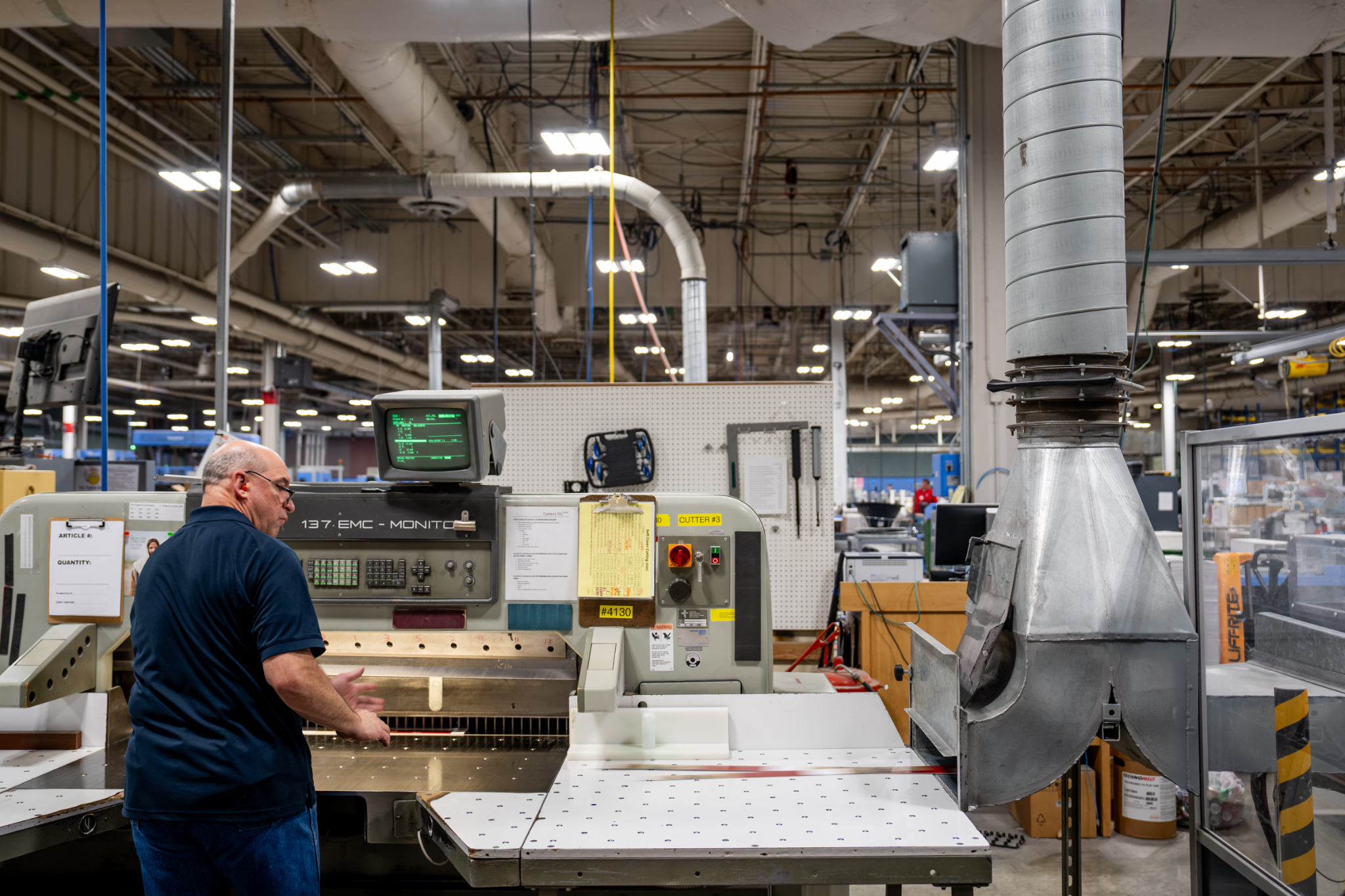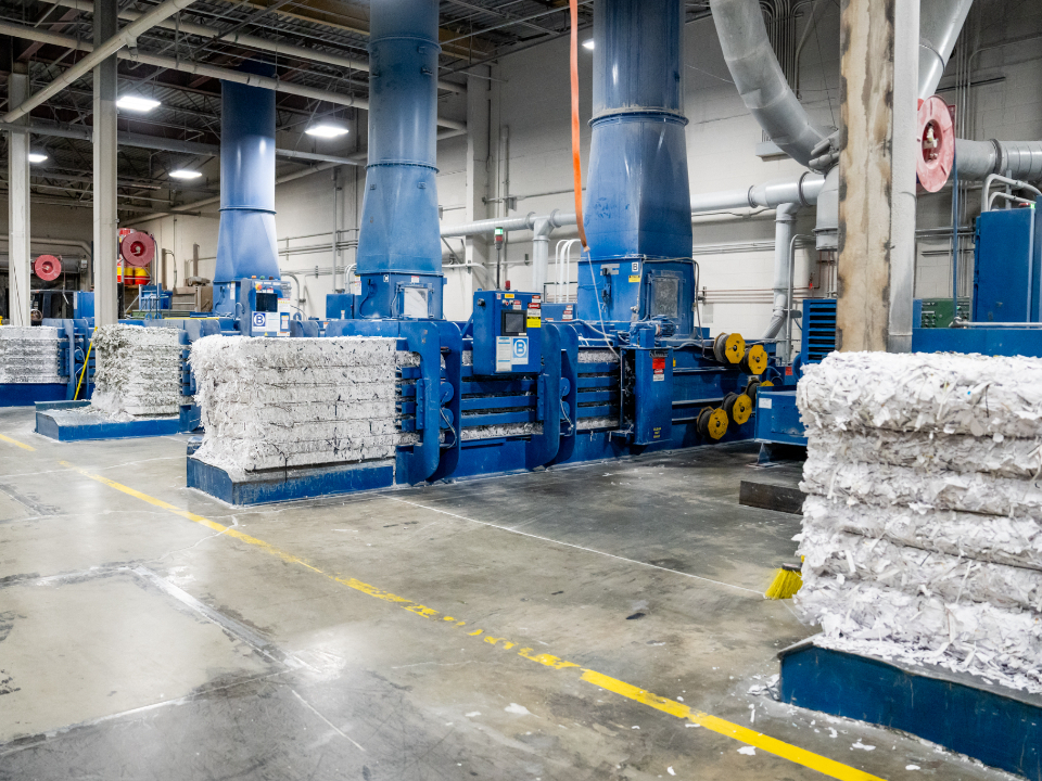 Stewardship begins at the Print Center using recycled materials, but it doesn’t stop there. Every scrap generated during the cutting, trimming and slicing processes is collected through a series of vacuums and ducts and sent to the baler room to be recycled. Even the dust generated by sanding is collected, compressed and repurposed. “And believe it or not, we make bales of just dust,” explained Felipe Rivera, Print Center maintenance supervisor.