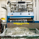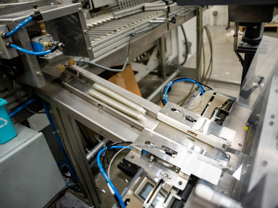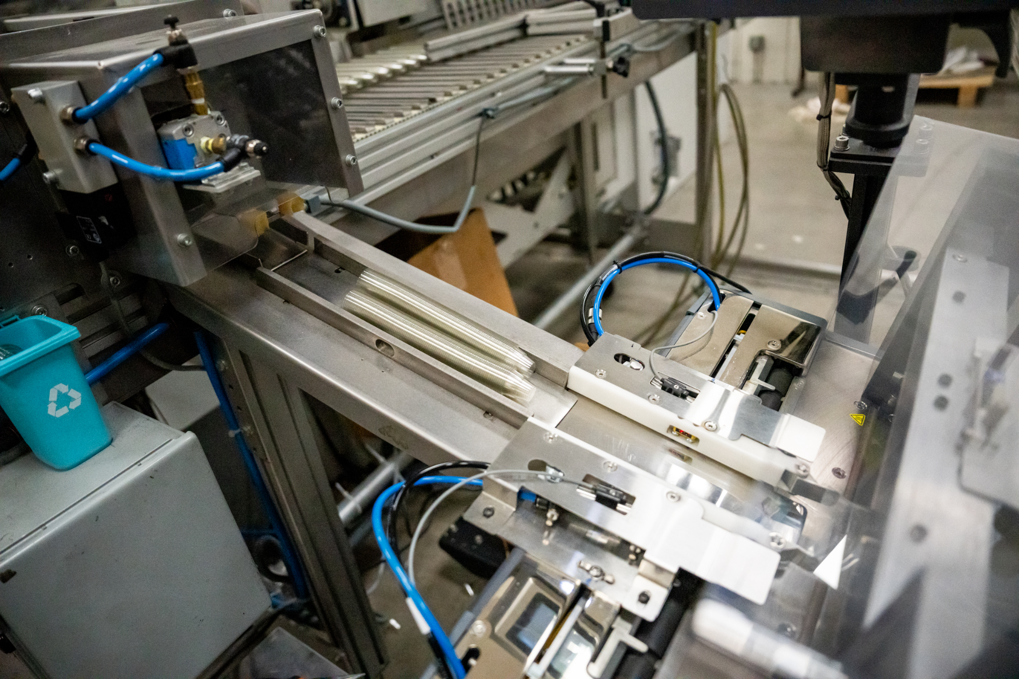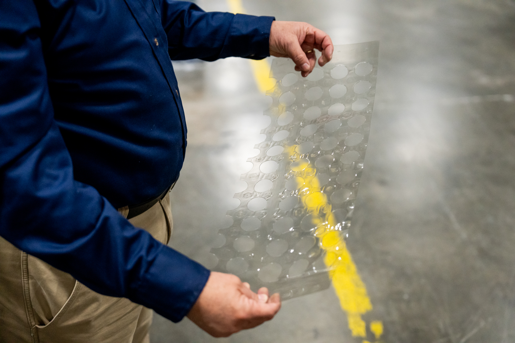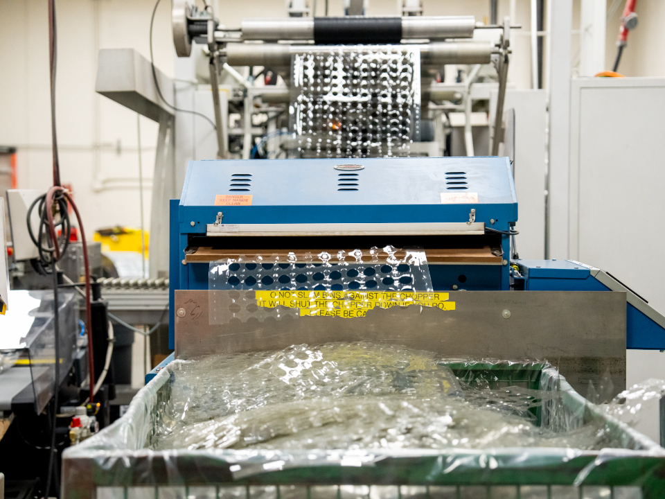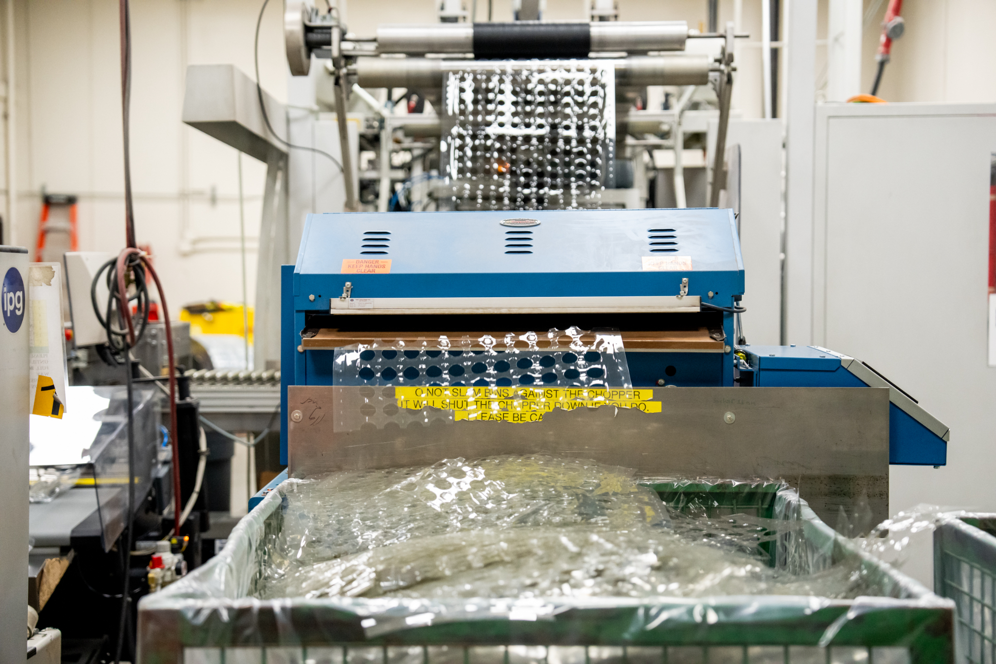 One hundred percent recycled, food-grade plastic is heated and cut to produce sacrament cups at the Print Center of The Church of Jesus Christ of Latter-day Saints in Salt Lake City, Utah, in December 2024. All excess material is sent to be recycled.2025 by Intellectual Reserve, Inc. All rights reserved.