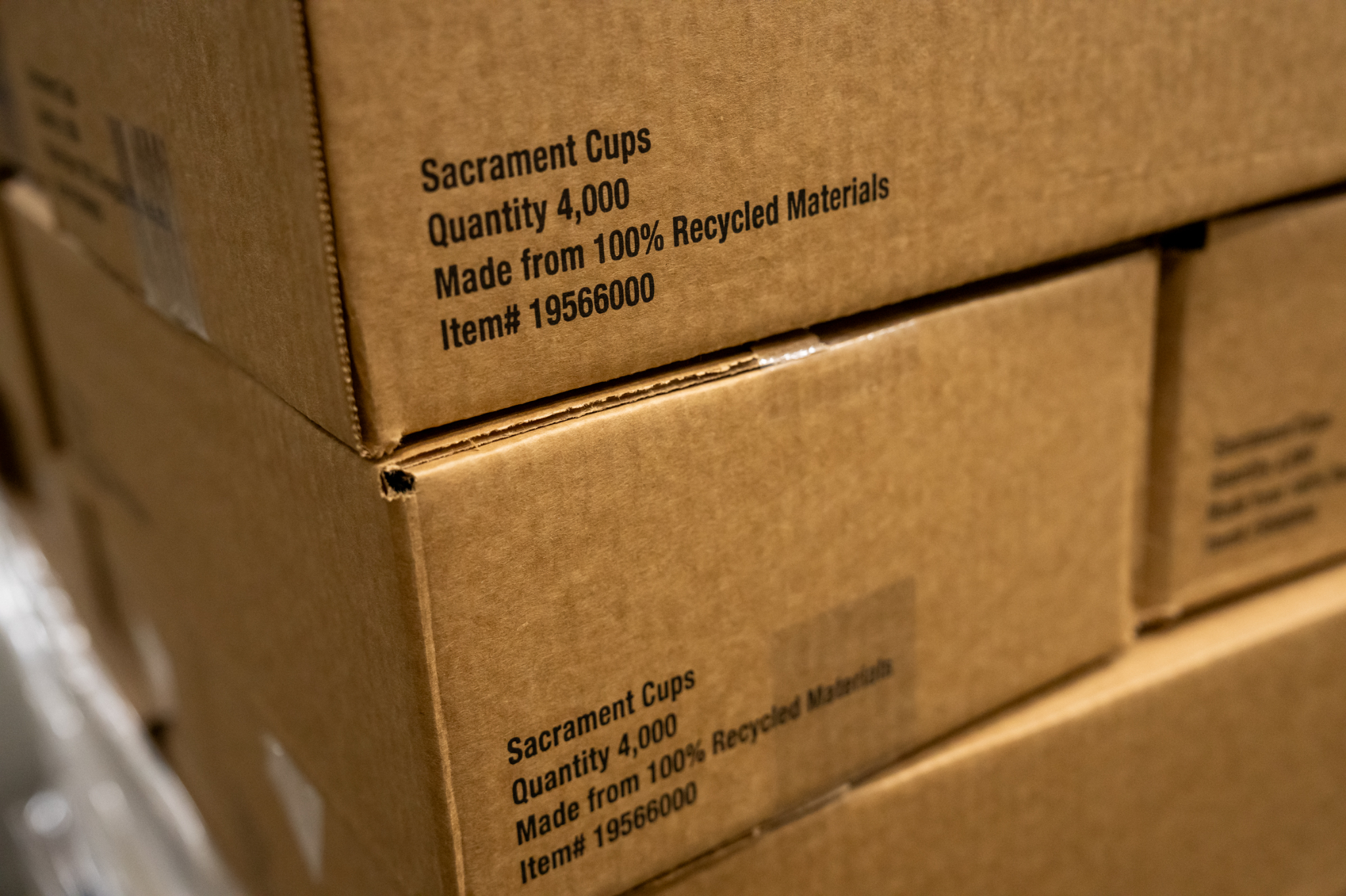 The sacrament, a weekly ordinance held on the Sabbath Day where bread and water are shared in remembrance of Jesus Christ, uses individual cups. These cups are produced at the Print Center from 100% recycled plastic, and after worship, they can be fully recycled where local municipalities allow. Excess plastic from the production of these cups is also recycled.