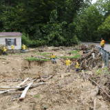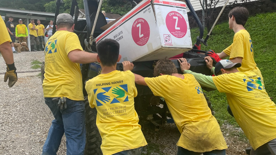 The Church of Jesus Christ sent five semitruck loads of food and supplies within a week after the flooding. Latter-day Saint volunteers joined with local firefighters and members of the Kentucky National Guard to unload the trucks and begin the massive cleanup efforts in early August.