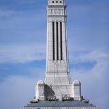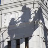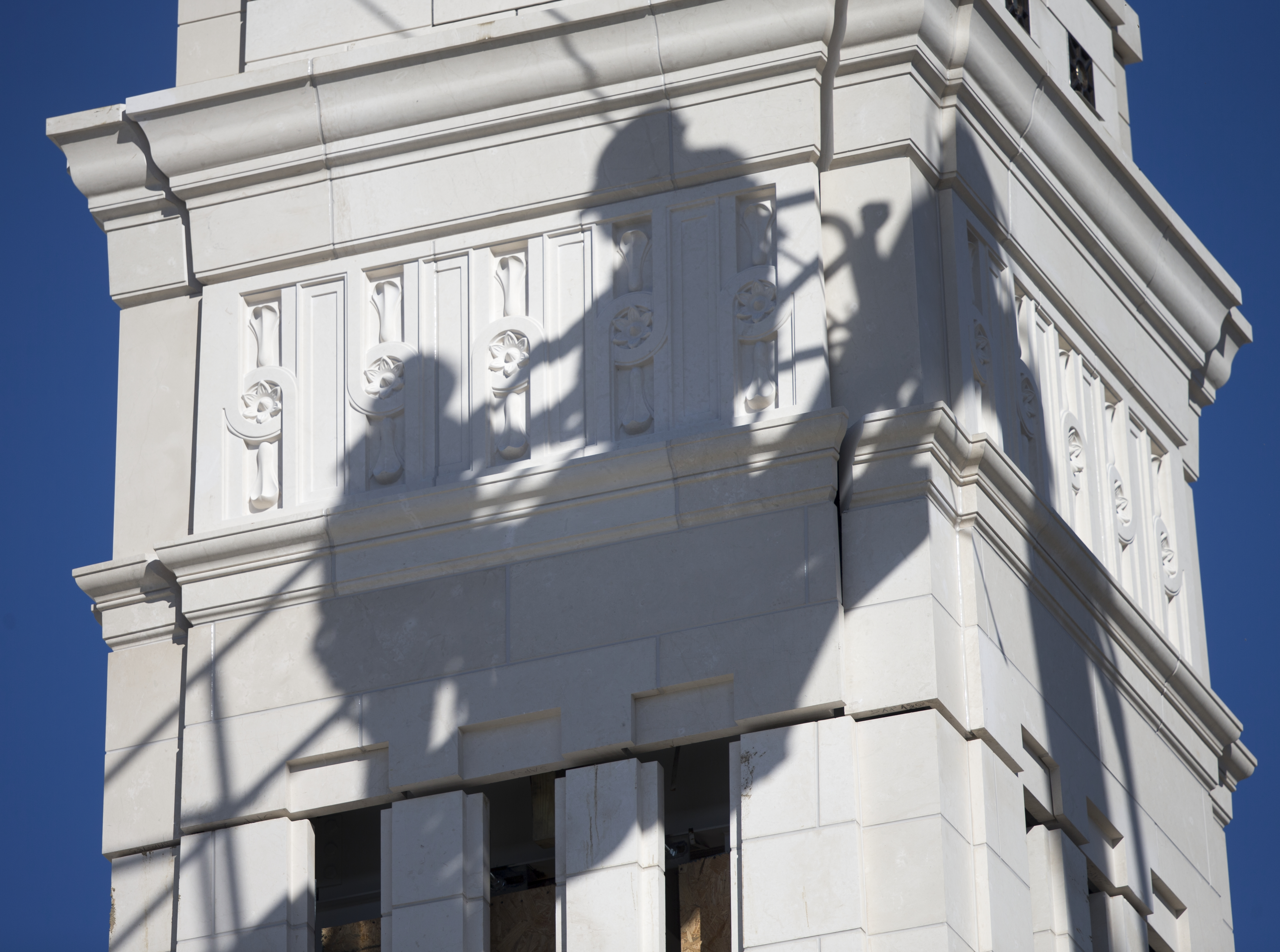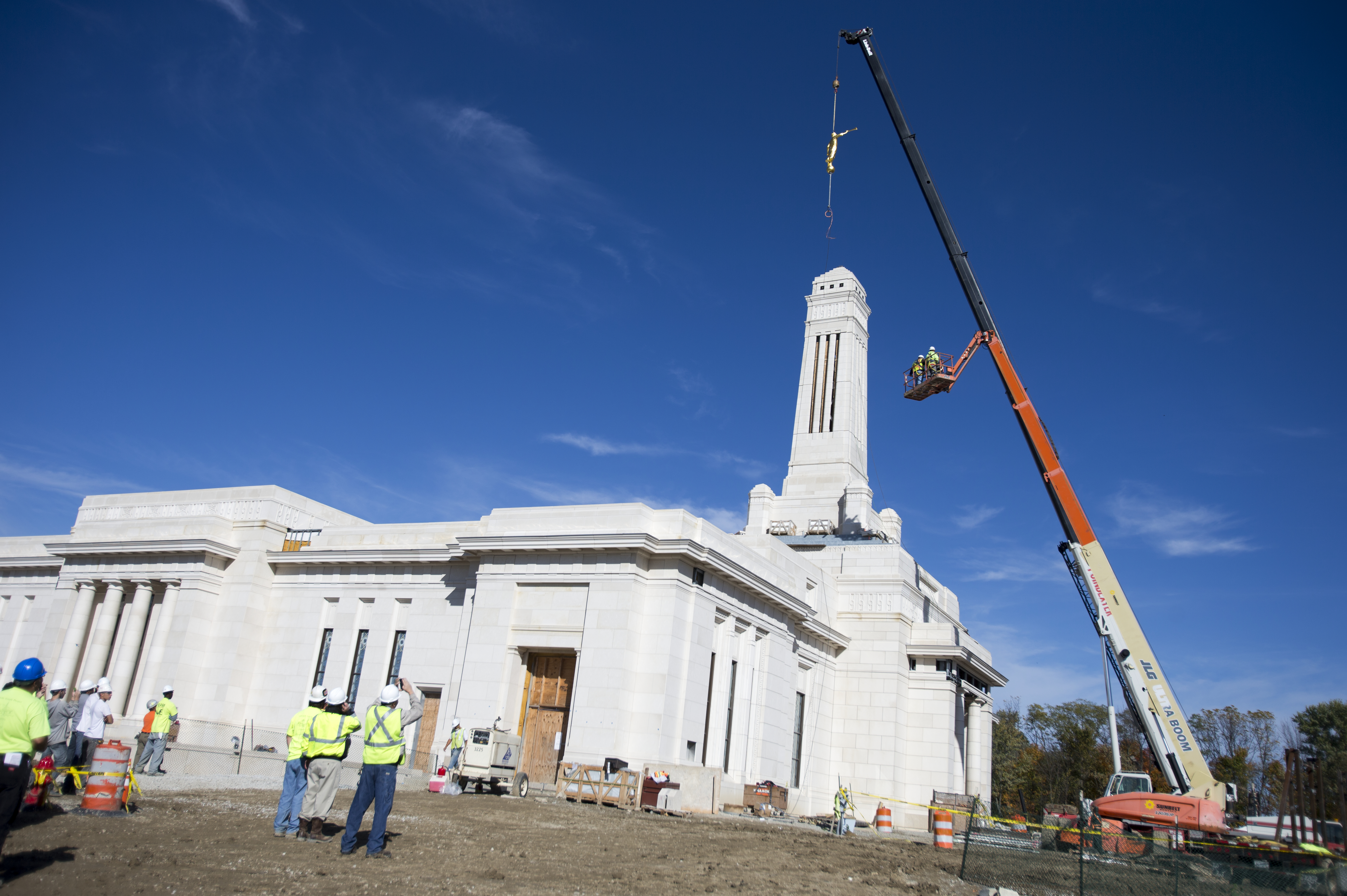 Shadows of construction workers during placement of the angel Moroni on top of the Indianapolis Indiana Temple.
