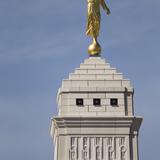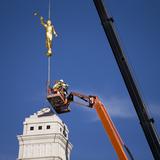 The angel Moroni statue is secured in place on the Indianapolis Indiana Temple about 106 feet above the ground.