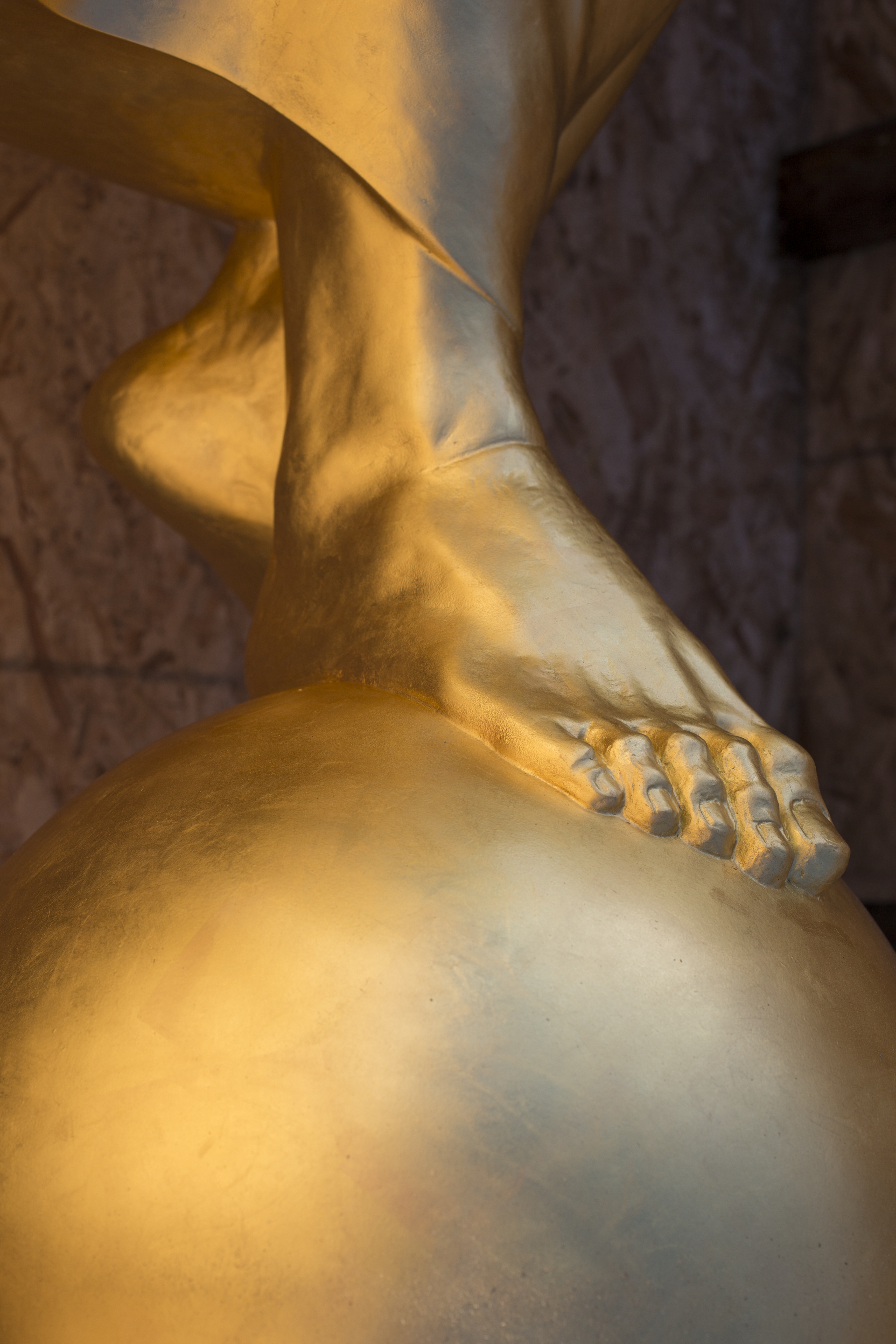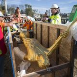 The angel Moroni statue is delivered carefully wrapped in a wooden crate.