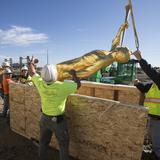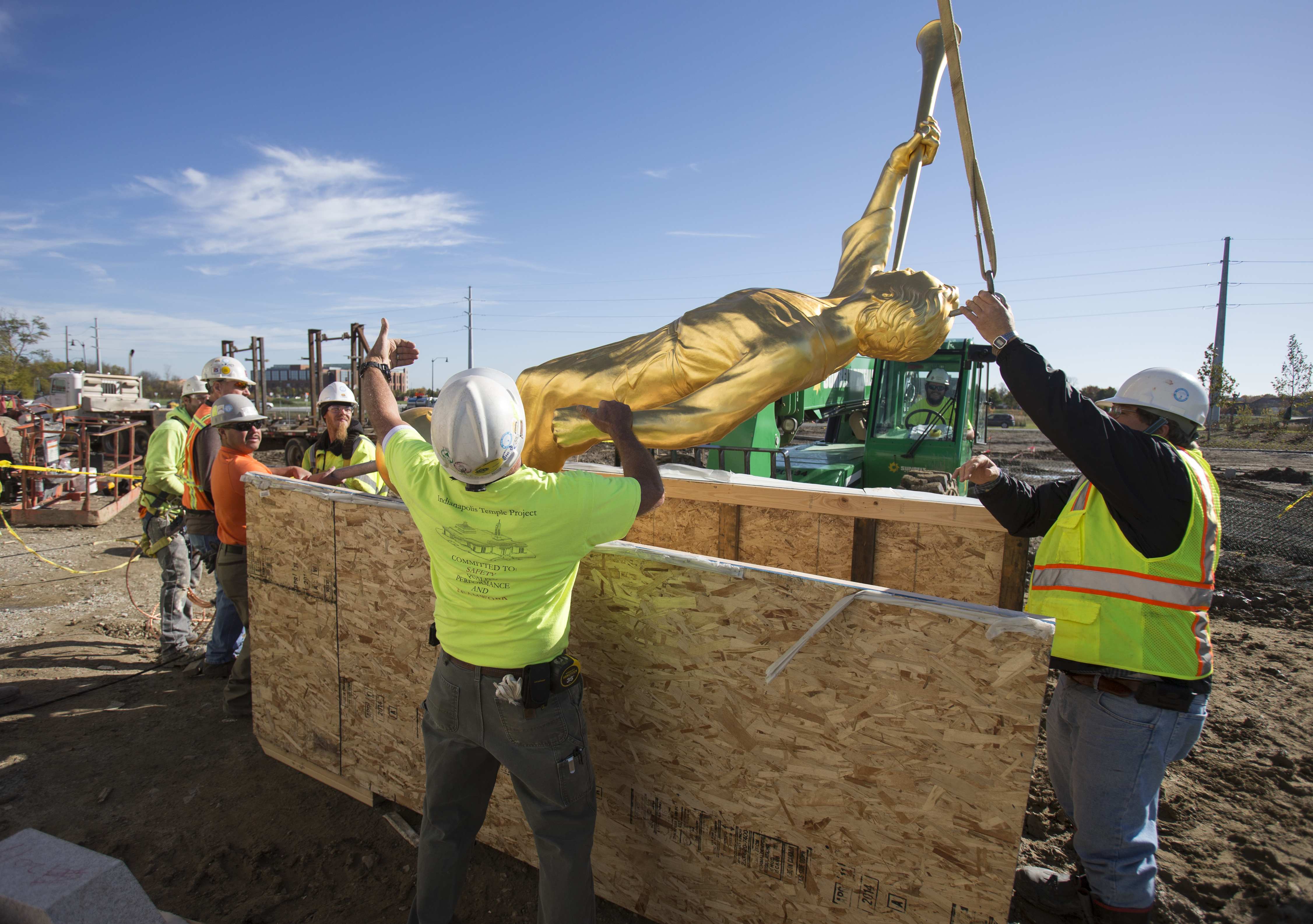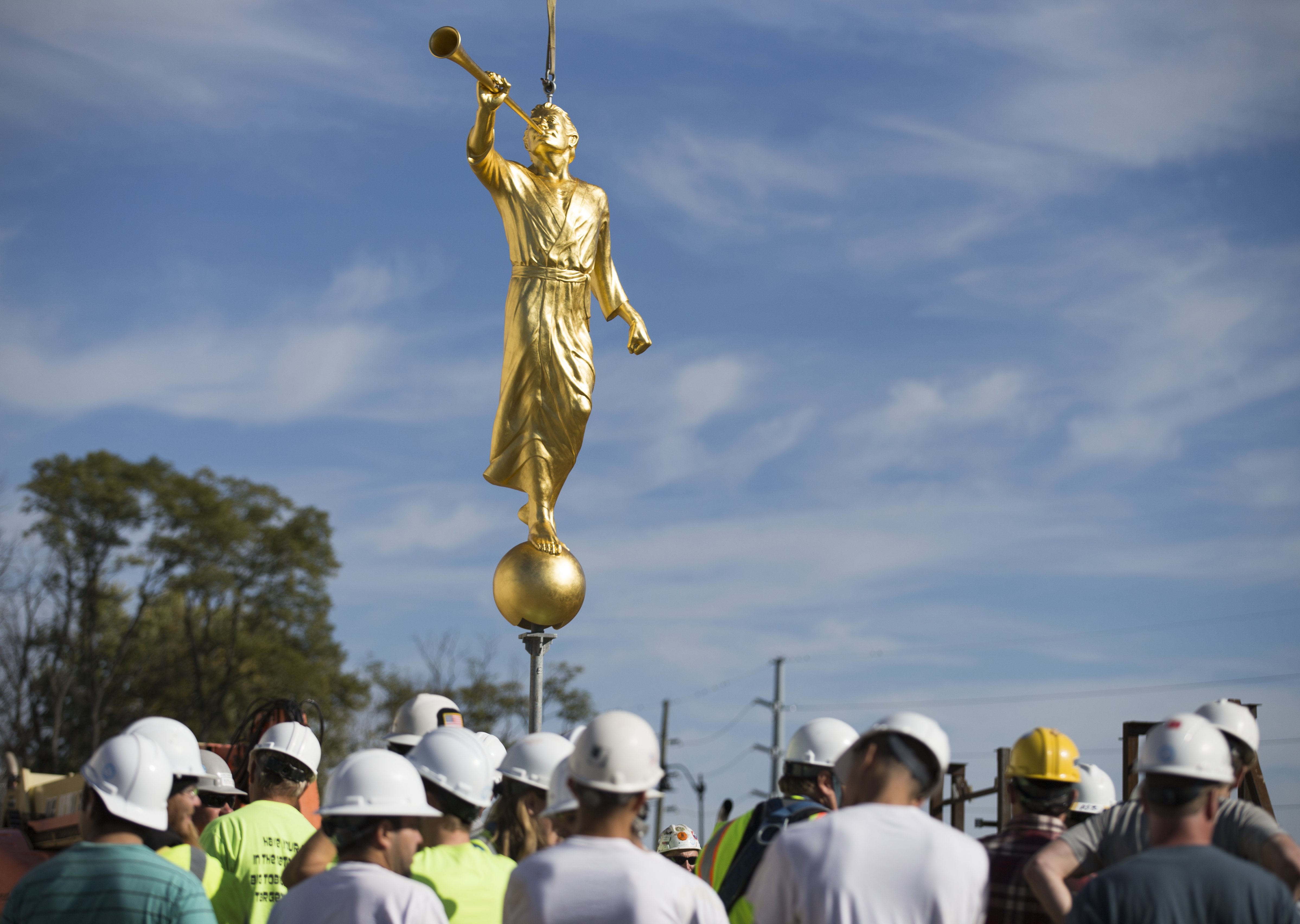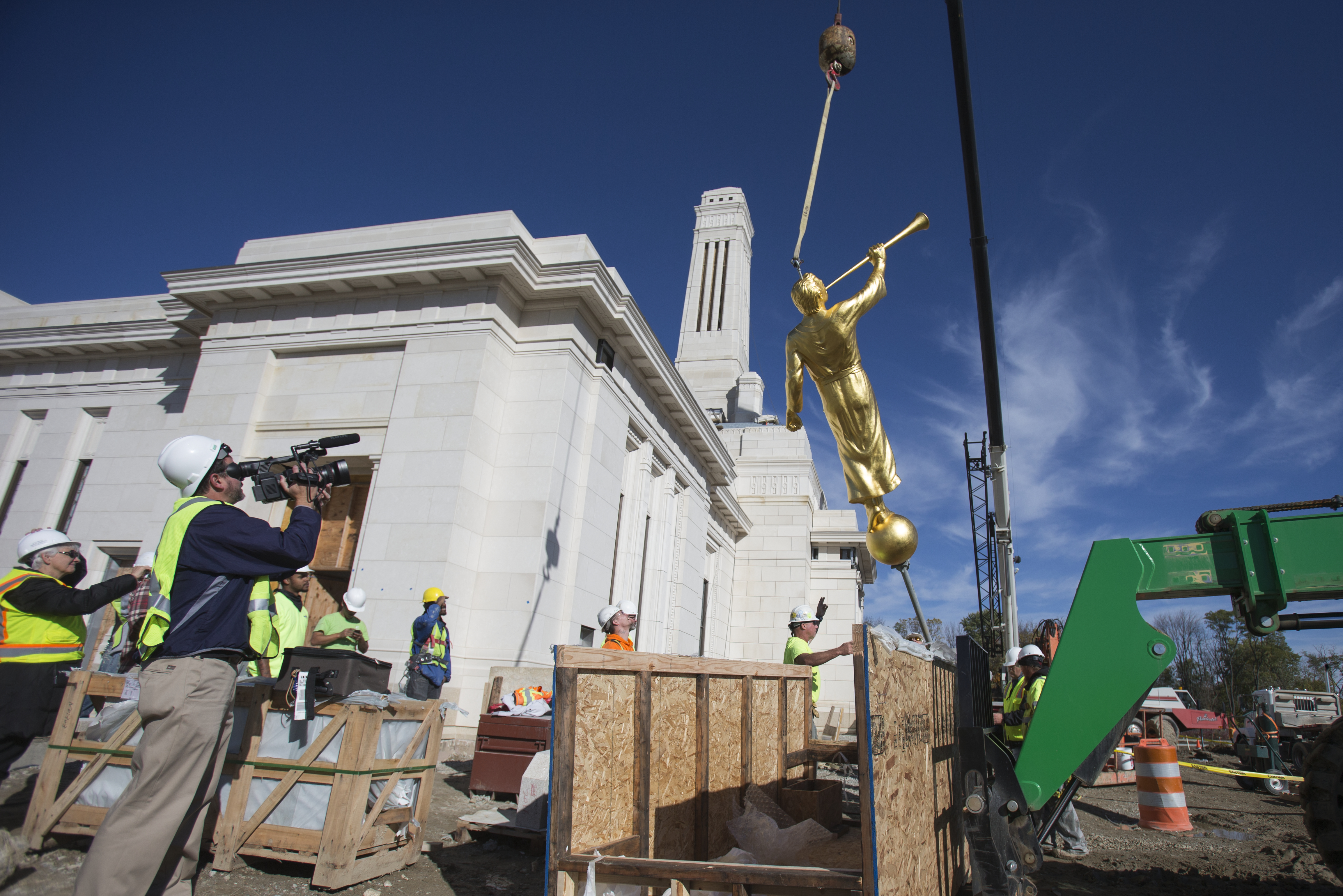 Once out of the wooden crate, the angel Moroni statue is lifted high in the air as an audience of construction workers, Church leaders and neighbors watch.