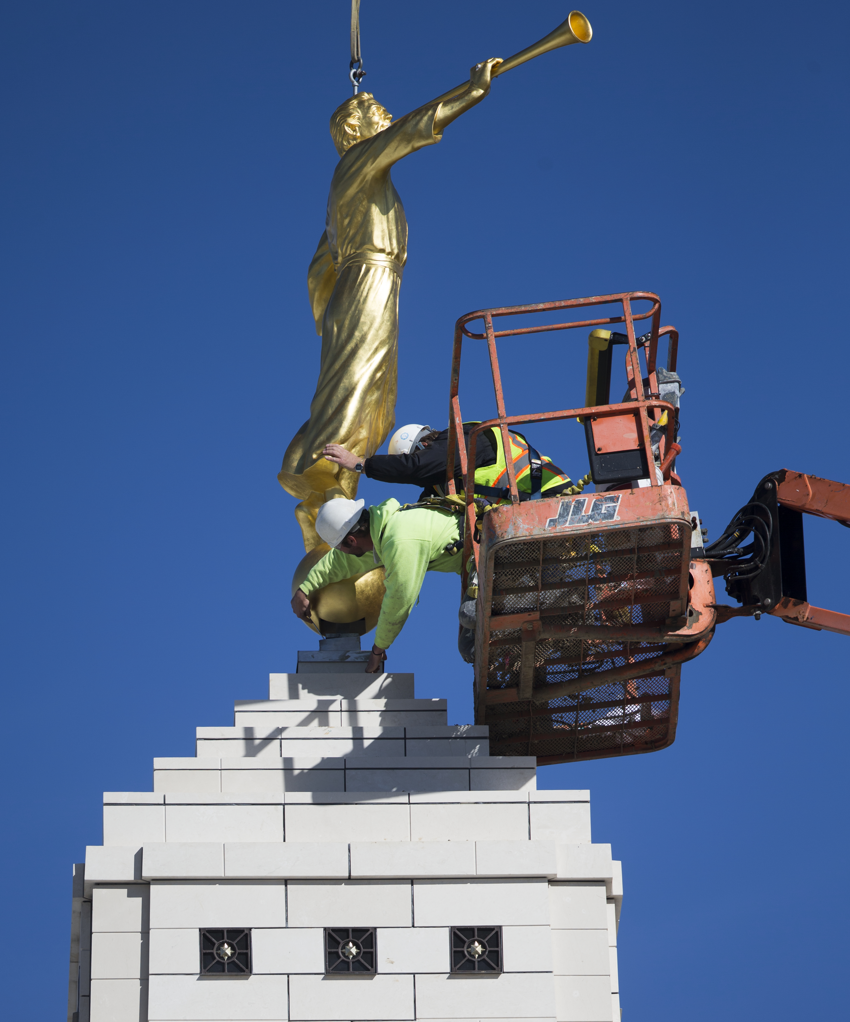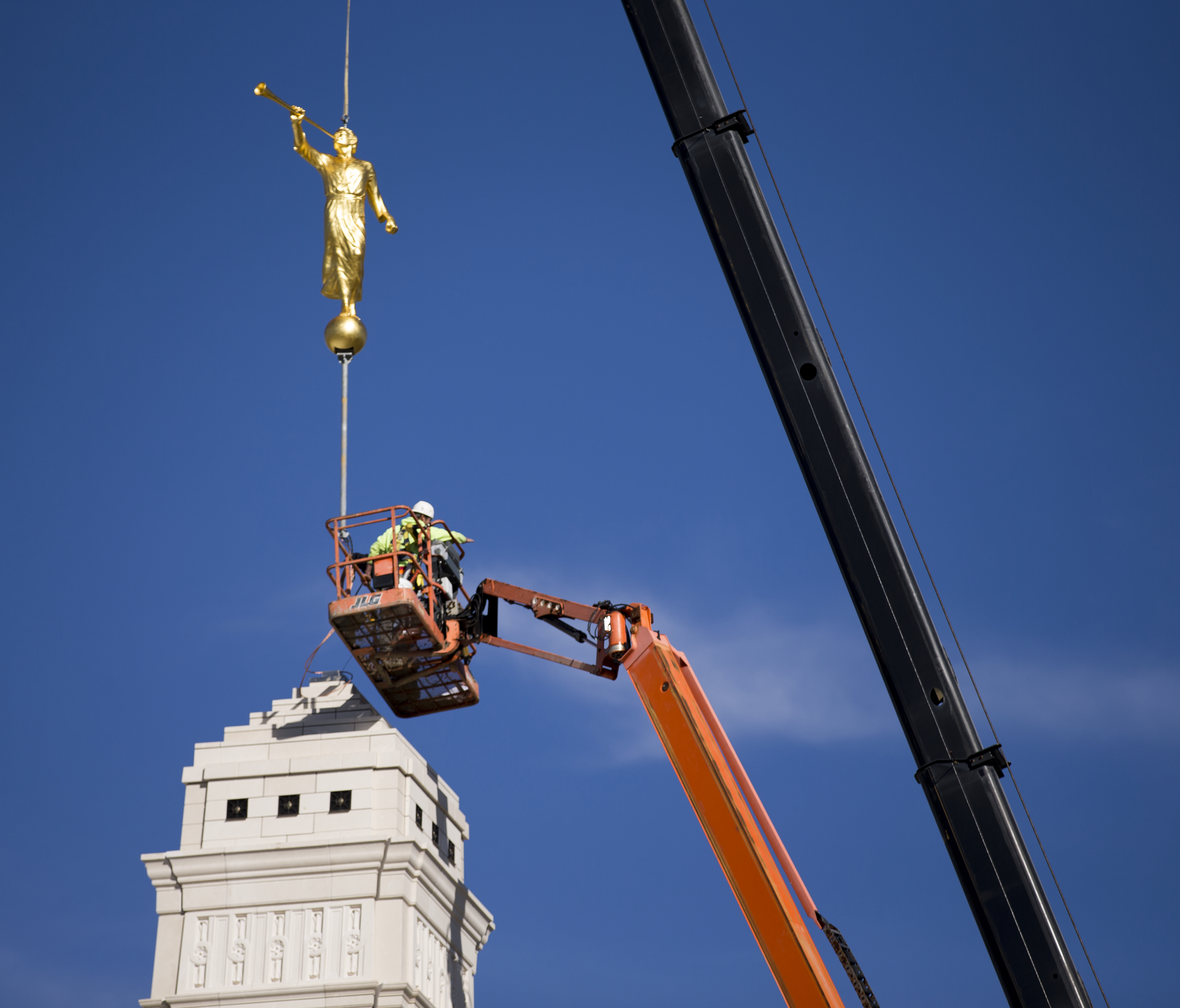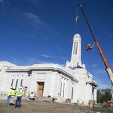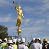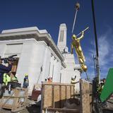 The 400-pound statue of the angel Moroni was lifted in place Friday morning, 17 October 2014.