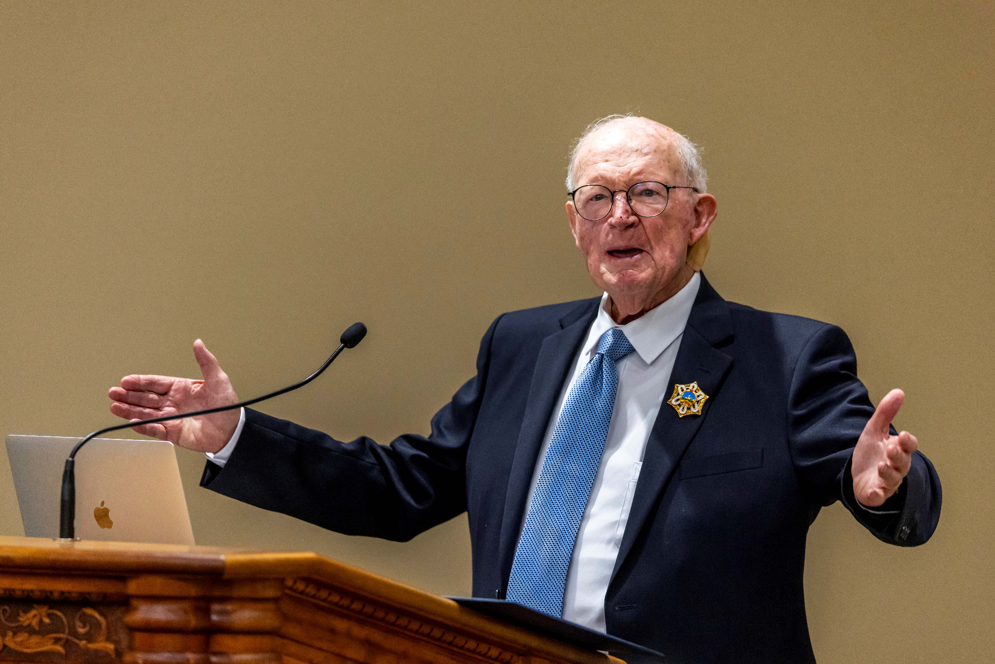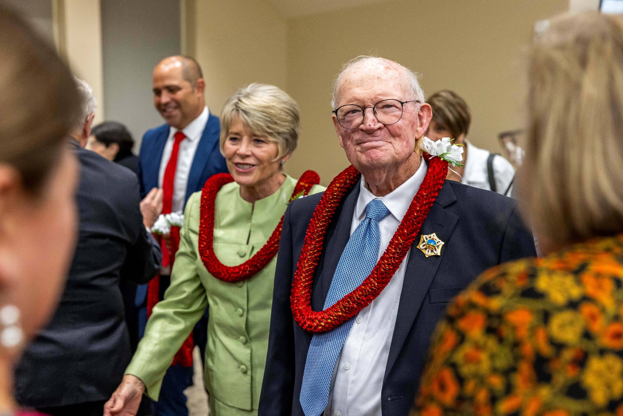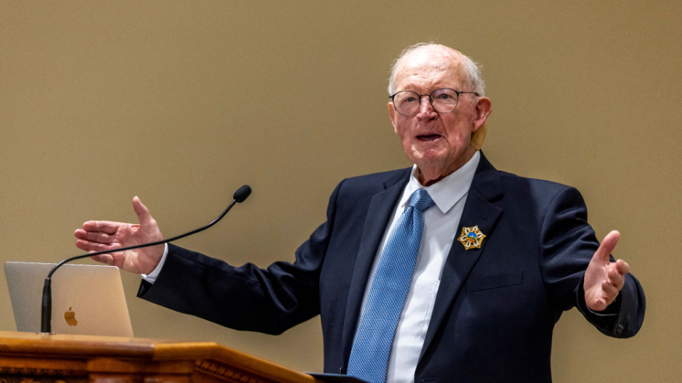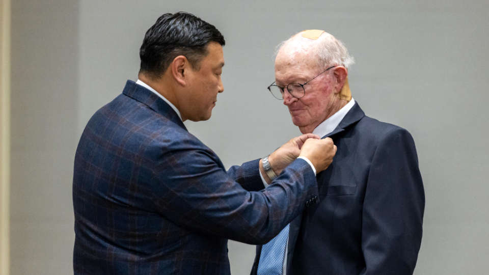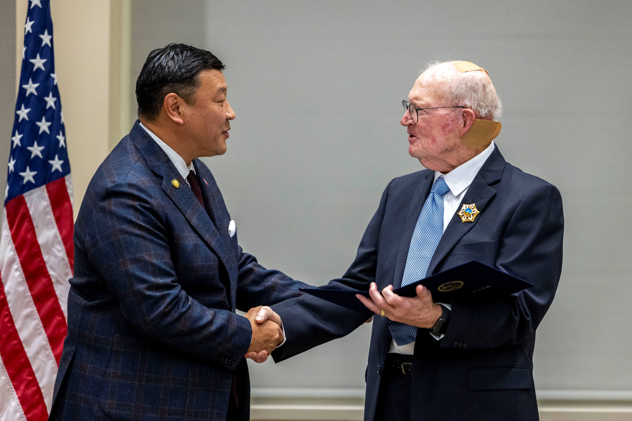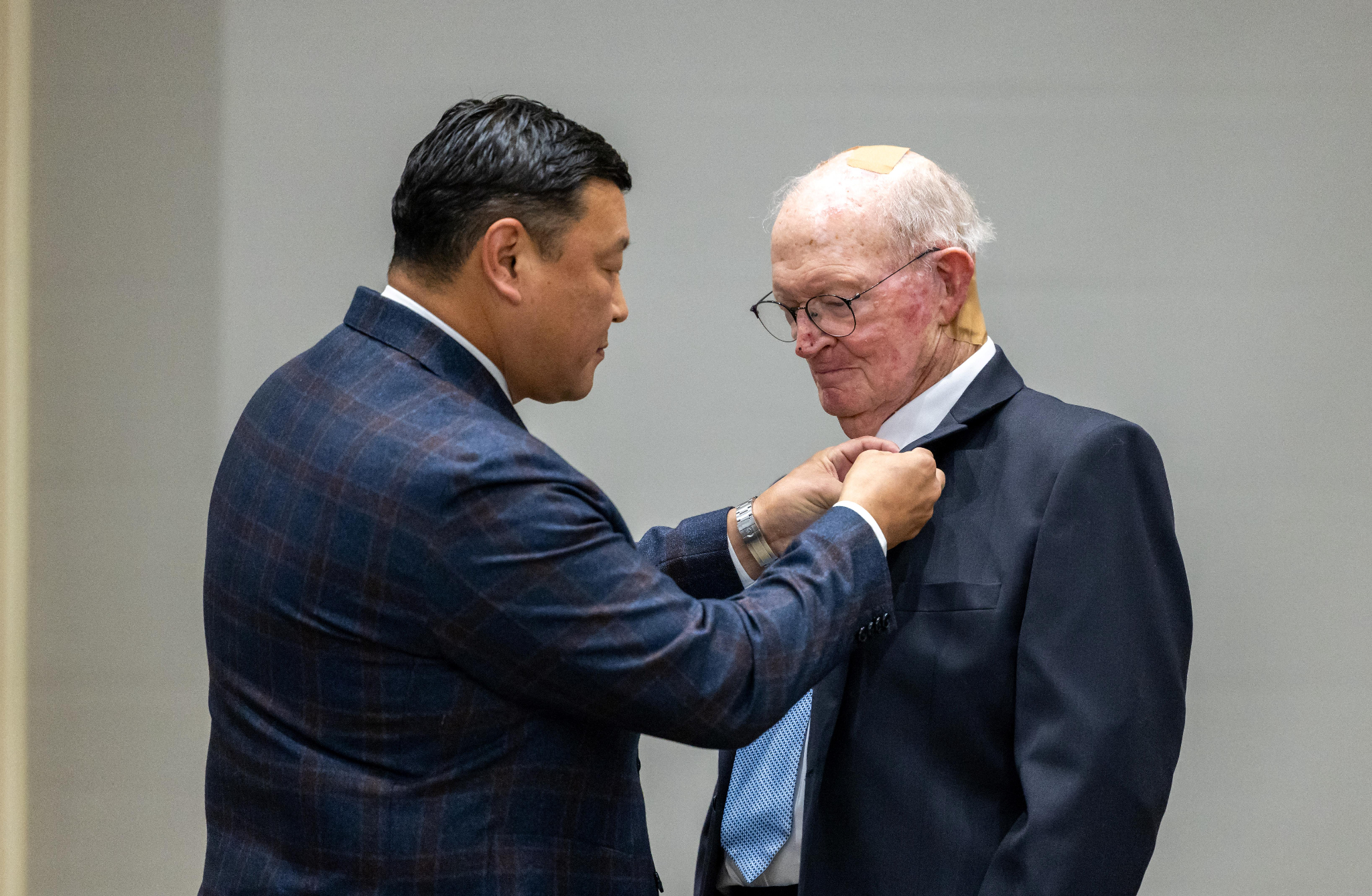 His Excellency Batbayar Ulziidelger, Mongolian ambassador to the U.S., presents Elder Richard E. Cook, an emeritus General Authority Seventy, with Mongolia's Order of the Polar Star, the country's highest award given to a foreign citizen, on Friday, October 13, 2023.Elder Cook was recognized at the Hinckley Center at BYU for his impact in Mongolia and for organizing educational funds for hundreds of young adult men and women to receive a higher education at BYU–Hawaii.