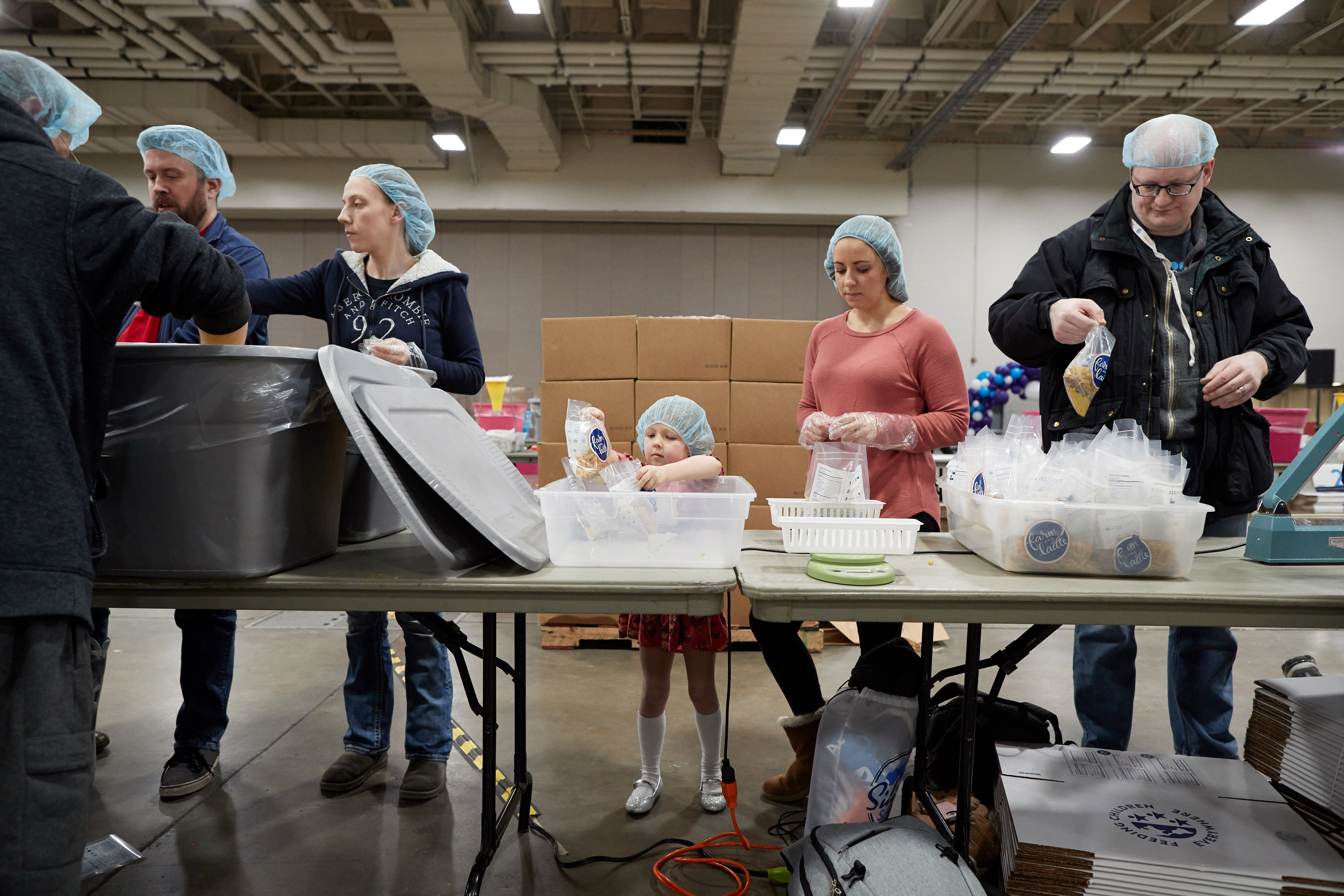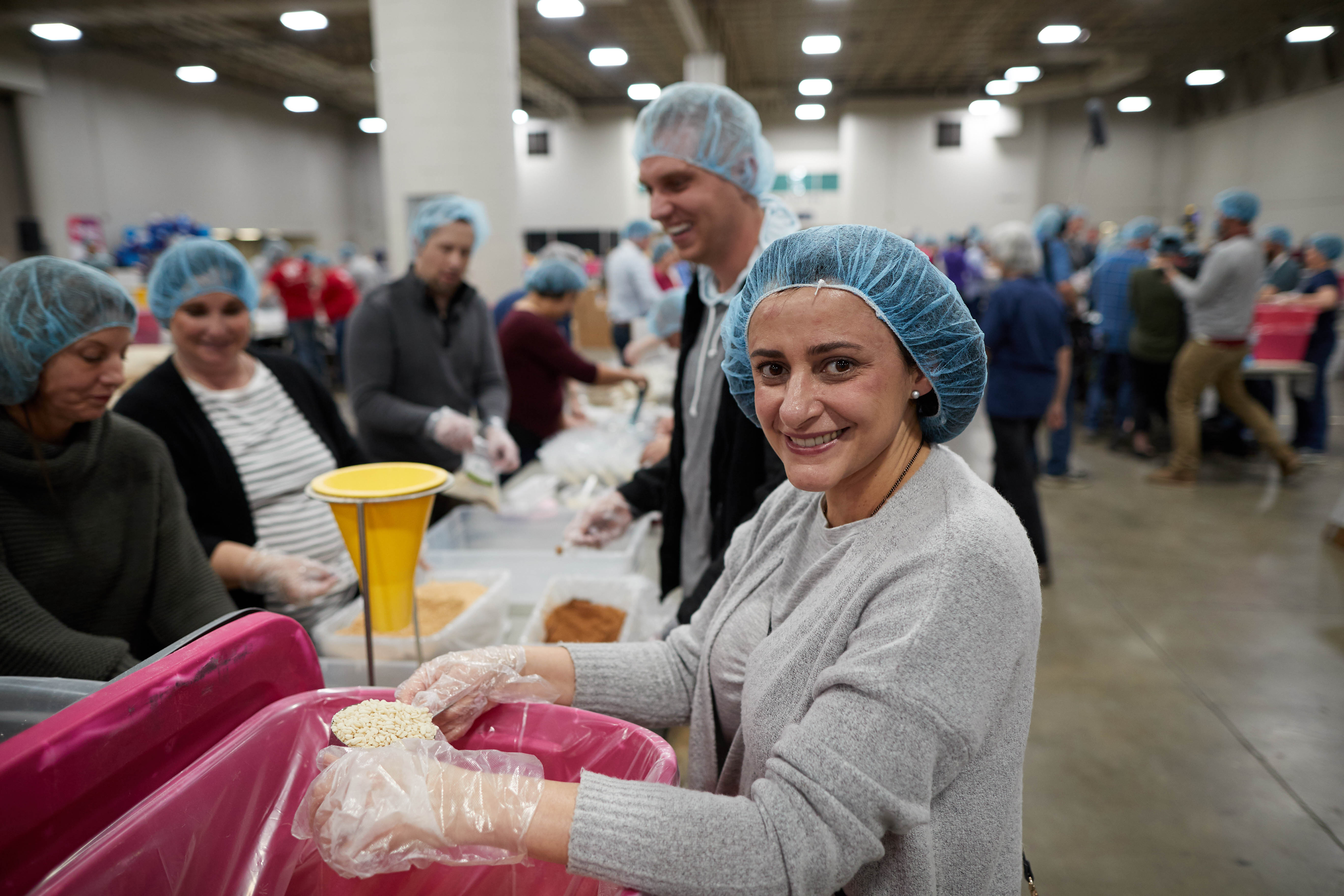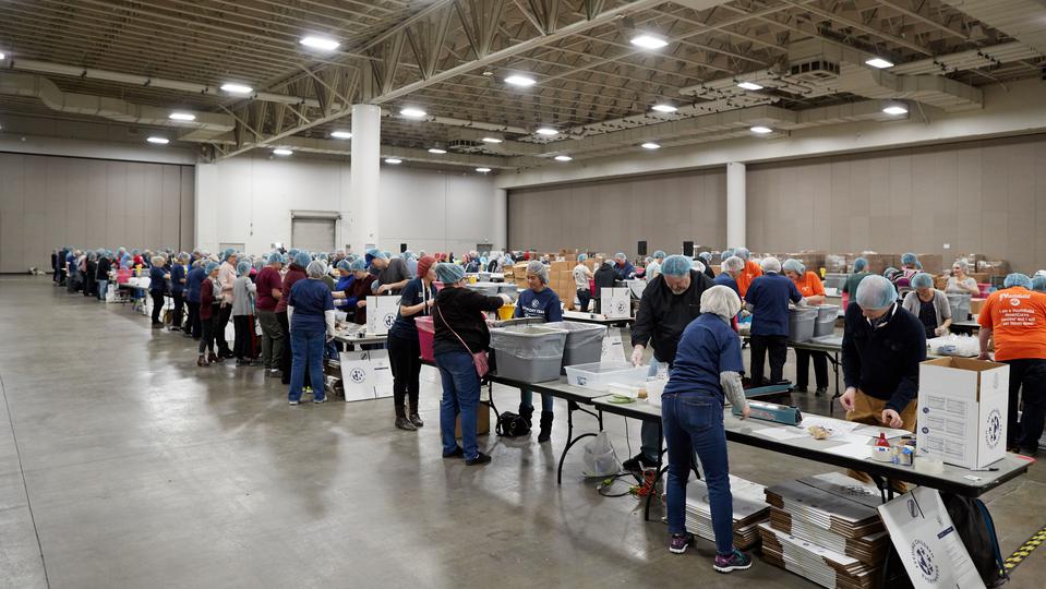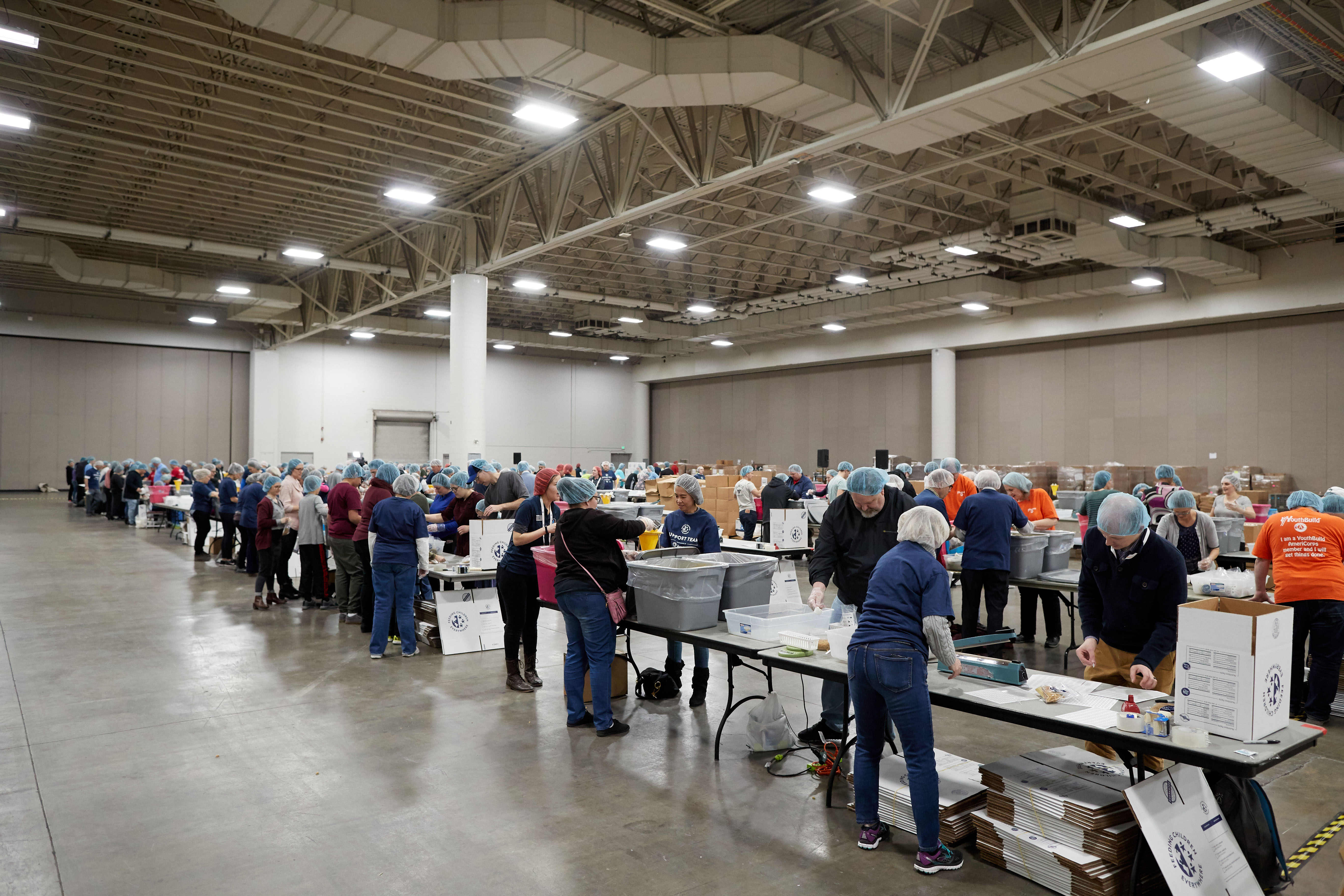 More than 5,000 volunteers showed up at the convention center and put on their hair nets and gloves to help fill the food kits and place them in boxes for delivery.