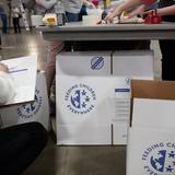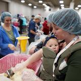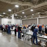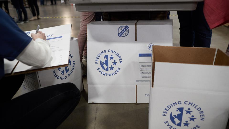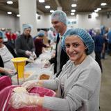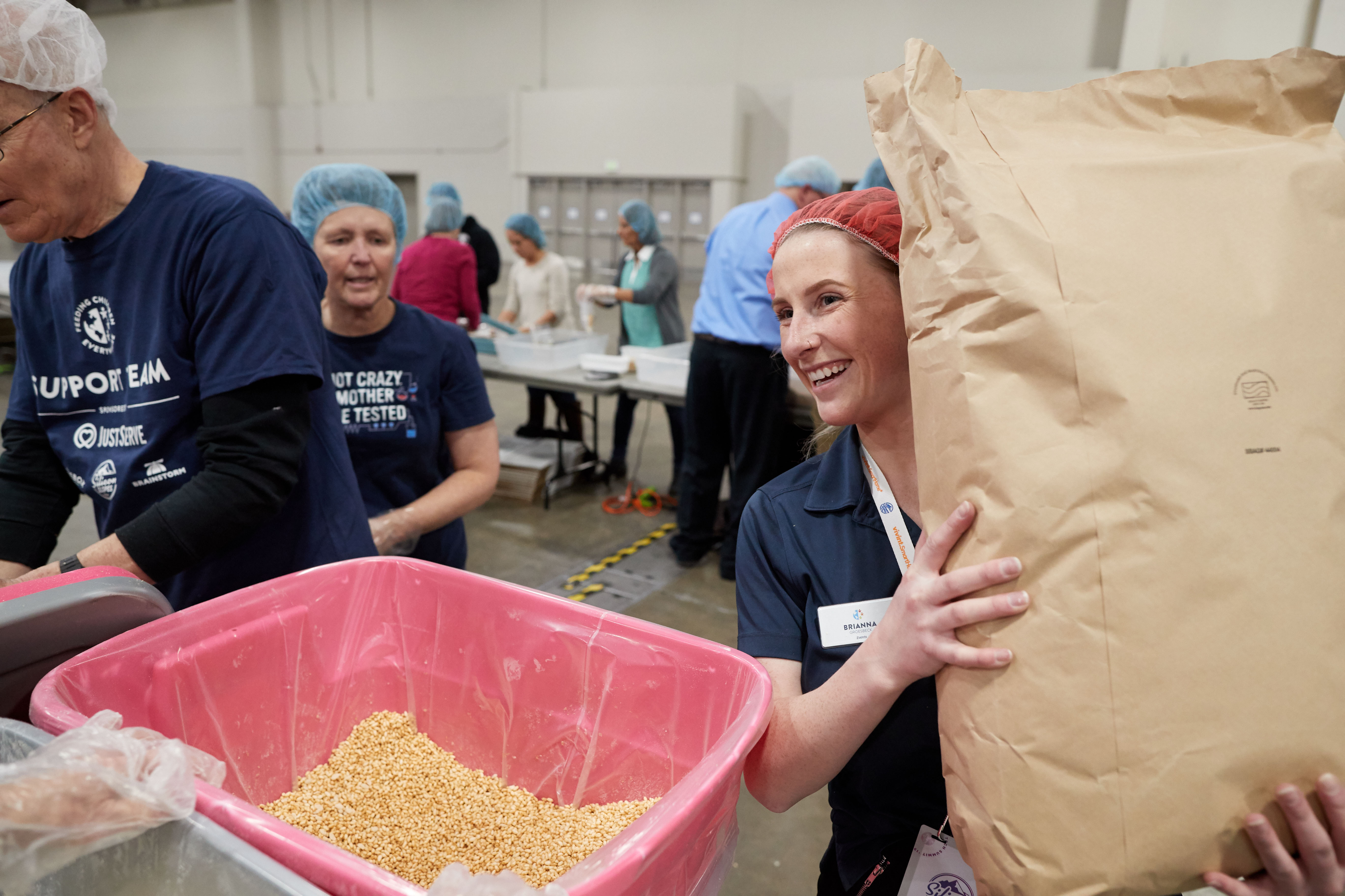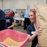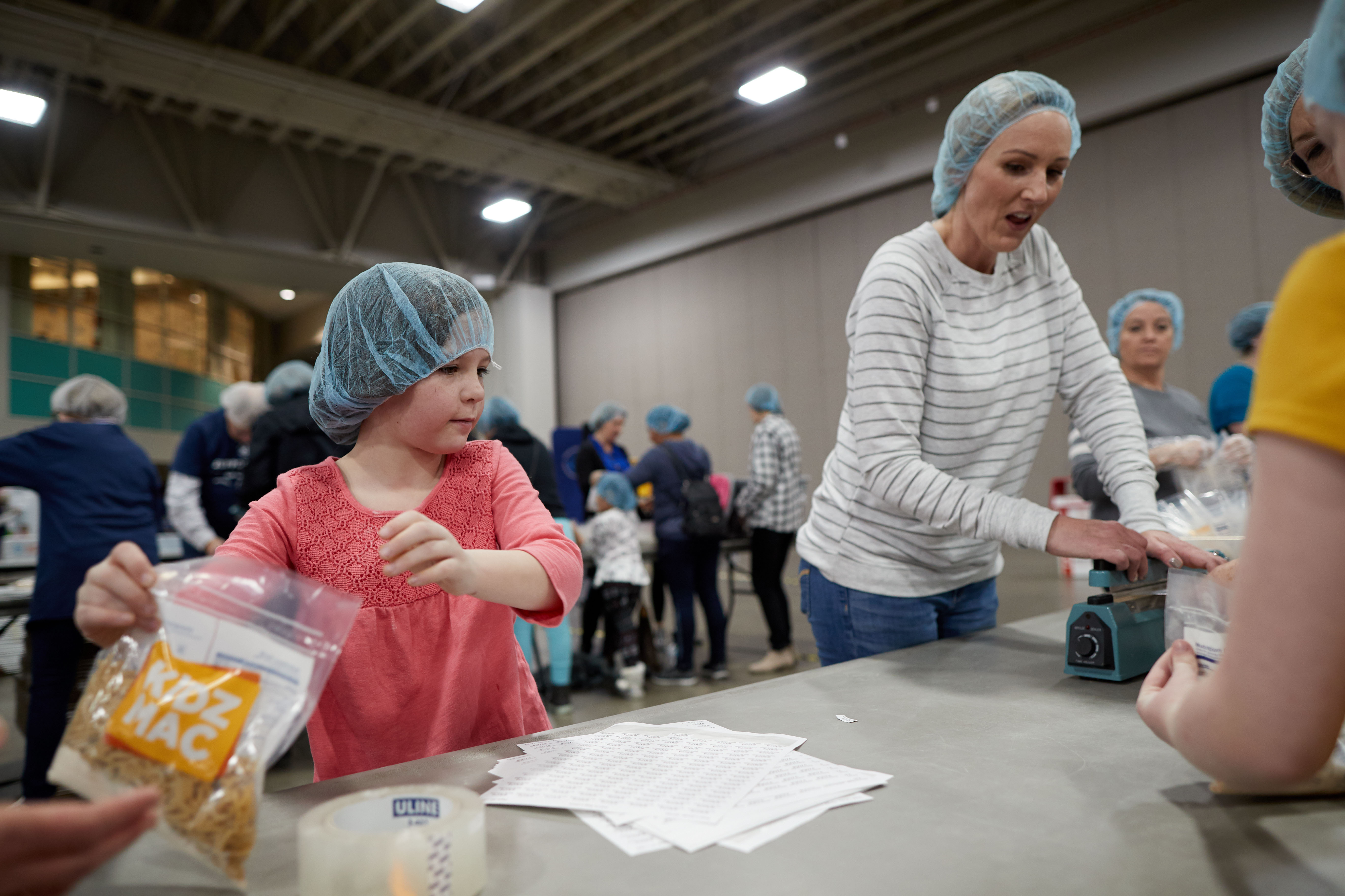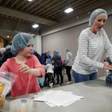 More than 5,000 volunteers showed up at the convention center and put on their hair nets and gloves to help fill the food kits and place them in boxes for delivery.