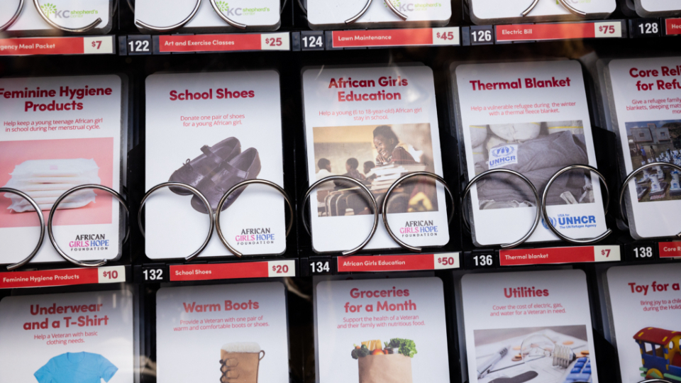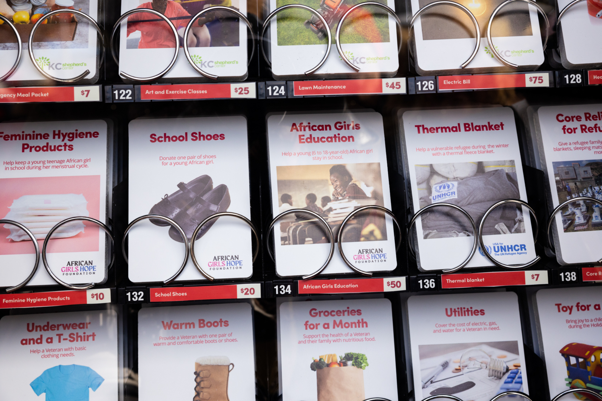 Giving Machines include items such as groceries, fresh water, child vaccines, beds, hygiene kits, farming equipment, medical care, job training, educational supplies, beehives and livestock.