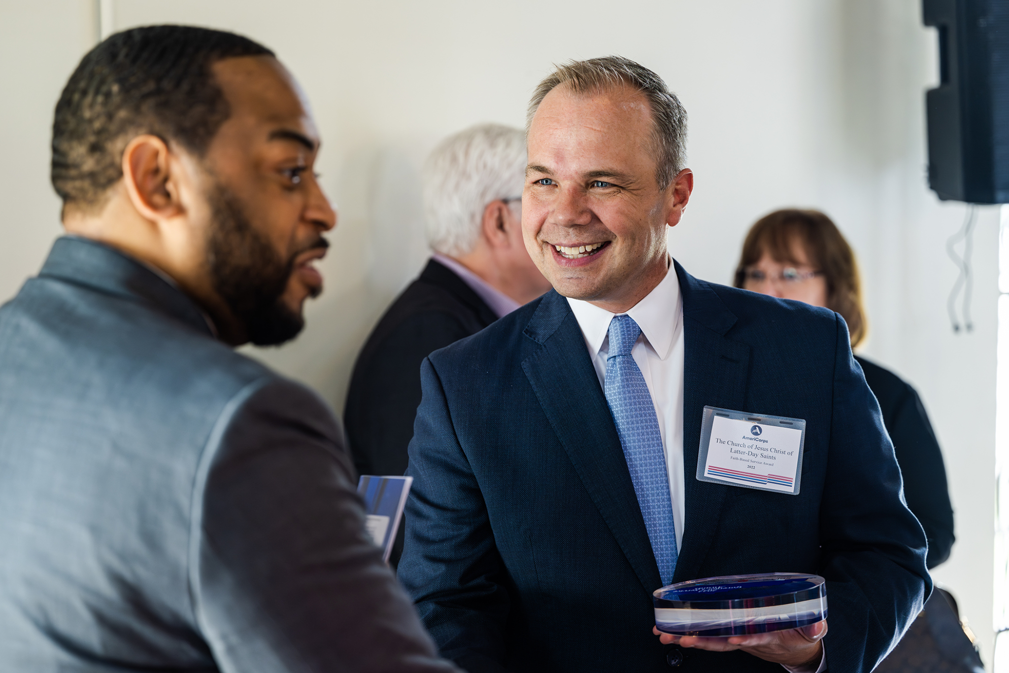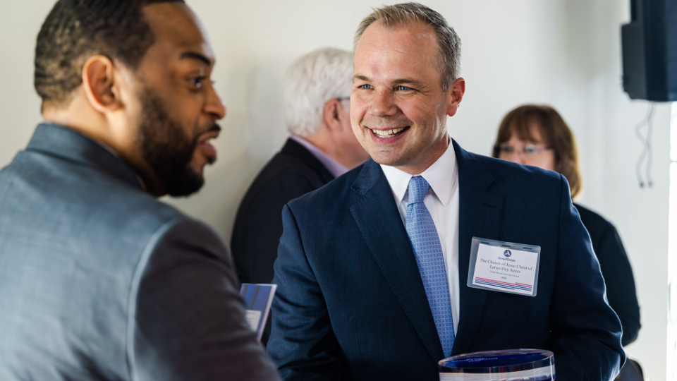 Elder Nathan A. Craig of the Seventy (right) speaks with Charles Booker, head of Kentucky’s Governor’s Office of Faith-Based Initiatives and Community Involvement, on Wednesday, May 17, 2023, at the Mellwood Art Center in Louisville.2023 by Intellectual Reserve, Inc. All rights reserved.In addition to honoring the Church of Jesus Christ, Gov. Beshear handed out eight other group awards and 10 individual awards.