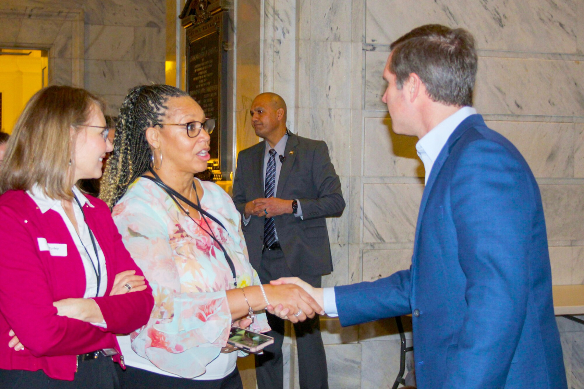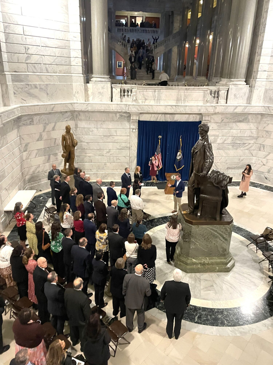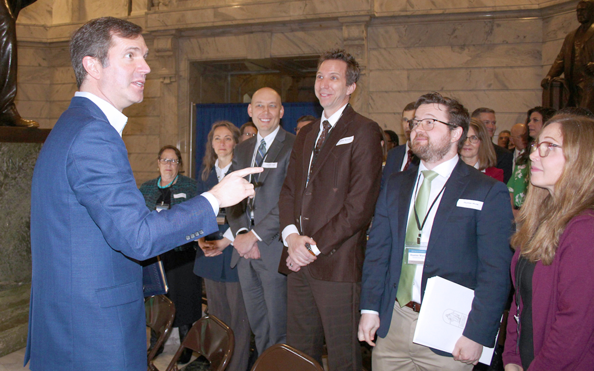 Kentucky Governor Andy Beshear speaks to the Latter-day Saint delegation in the rotunda of the state capitol building, Frankfort, Kentucky, February 16, 2023.