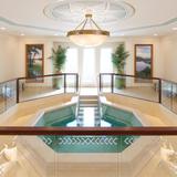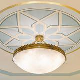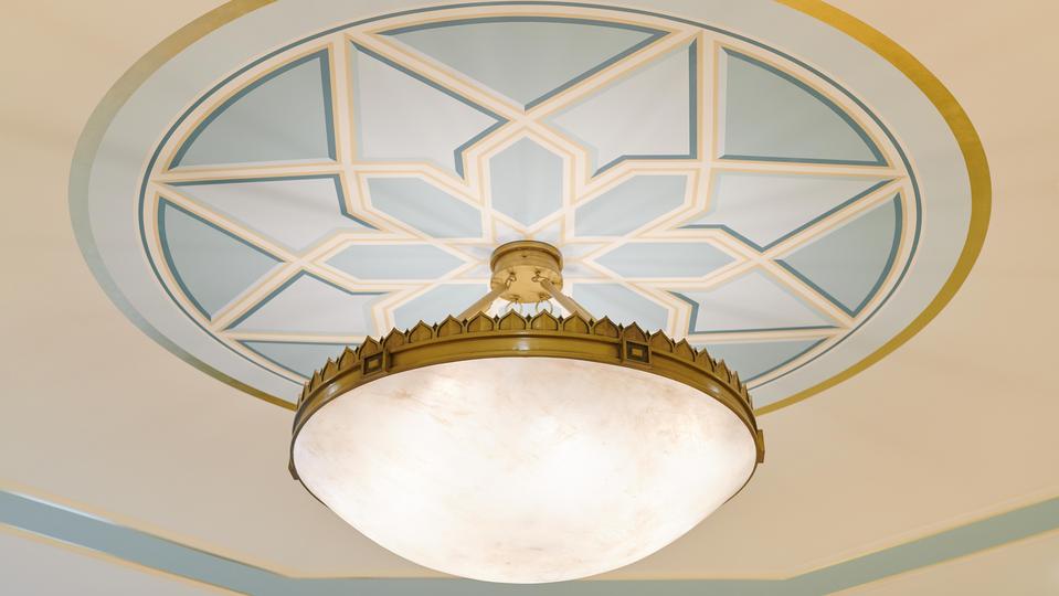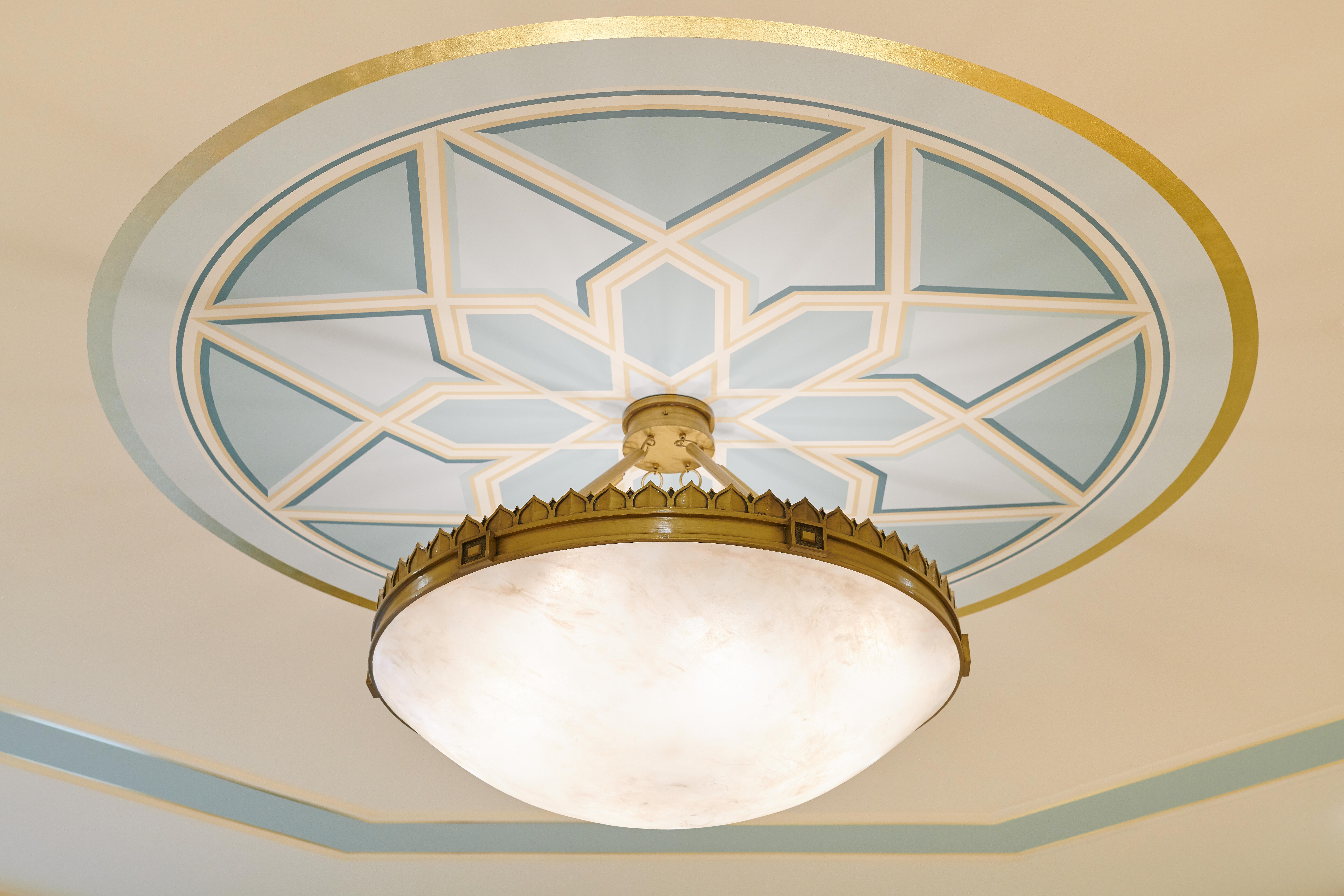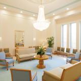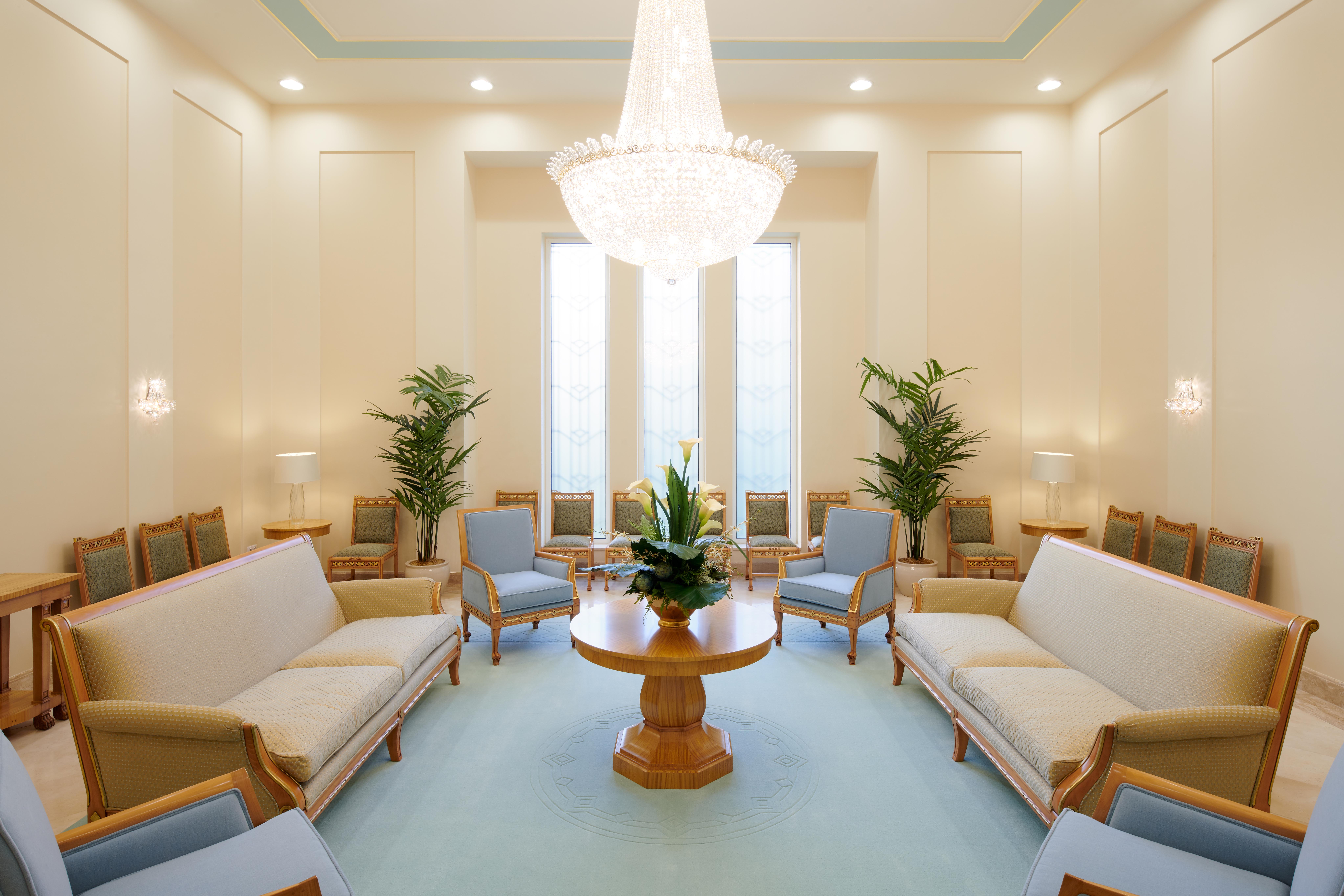 The sacred edifice located in the Quartier Bosoko, Ngaliema, area of Kinshasa is situated on nearly five acres. Stone from Egypt and porcelain tile from South Africa cover the floors of the building, which is over 12,000 square feet. The interior design features a subtle elegant geometric and diamond motif. Landscaping offers a vibrant array of local flora in contrast to the white plaster exterior and zinc roof.