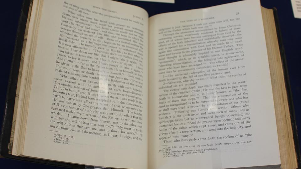 The exhibit includes Elder Talmage’s lecture outlines and pages from his original handwritten manuscript, as well as a first edition of Jesus the Christ, a 1963 edition and Dutch and Russian editions. The Dutch edition was one of the first languages to be translated after the book was released in English. The book has been translated into 15 languages as well as in Braille.