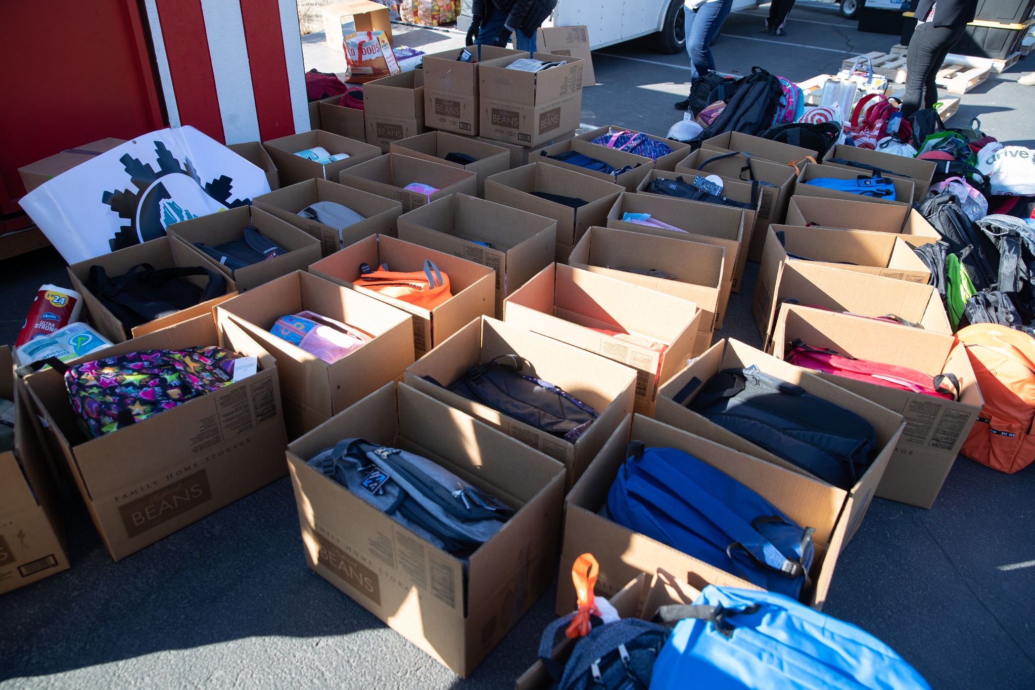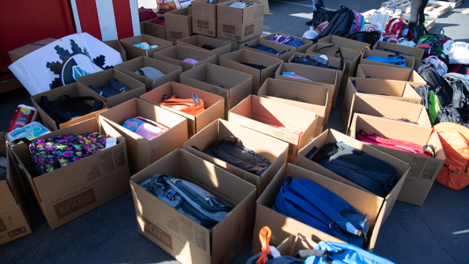 The donated items include new backpacks, crayons, binders, notebooks, toilet paper, canned food and soap.