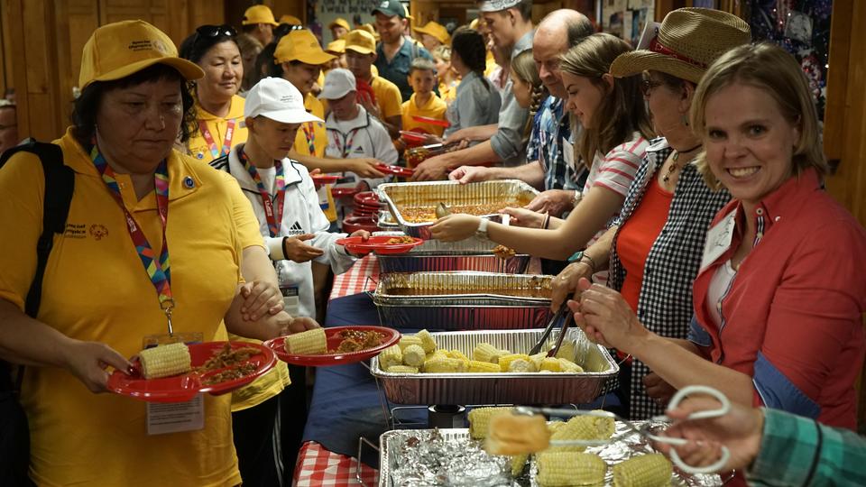 Mormon volunteers provided athletes with opportunities to experience various cuisines, rope a cow with the help of a cowboy, pan for gold, wear a lei as they dined at a real Hawaiian luau and get their picture taken as if their faces were the ones on Mt. Rushmore in South Dakota.