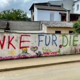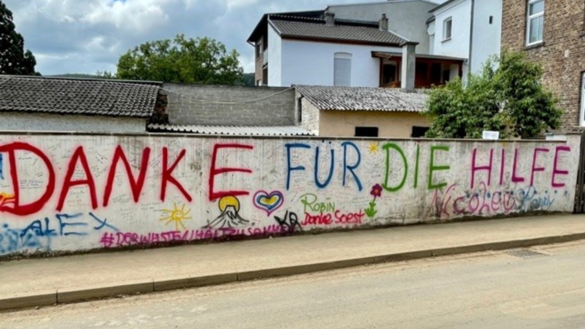Graffiti in Germany thanking helpers for their support after the floods, July 2021.2021 by Intellectual Reserve, Inc. All rights reserved.Together with local authorities, Latter-day Saints sorted donations and emptied cellars, houses and schools.