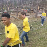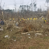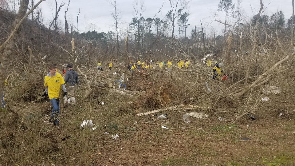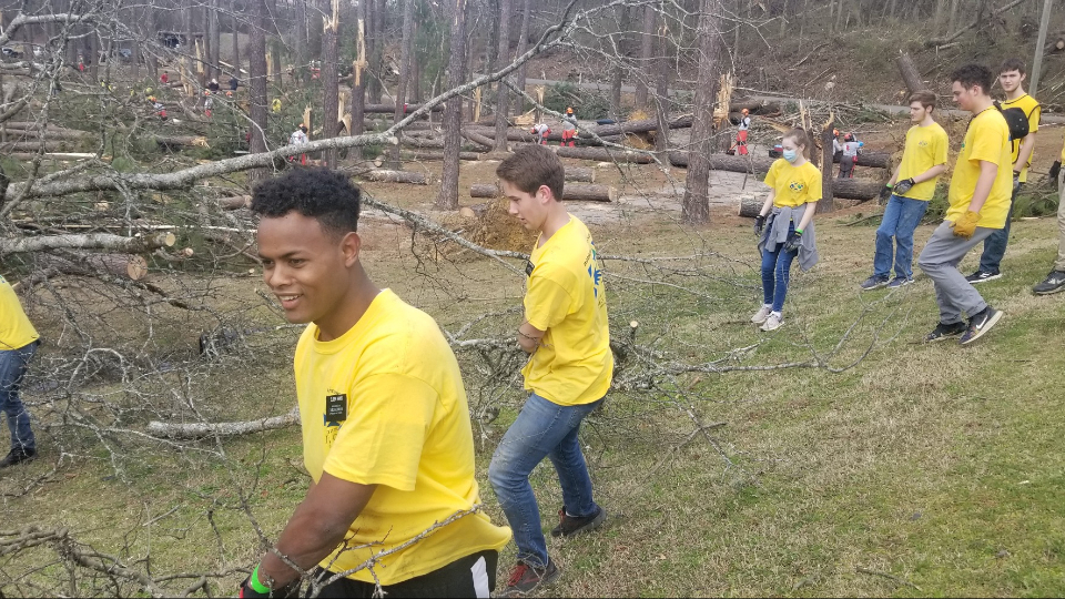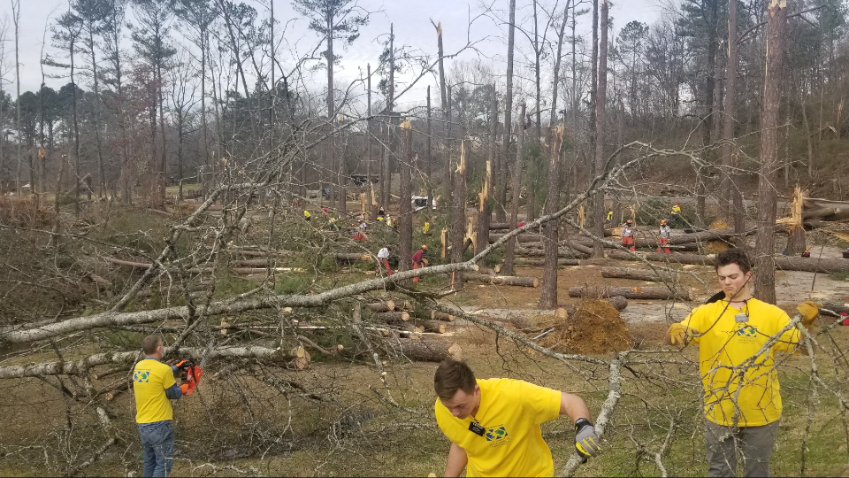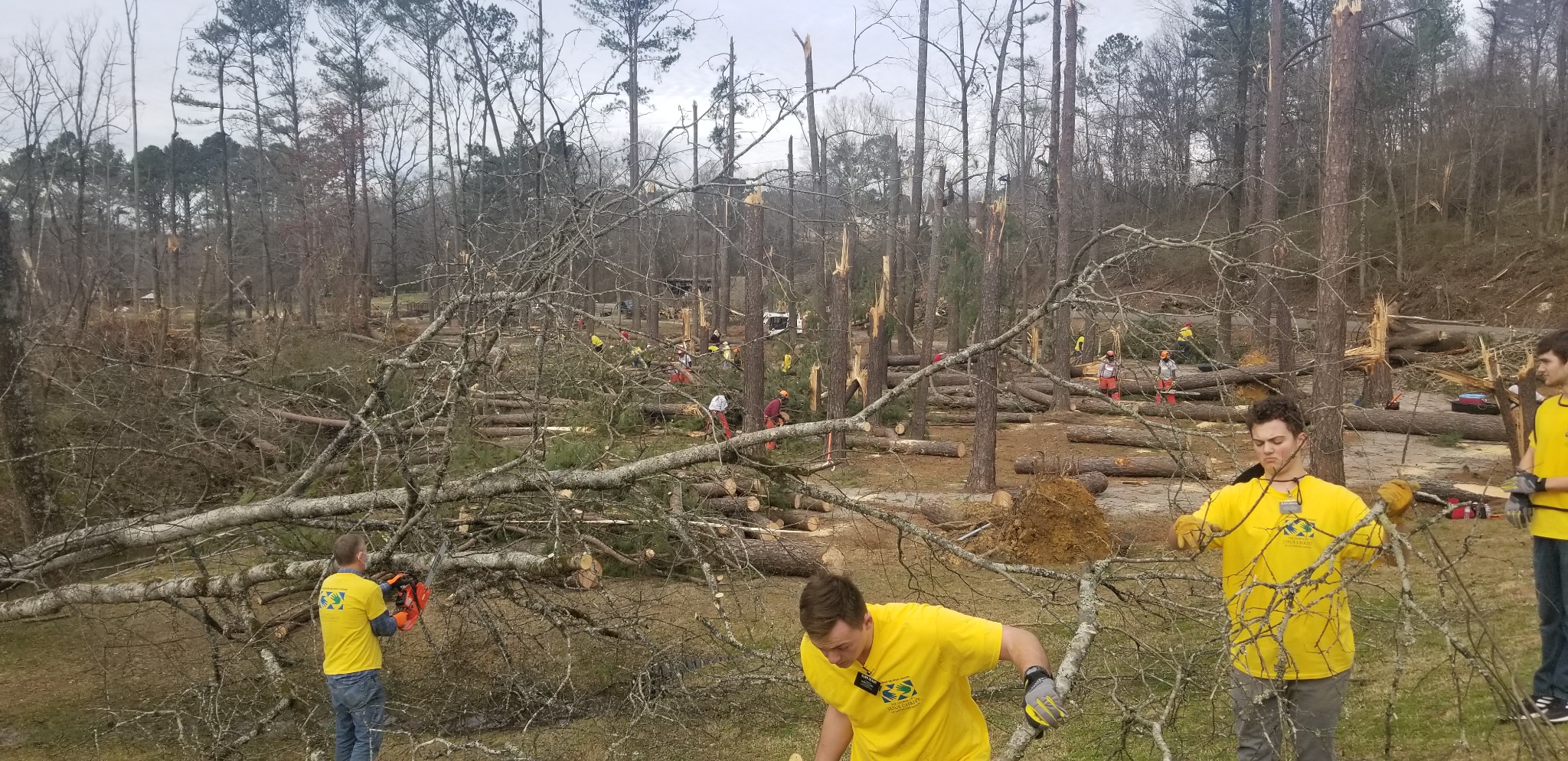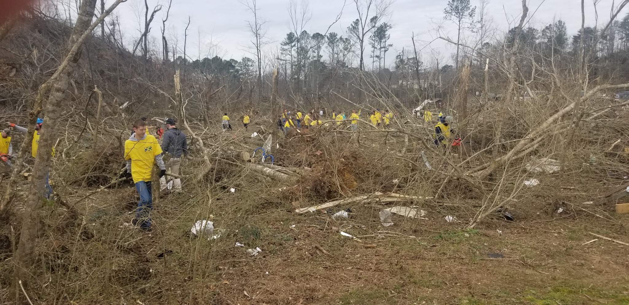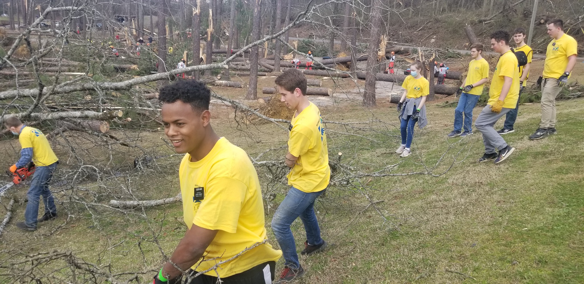 More than 100 Latter-day Saints, dressed in yellow Helping Hands t-shirts, cleaned up fallen trees and debris caused by an F-3 tornado in Alabama on Tuesday, January 26, 2021.