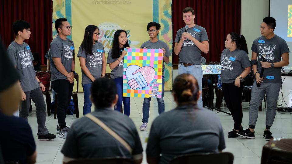 More than 100 young adults, 18 years old and older, from various religious faiths gathered to participate in an interfaith youth peace camp during World Harmony Week in a Latter-day Saint meetinghouse.