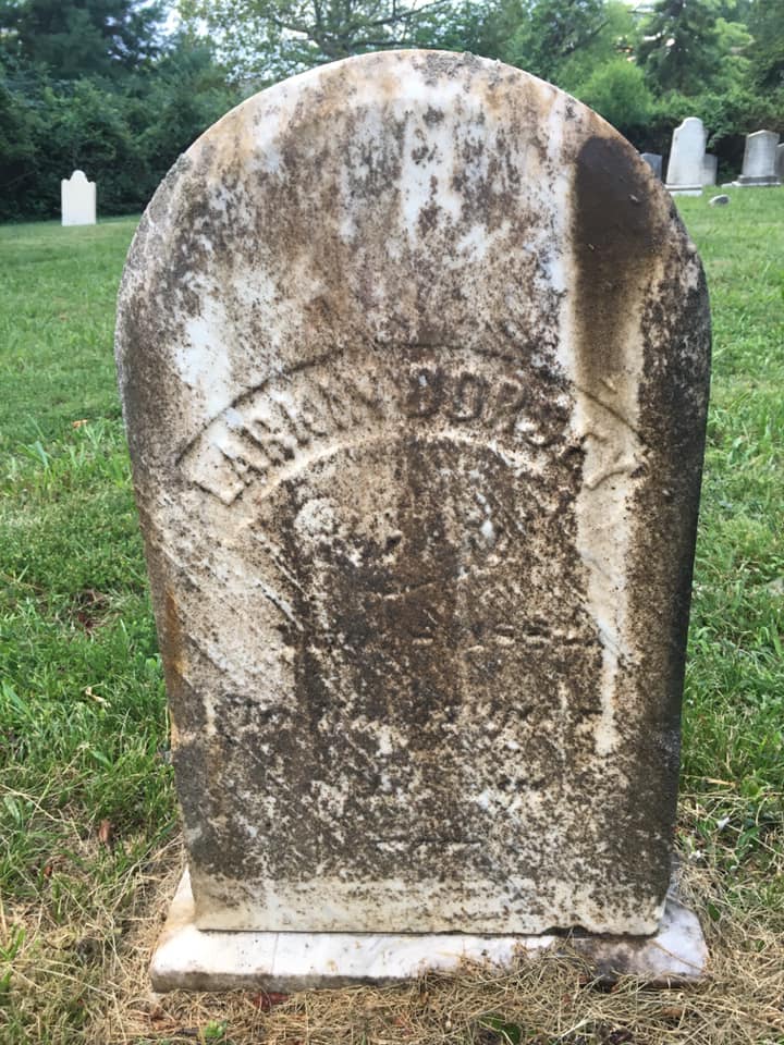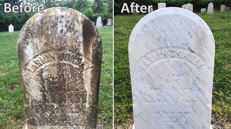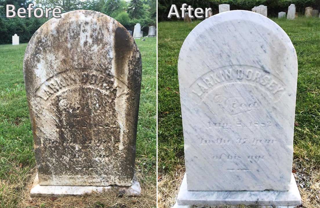 The results from the restoration efforts of community volunteers are documented in 'before' and 'after' photographs of a 138-year-old headstone at the Dorsey-Owings-Waters Cemetery in Columbia, Maryland. The stone reads: Larkin Dorsey, Died Aug. 8, 1882, In the 38 year of his age.© 2020 by Intellectual Reserve, Inc. All rights reserved.United States: Debris Cleared and Headstones Restored at Local Cemetery
