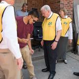 Elder M. Russell Ballard and Elder Ronald A. Rasband of the Quorum of the Twelve Apostles traveled from Utah to Houston, Texas, to provide encouragement to the hundreds of Mormon Helping Hands volunteers who continue to help residents impacted by the hurricane that hit the region at the end of August. They were joined by Elder S. Gifford Nielsen of the Seventy; Sister Cristina B. Franco, second counselor in the Primary general presidency; and area leaders.