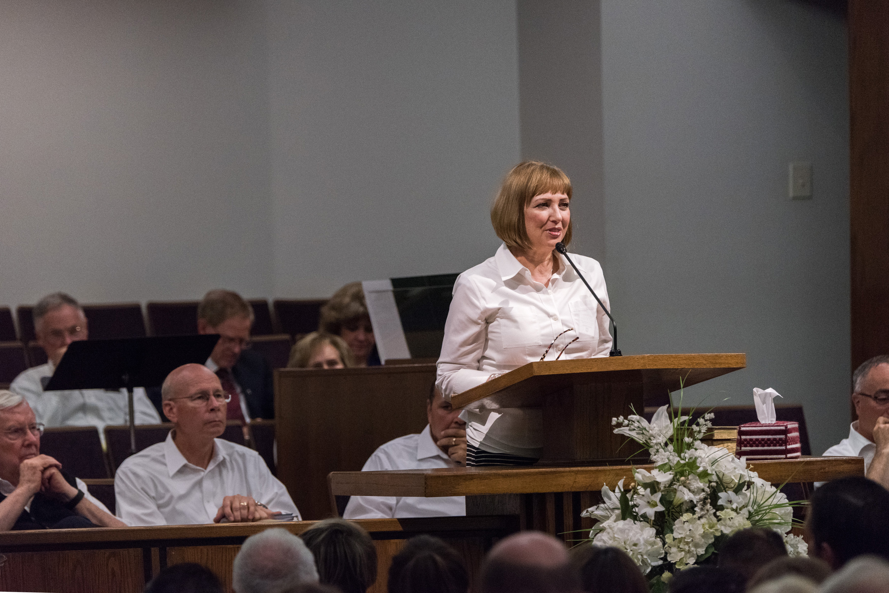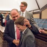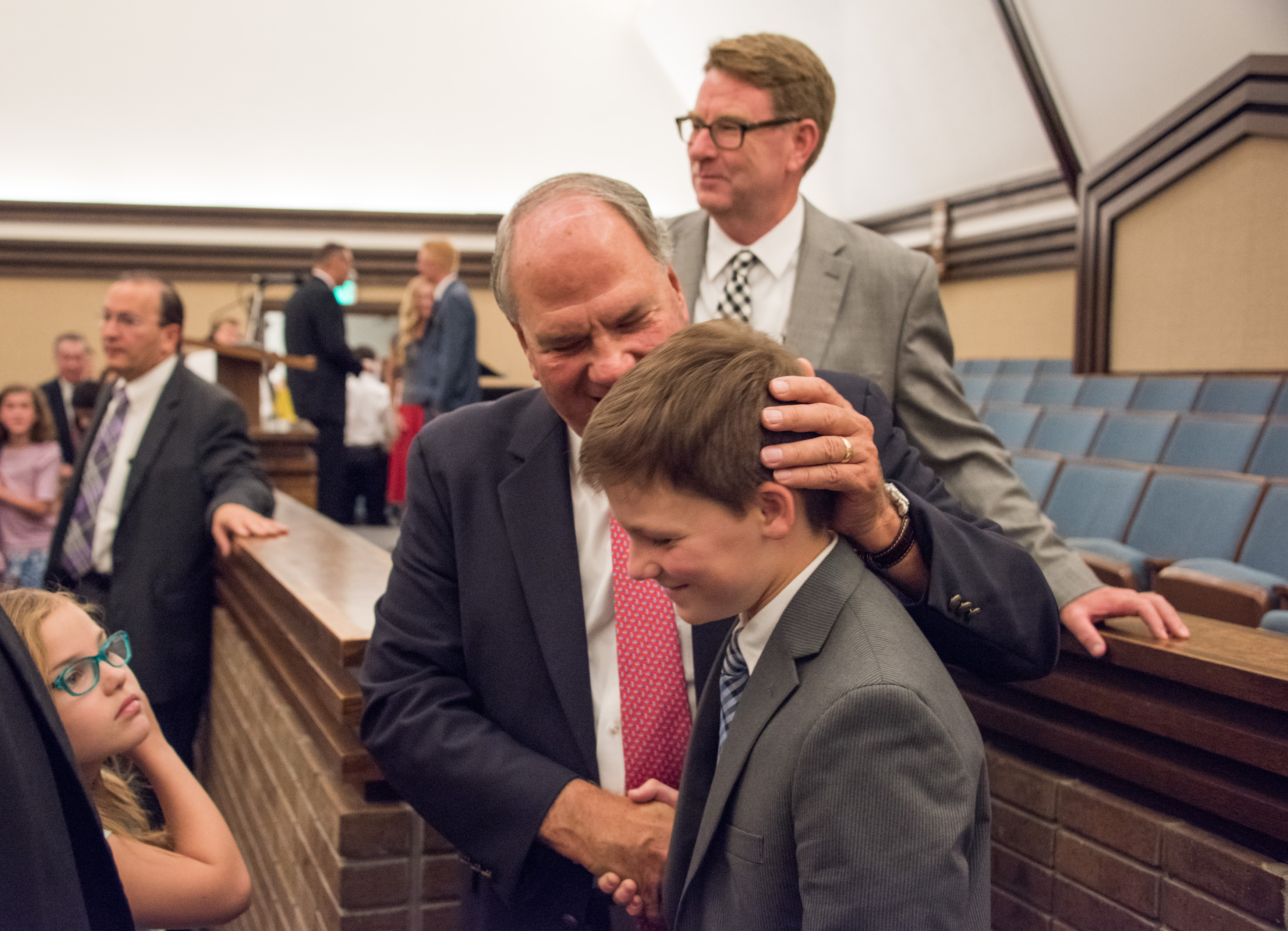 President Dieter F. Uchtdorf of the First Presidency of The Church of Jesus Christ of Latter-day Saints traveled to Houston, Texas, Sunday, September 3, 2017, to meet with members and tour areas impacted by Hurricane Harvey. President Uchtdorf, second counselor in the First Presidency; Bishop Gérald Caussé of the Presiding Bishopric; and Elder J. Devn Cornish of the Seventy attended a Church service with Latter-day Saints from four congregations who were affected by the flooding or assisting in the cleanup efforts.
